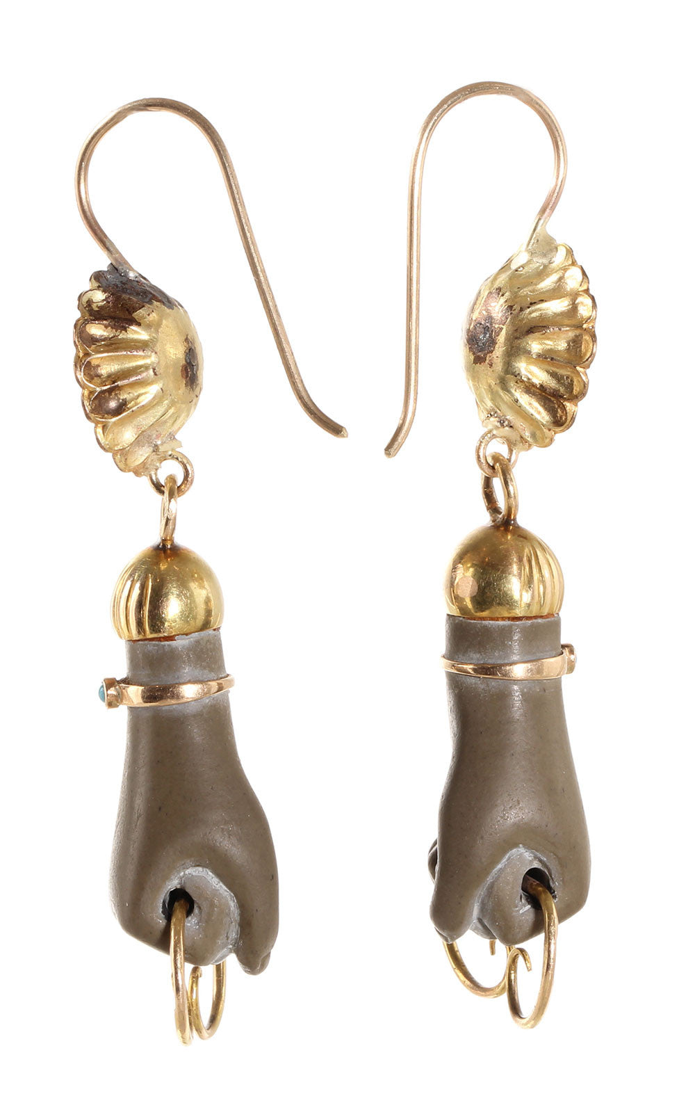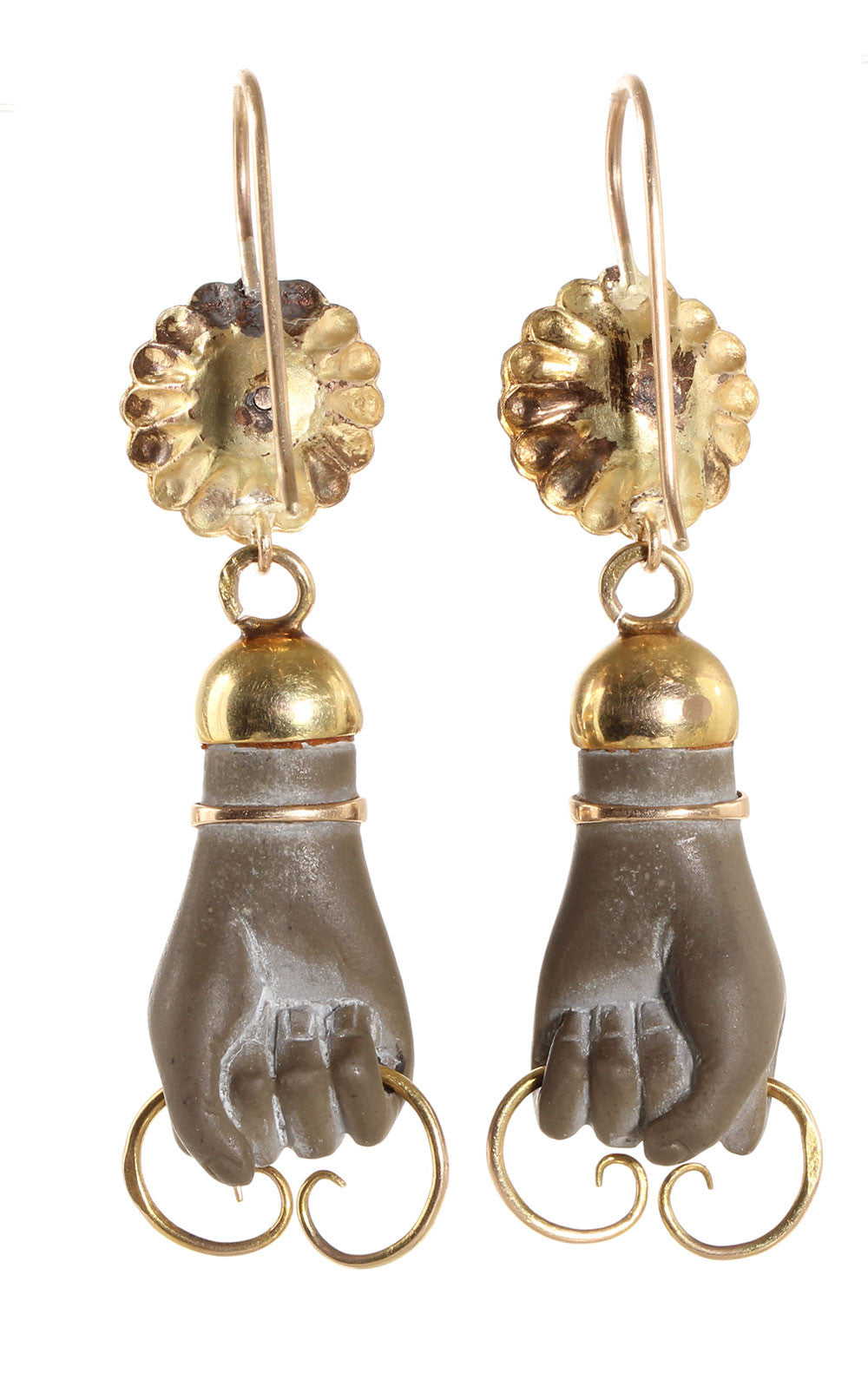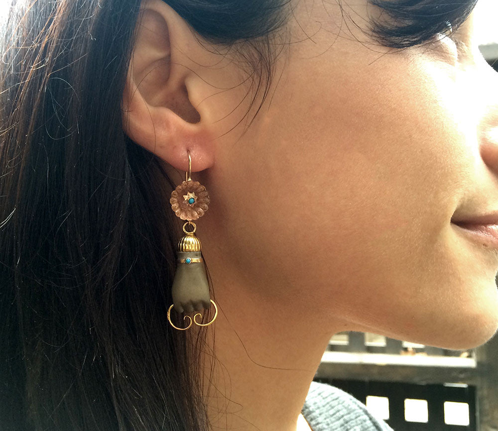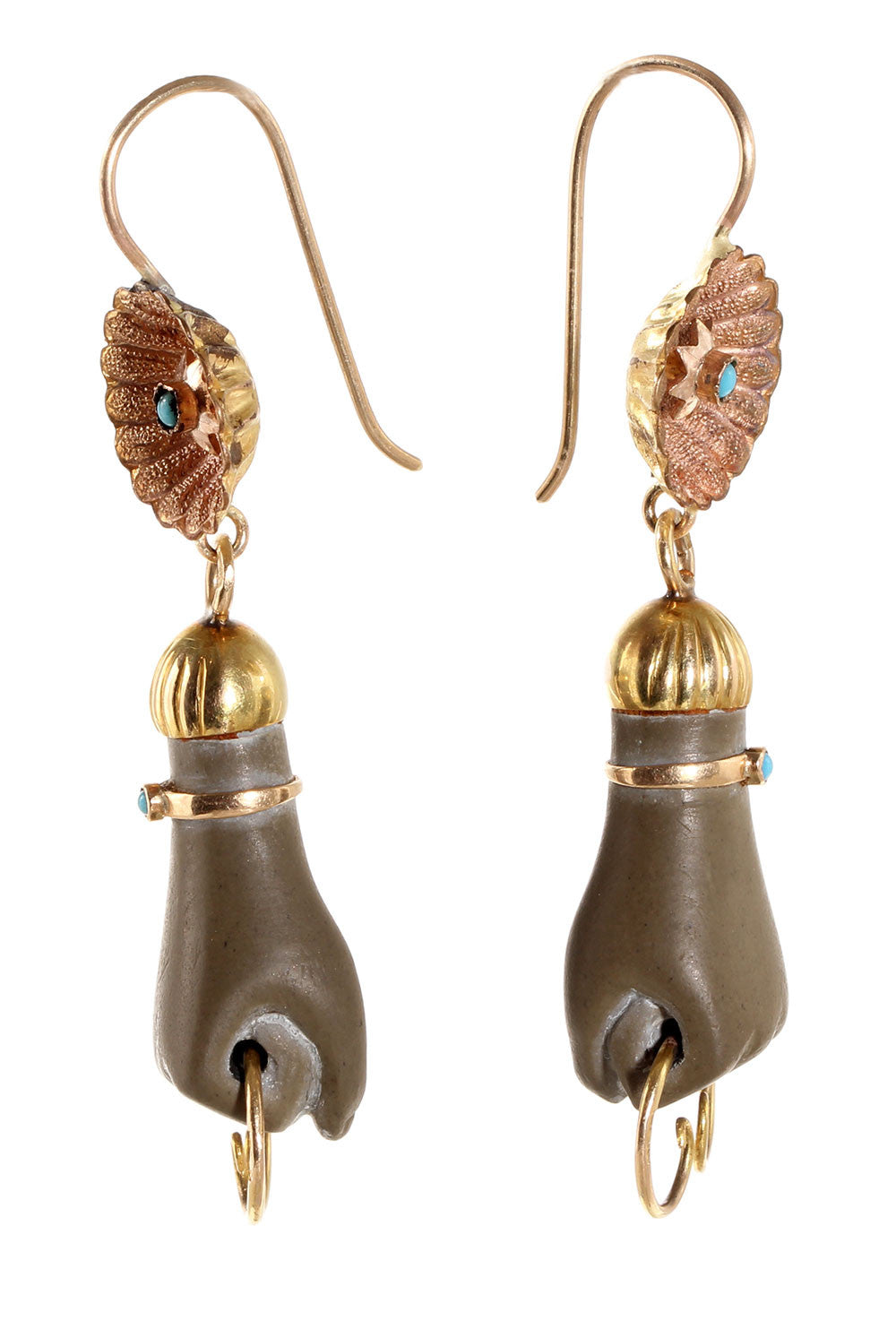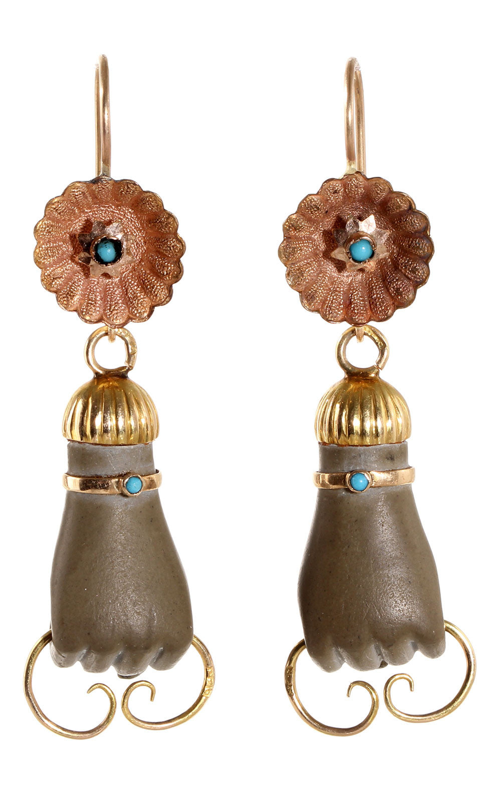 Hand carved lava hands complete with persian turquoise bangles hanging from golden flowers. The mid 19th century hands have european hallmarks and have been paired with slightly later rose gold flower tops in 14k gold.