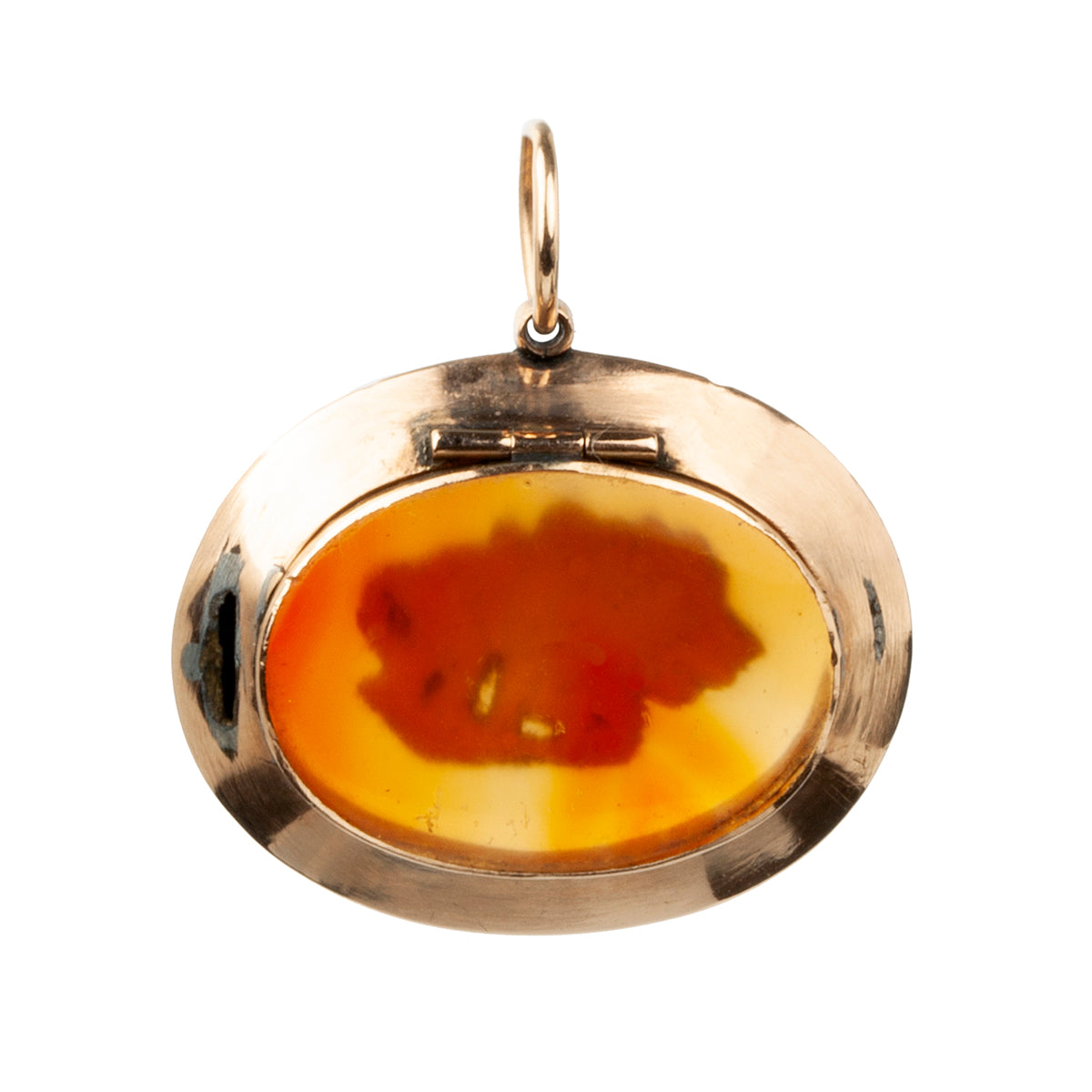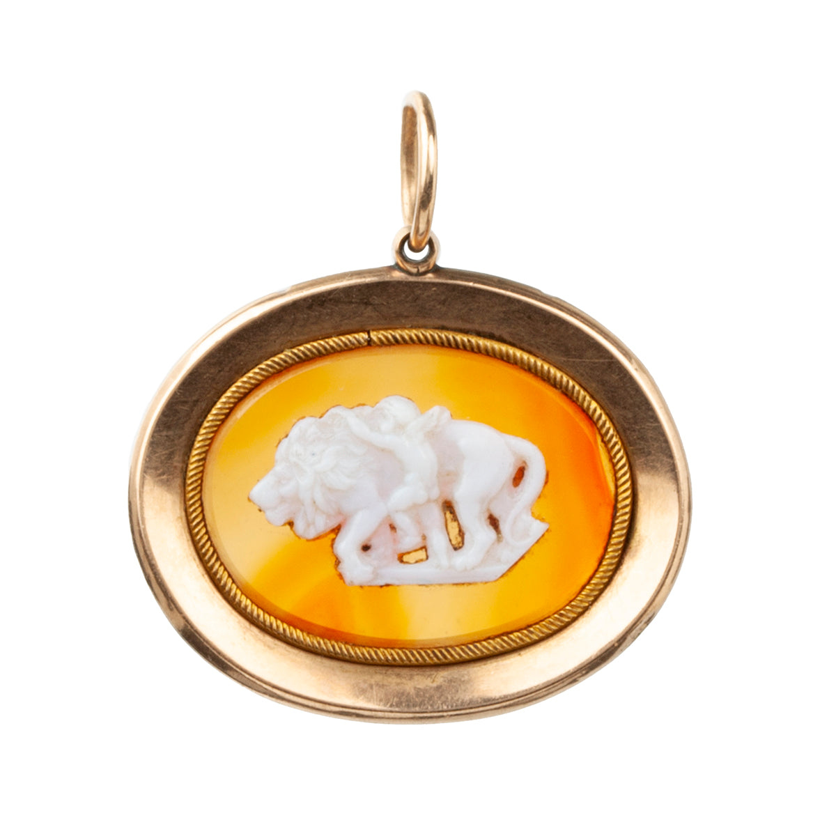 Victorian era carved cameo locket, in 15k gold. A carved lion and cherub cameo representing "Love conquers all". A locket compartment with the original crystal intact. English in origin. Circa 1840.