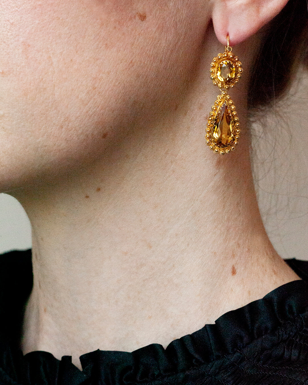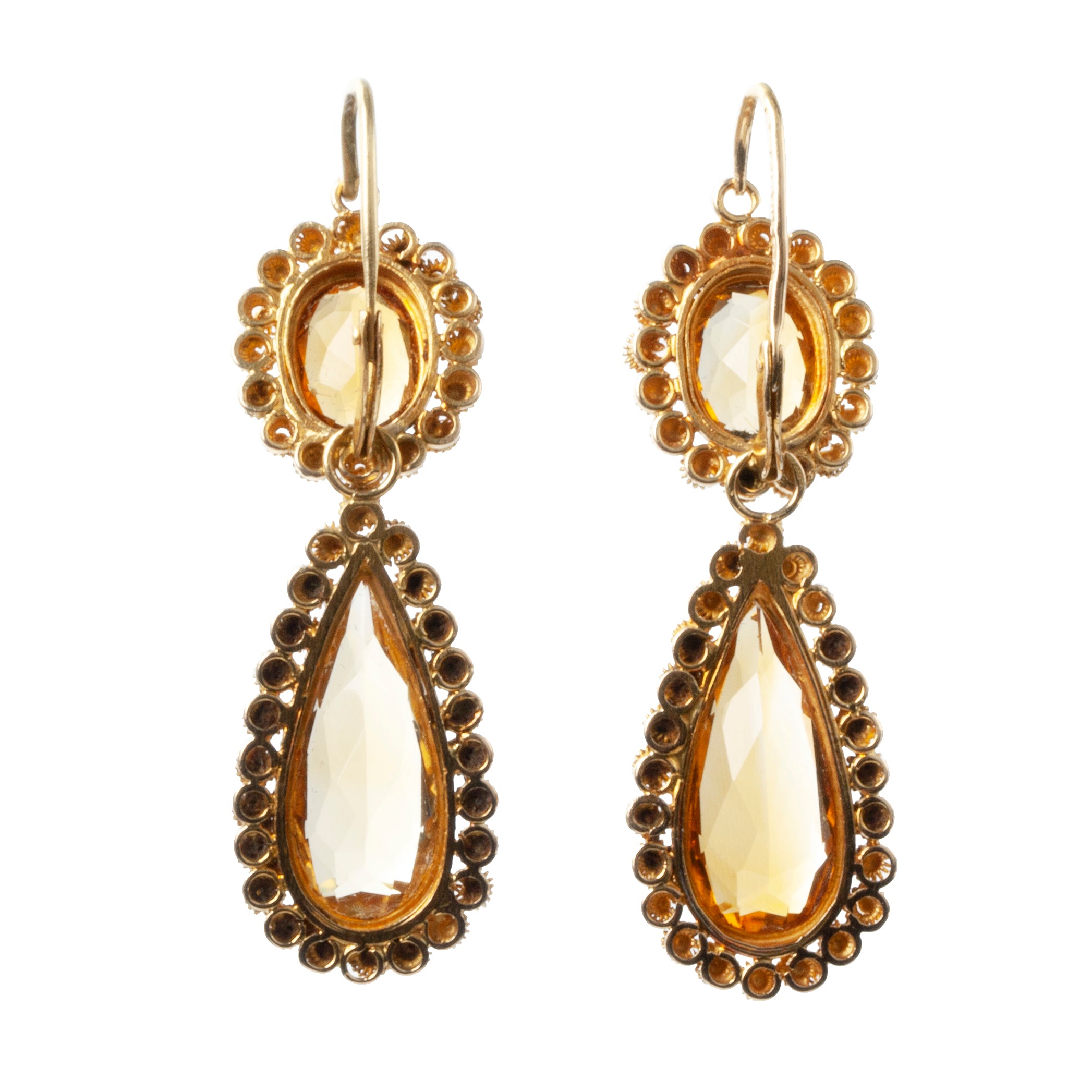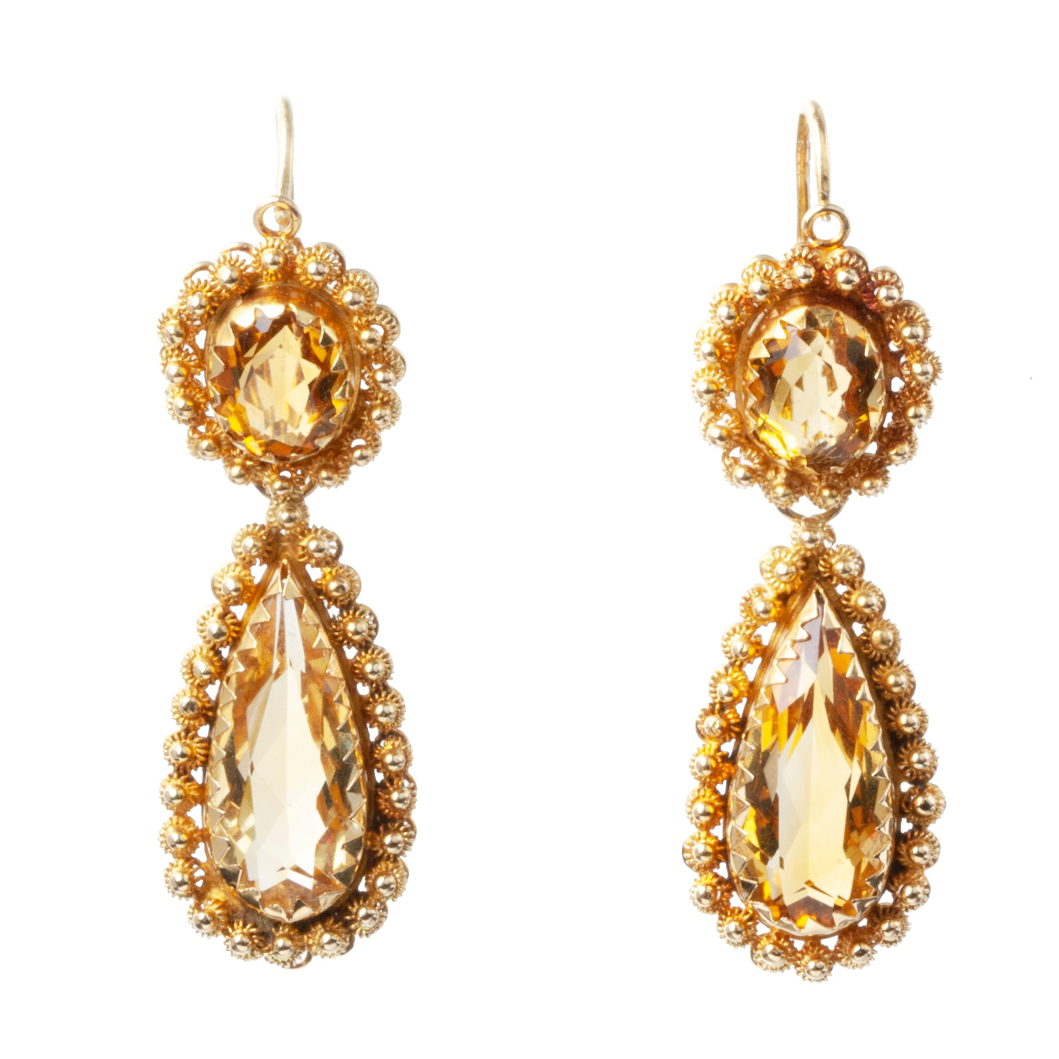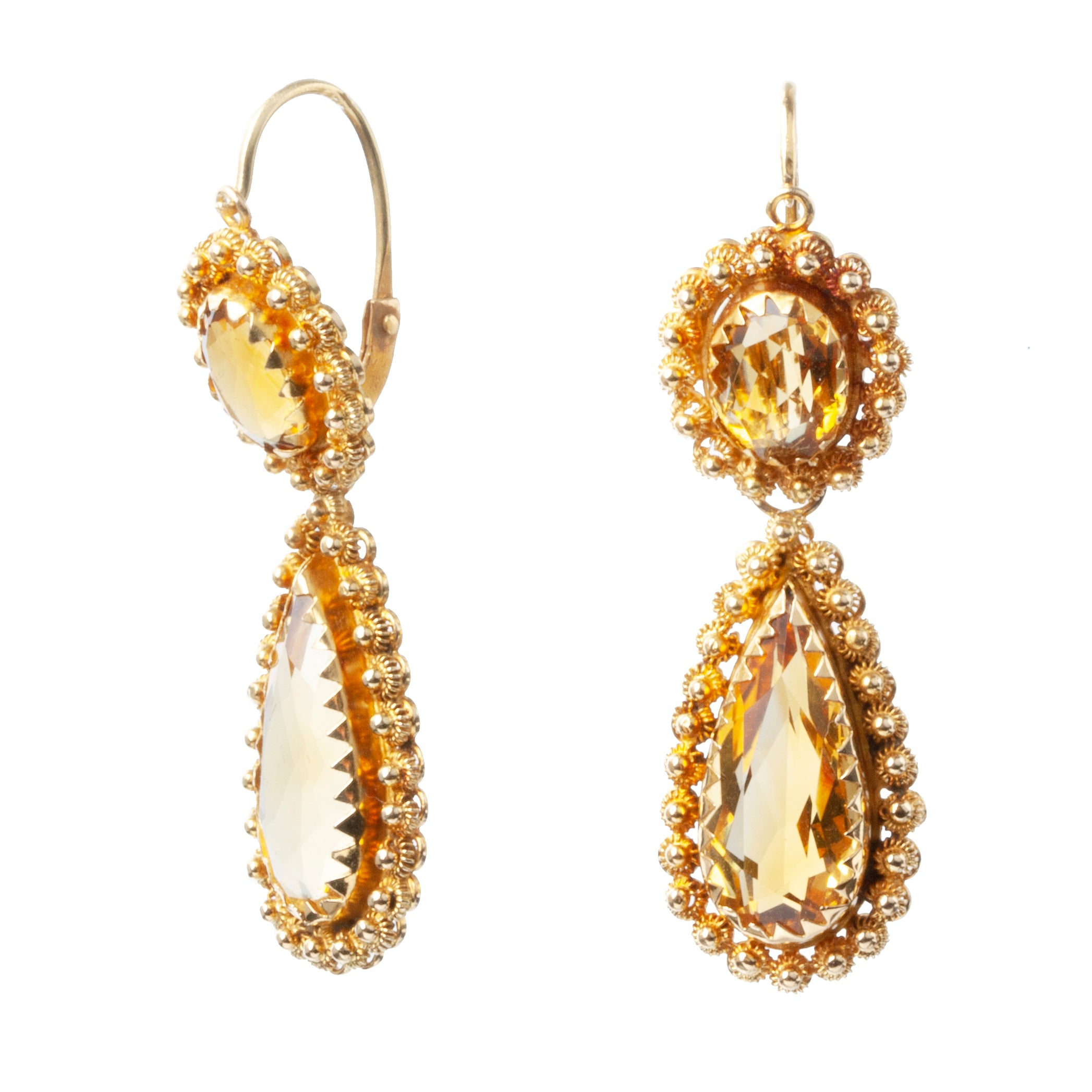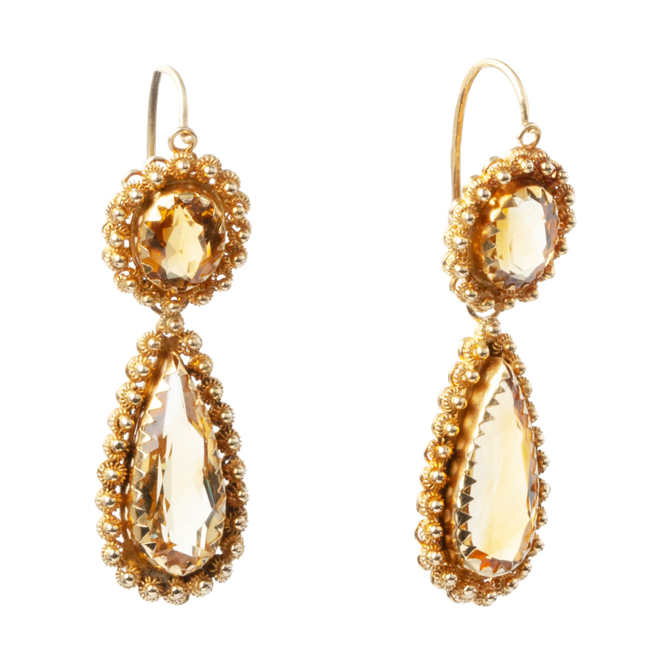 Victorian era citrine earrings. Tear drop citrine drops, in sawtooth bezel set mounts with coiled cannetille borders. Circa 1830-40, English in Origin