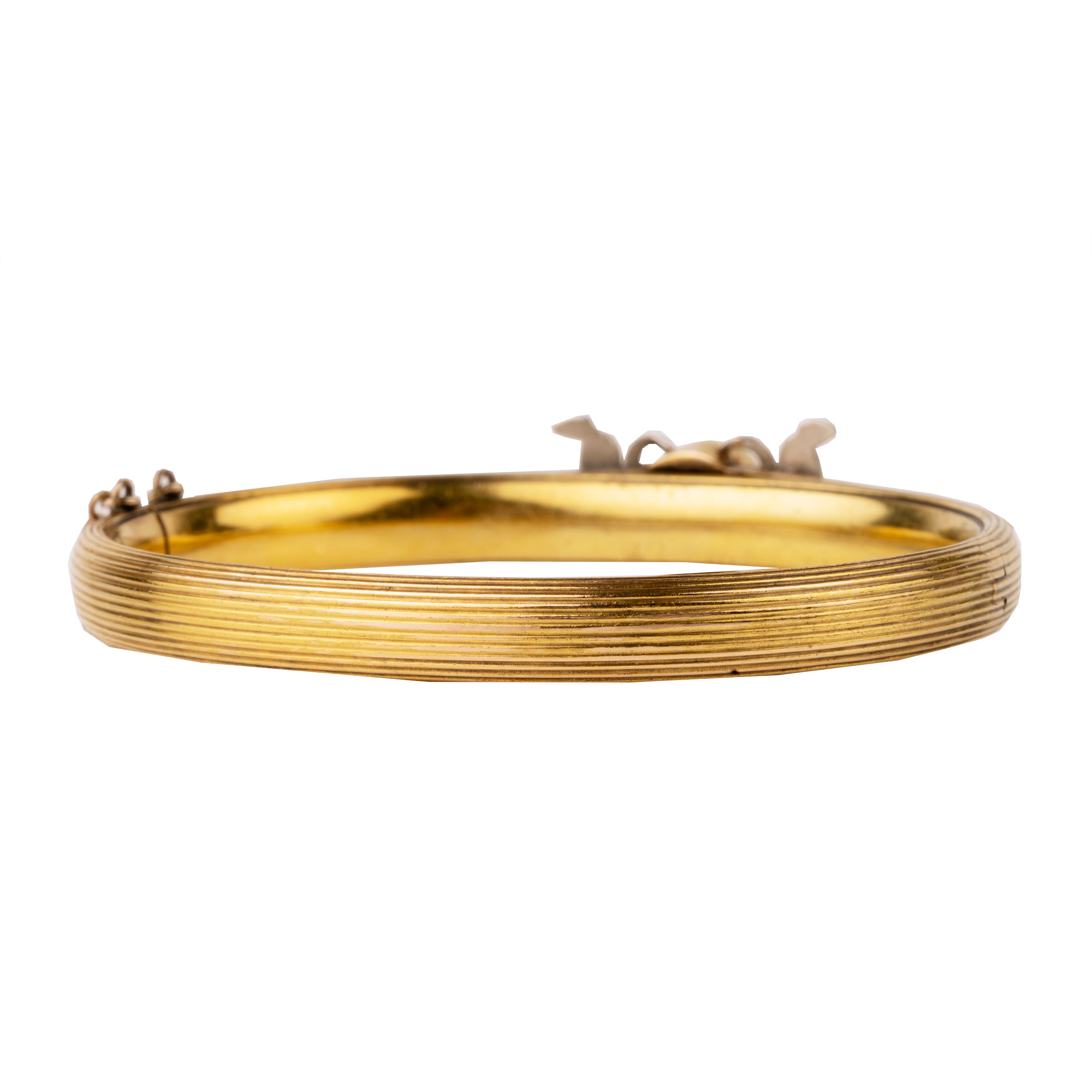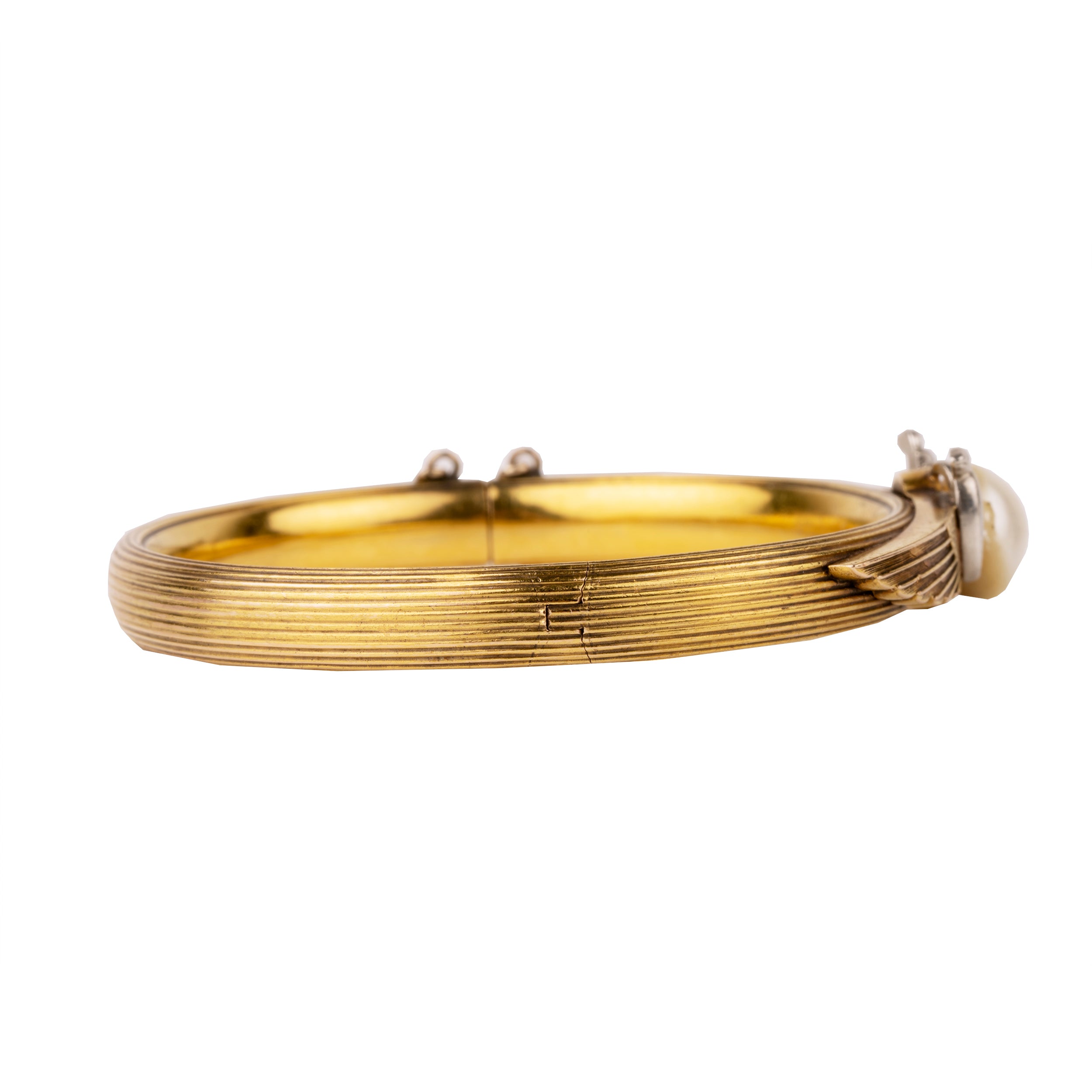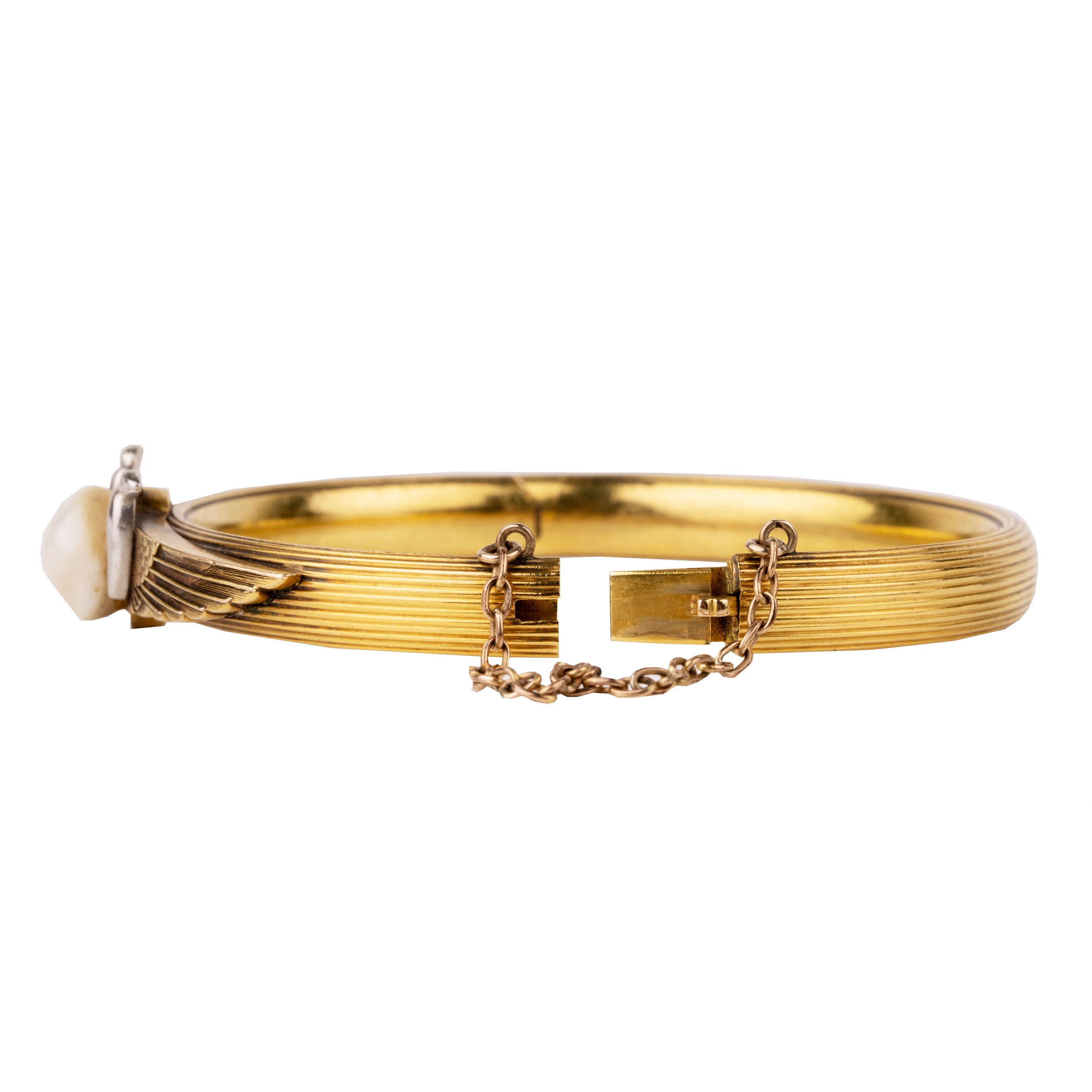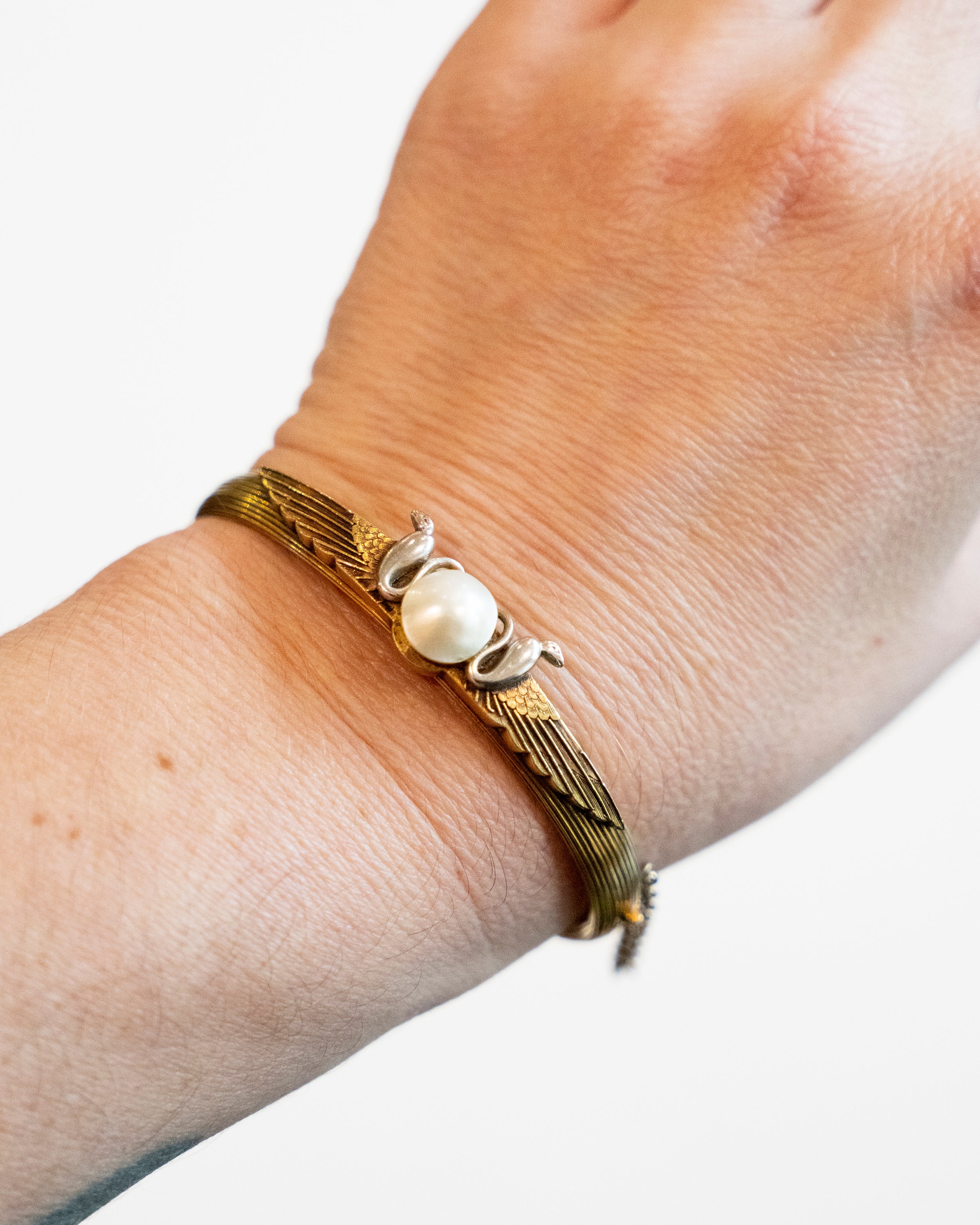 This Egyptian revival motif depicts the winged snake goddess Wadjet. It showcases a single pearl with gold and platinum details. A common motif seen in tombs from the Valley of the Kings, Wadjet represents wisdom and guidance. The bangle bracelet has a reeded detail in patinated 14k gold. Continental Europe, circa 1900.