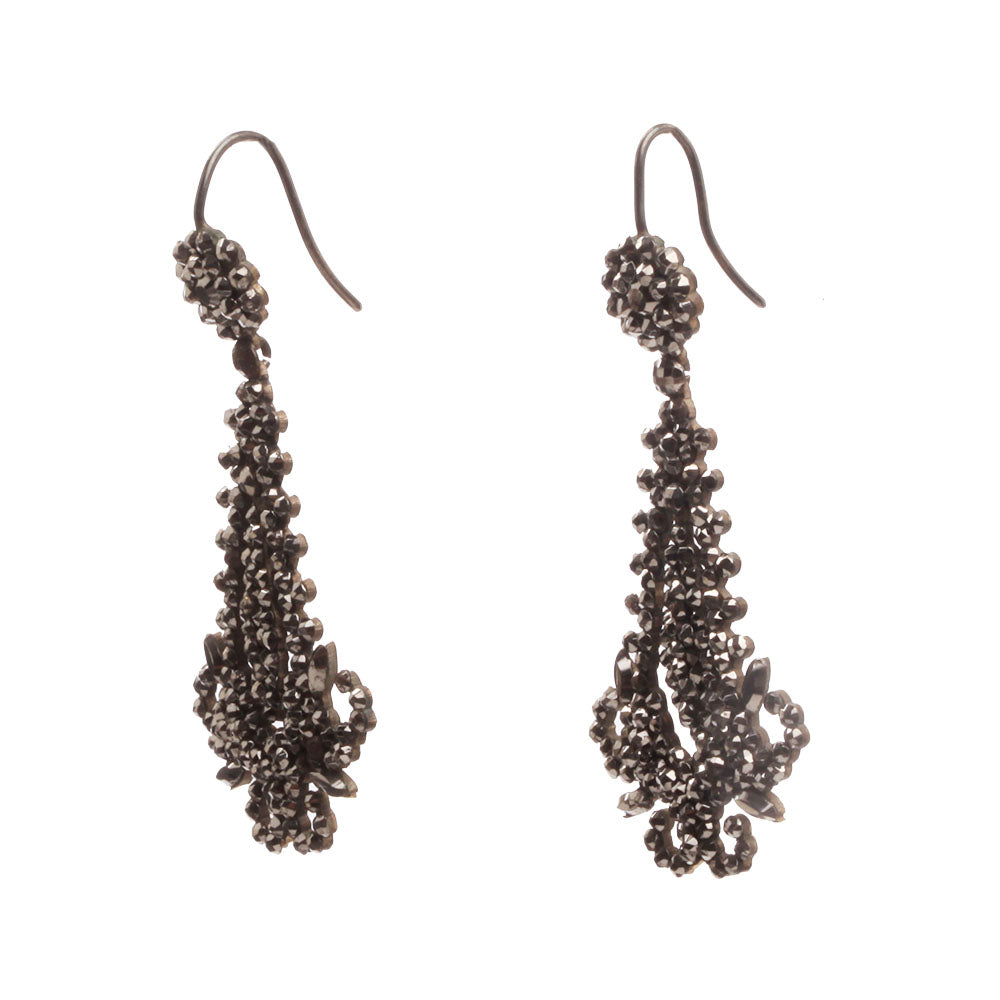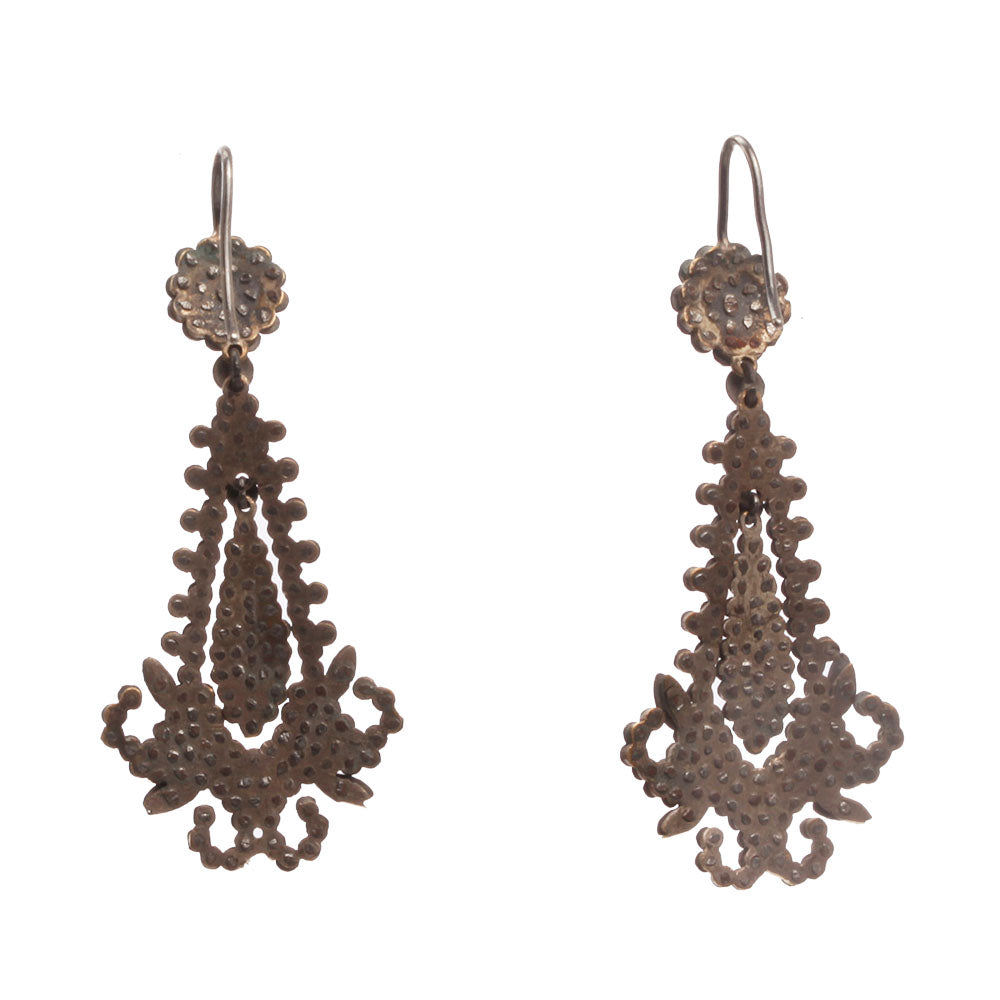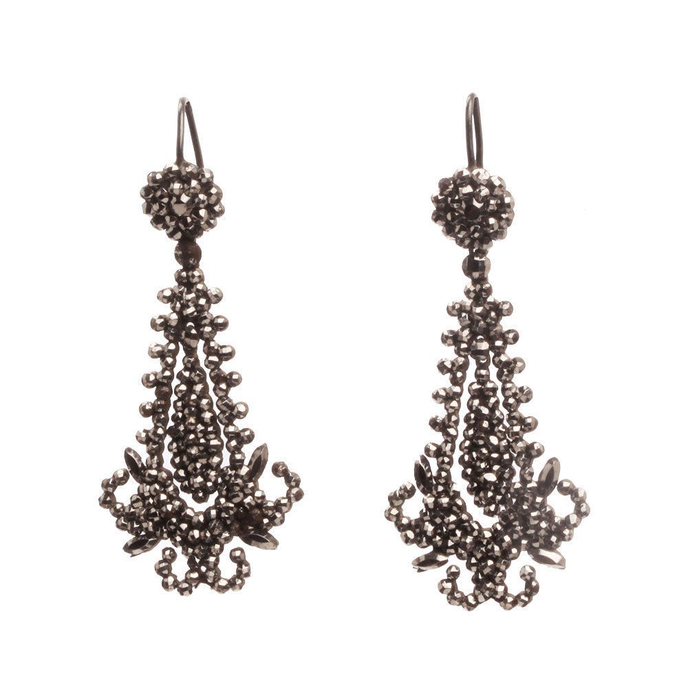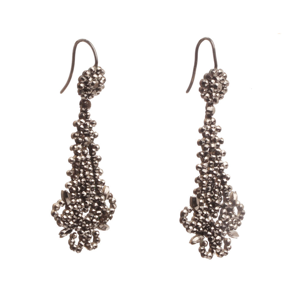 Victorian era cut steel earrings with elongated tear shaped drops. Beautifully preserved with a bright gray sparkle. English in origin. Circa 1840.