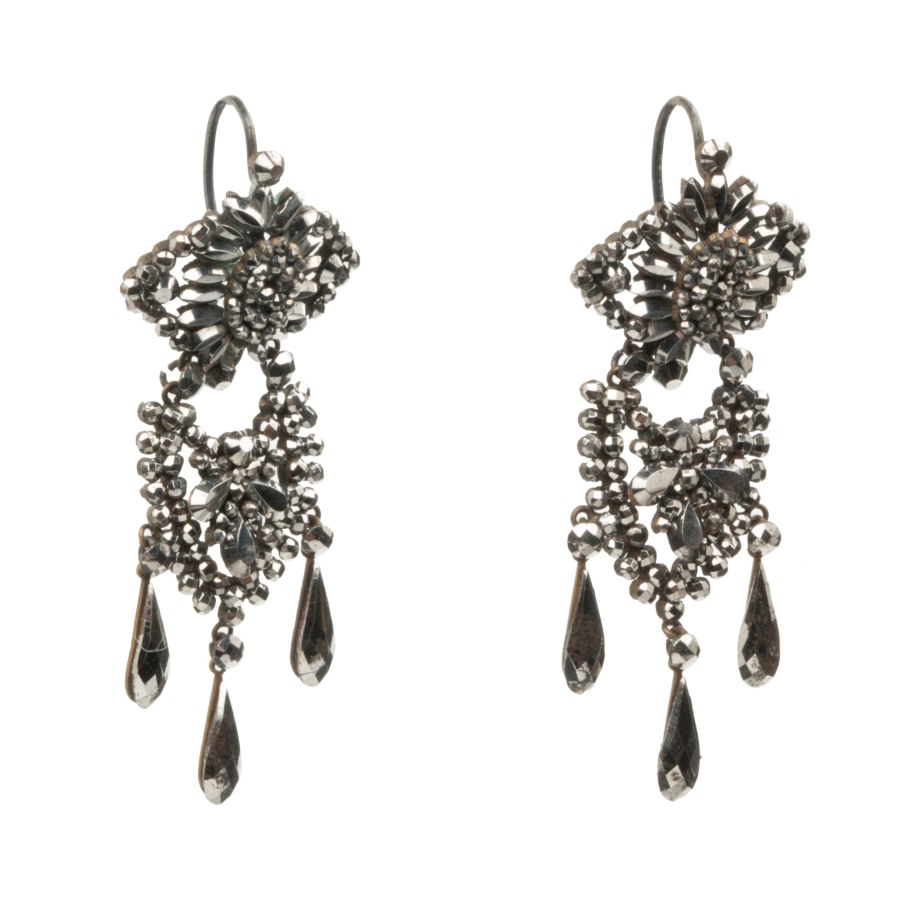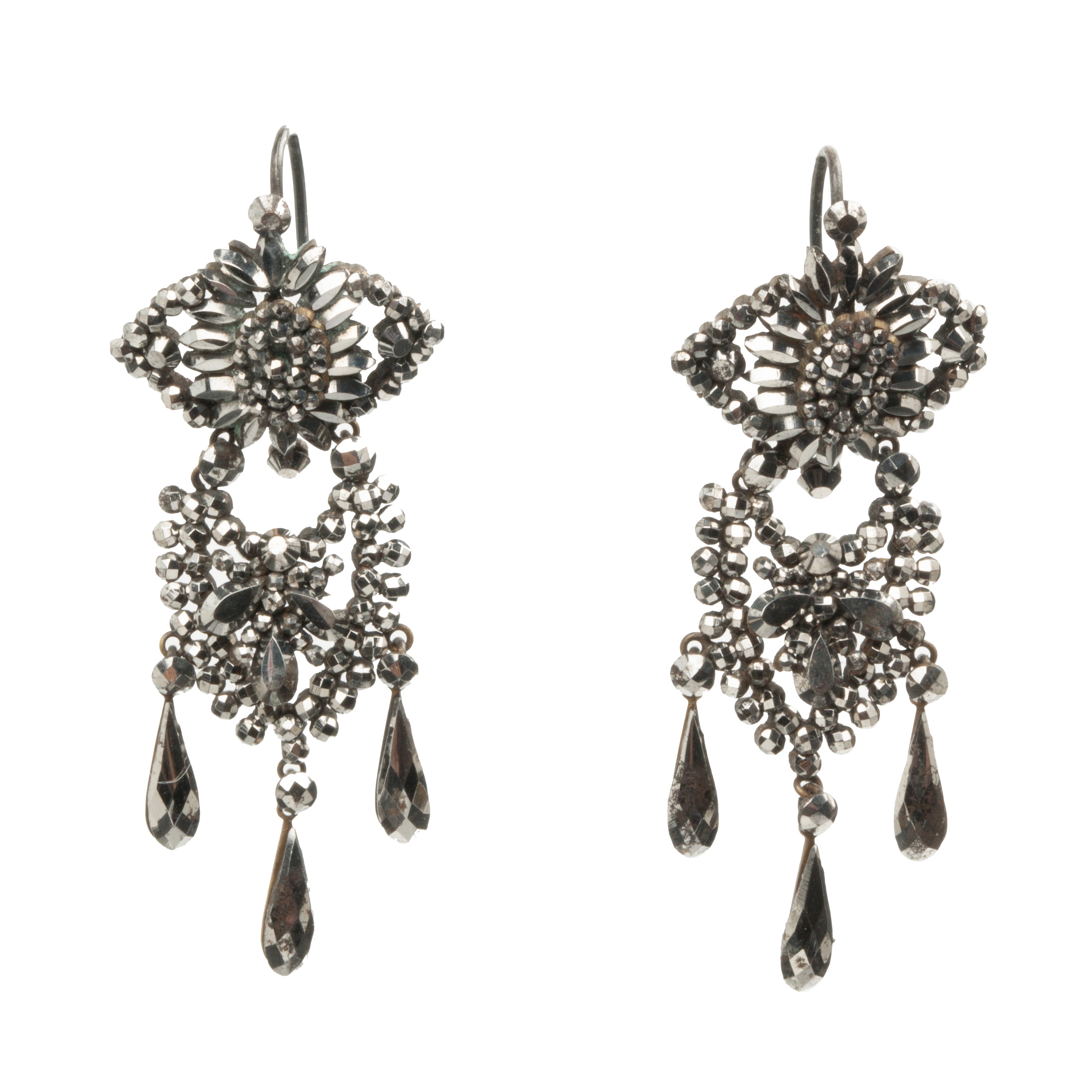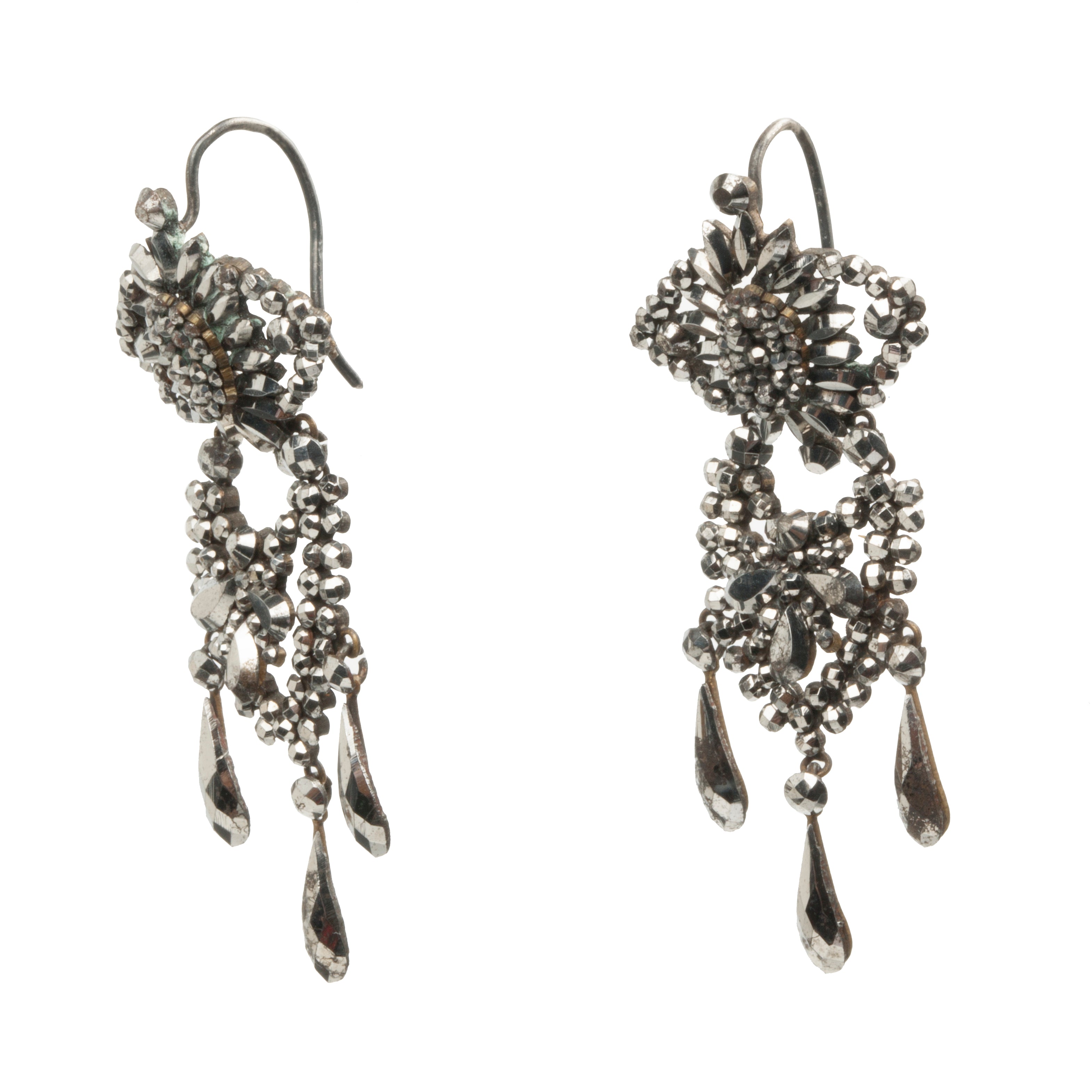 Victorian era cut steel earrings, with tear drop tassels. Beautifully preserved with a bright gray sparkle. Circa 1840, English in Origin.