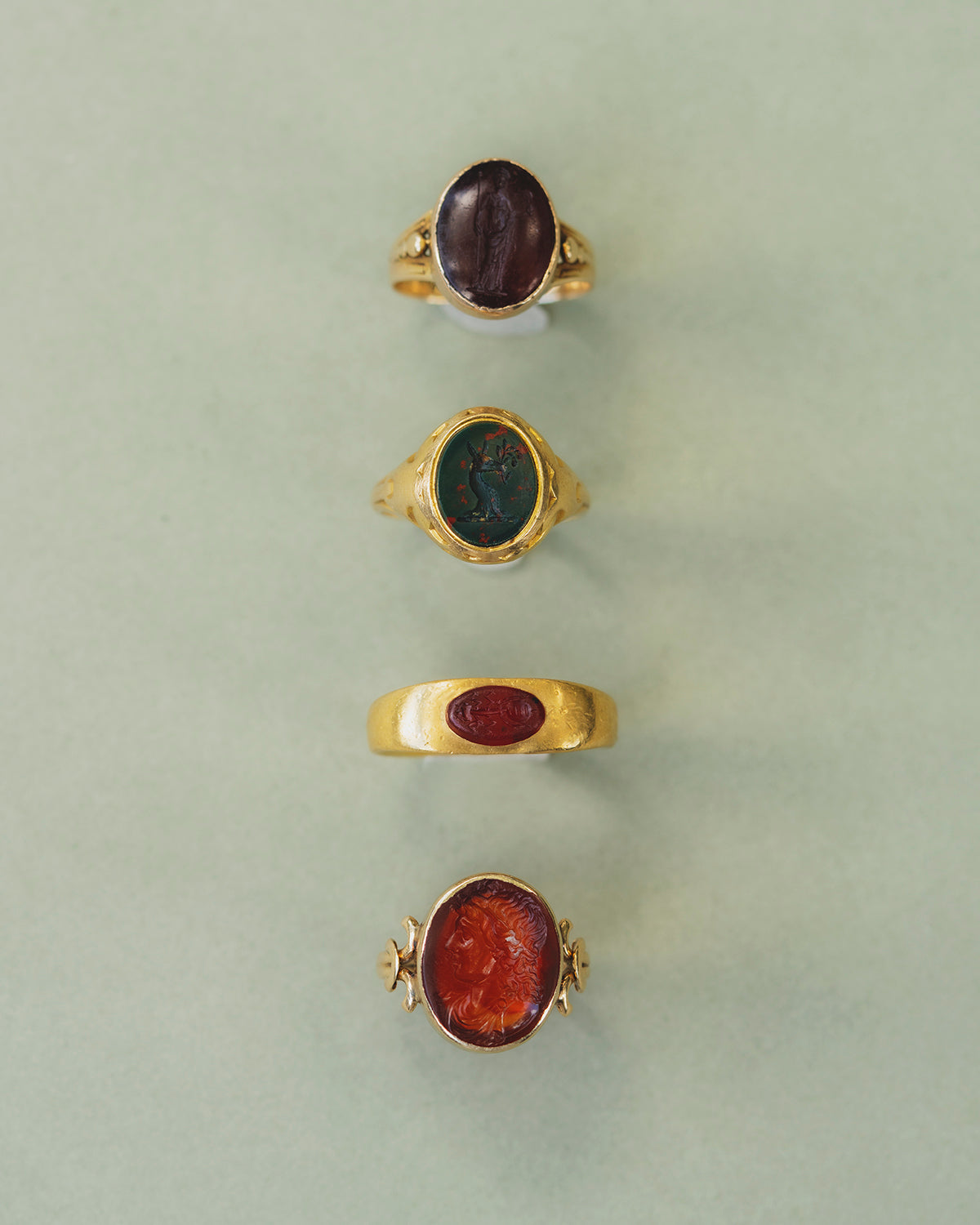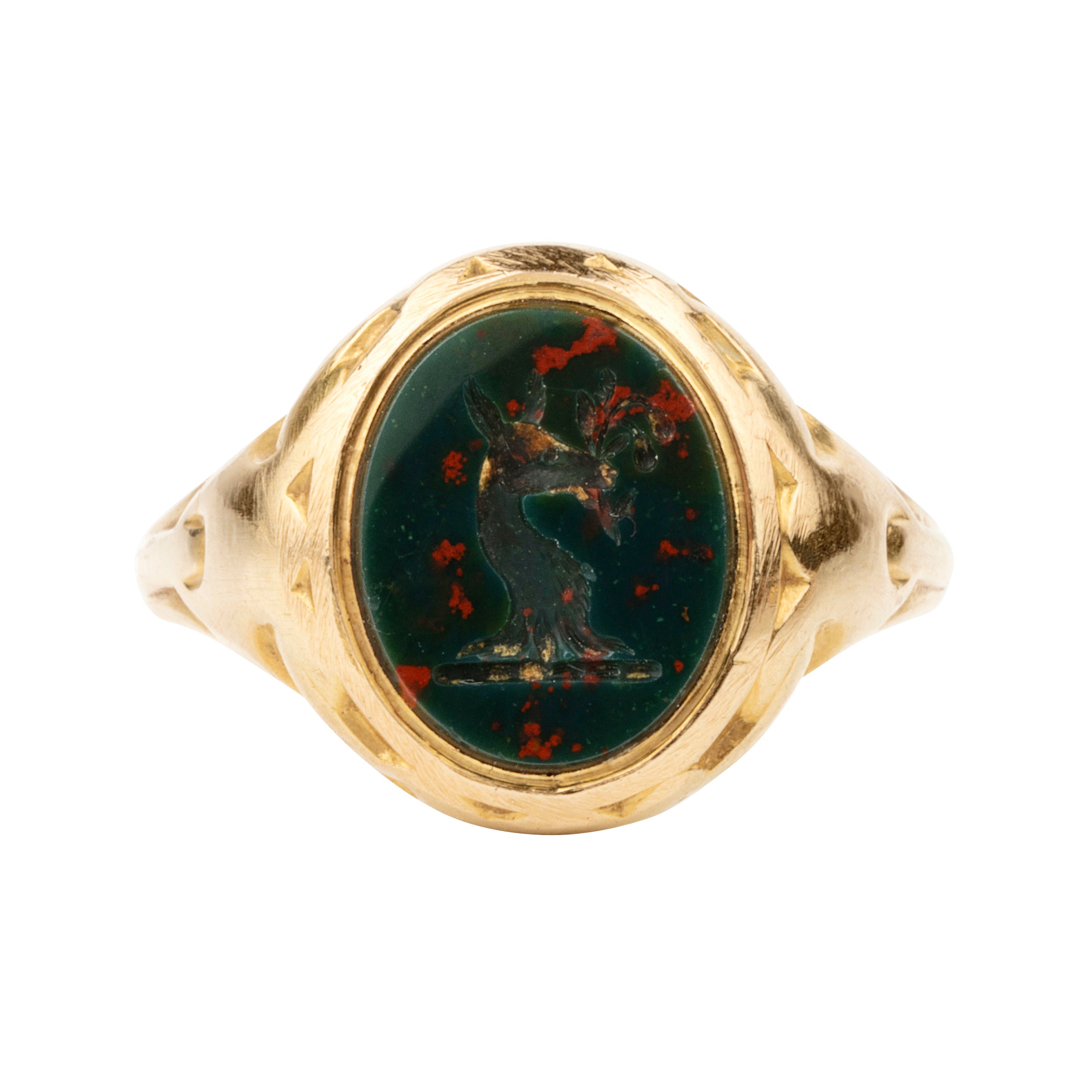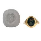 An intaglio of a doe carrying a fruit-bearing branch is carved into bloodstone and set within an 18k gold ring. The workmanship is fine yet unpretentious, meant for daily wear and private meaning rather than display. Time and wear have softened the ring's shoulder details. The doe's calm and graceful nature symbolizes peace and sensitivity, while the branch represents the prosperity of the natural world.