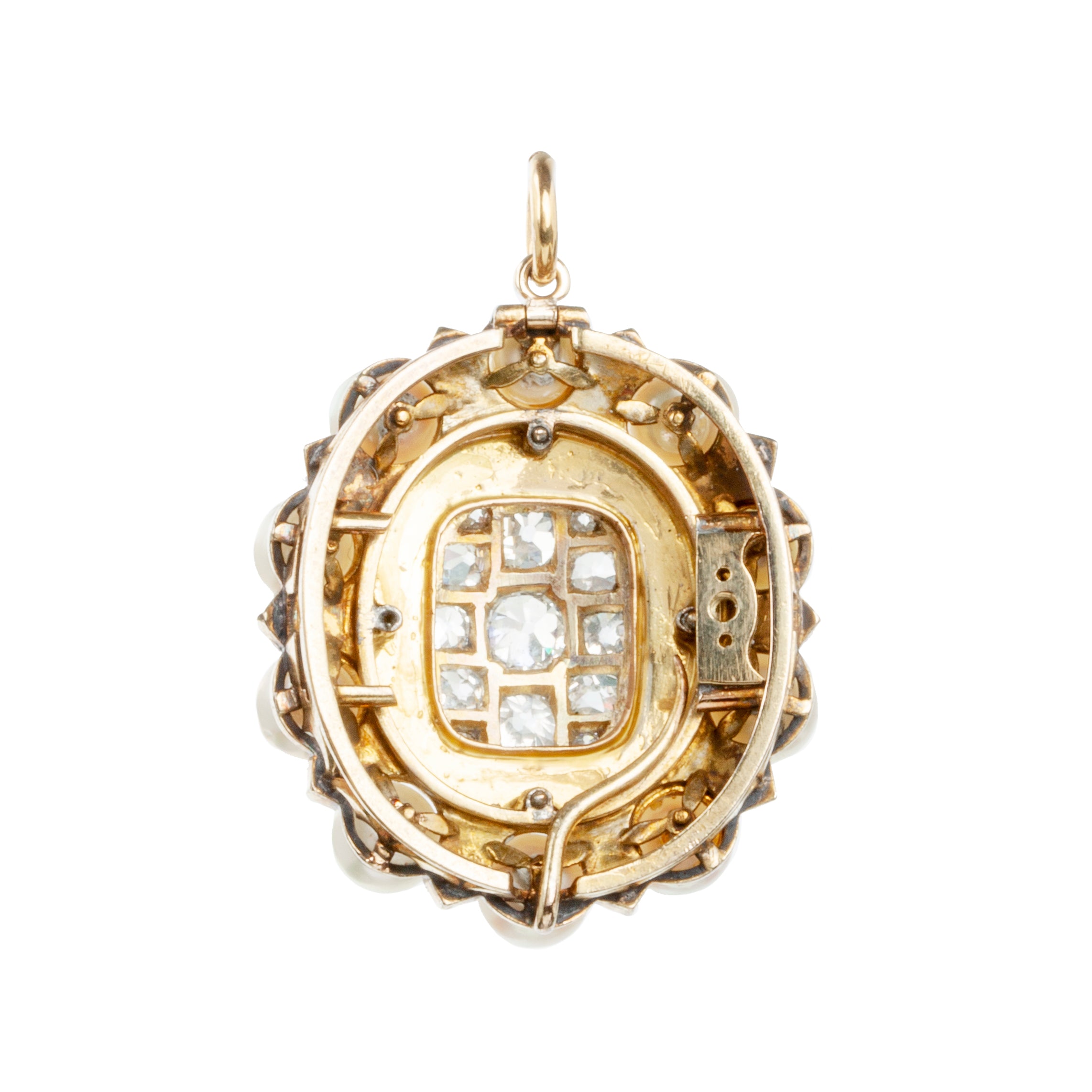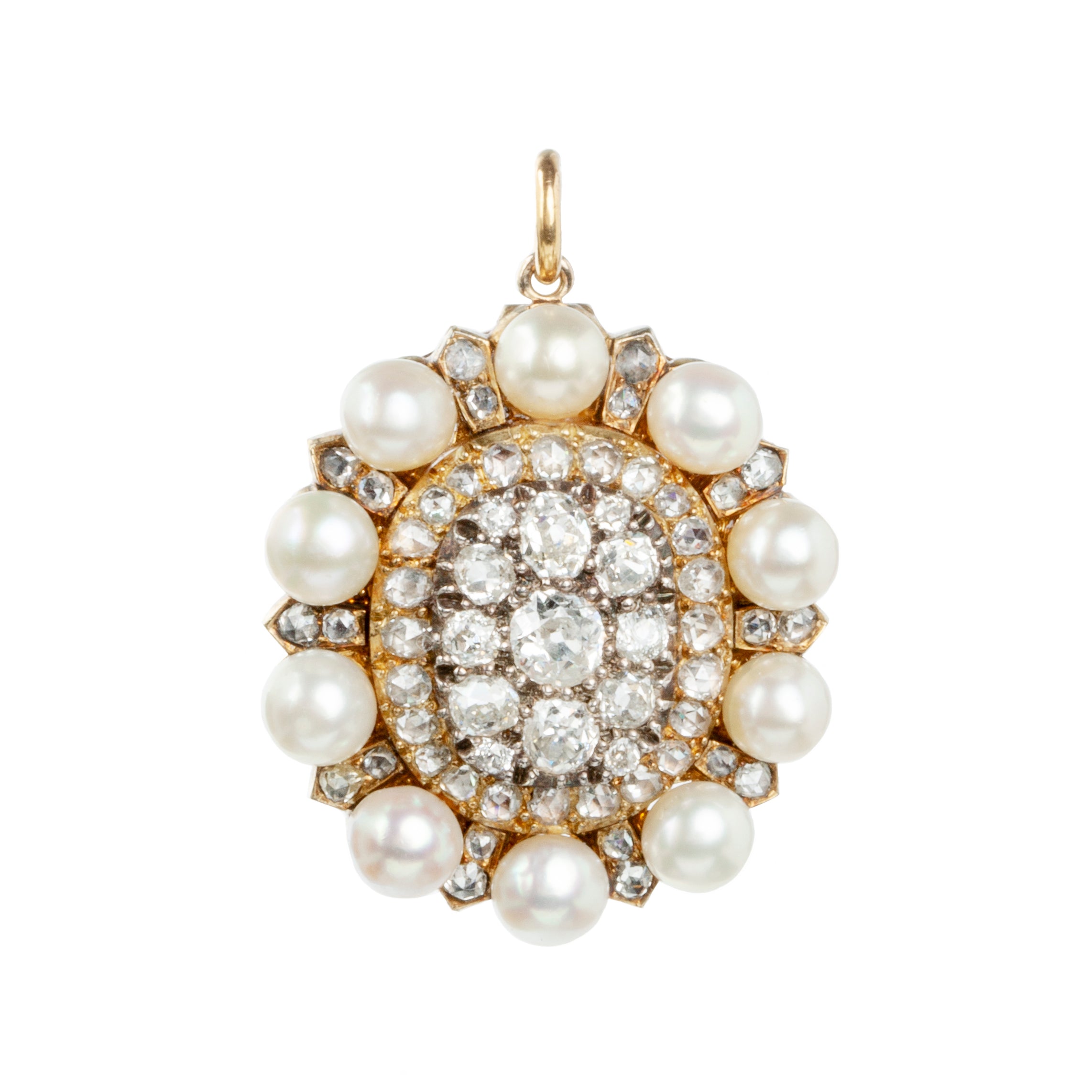 Victorian era diamond and pearl cluster pendant. Fifty- seven old mine cut and rose cut diamonds make up a radiating pattern along with ten white pearls. The pearls are presumably natural as the pendant pre-dates culturing techniques by 50 years. English in origin. Circa 1850.