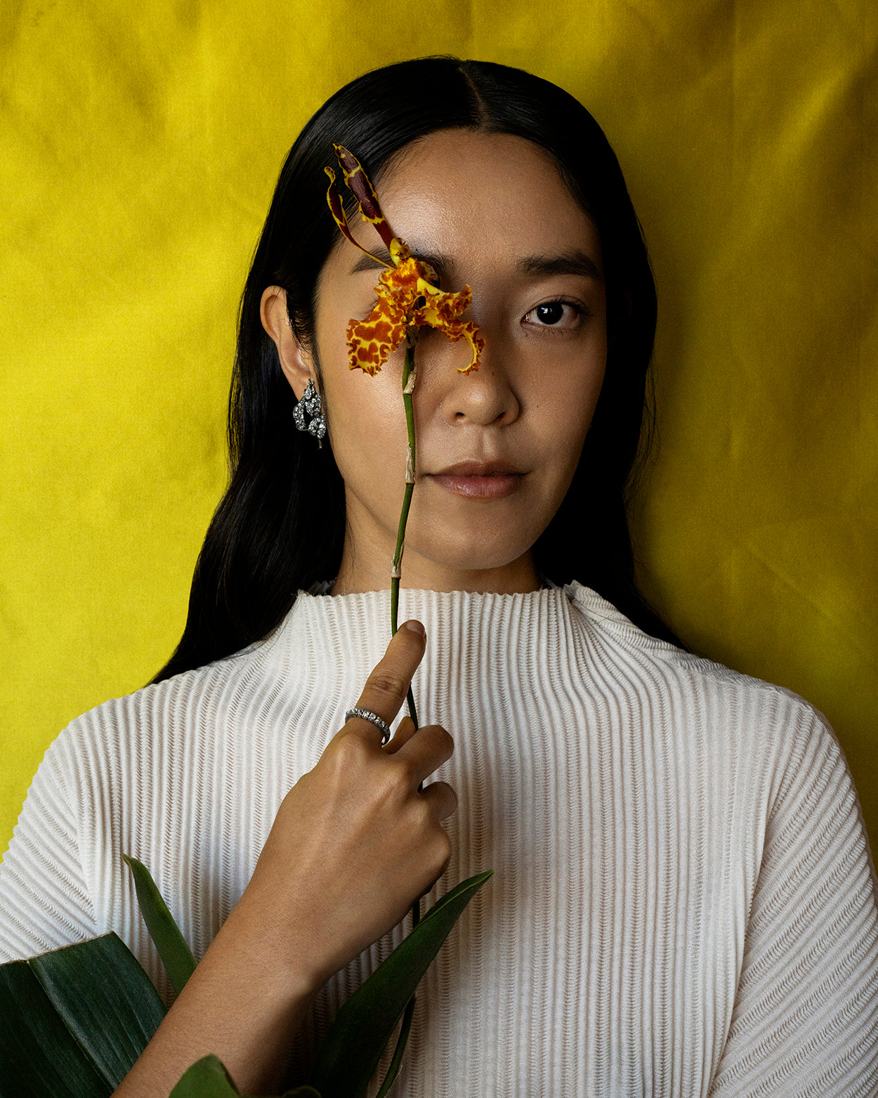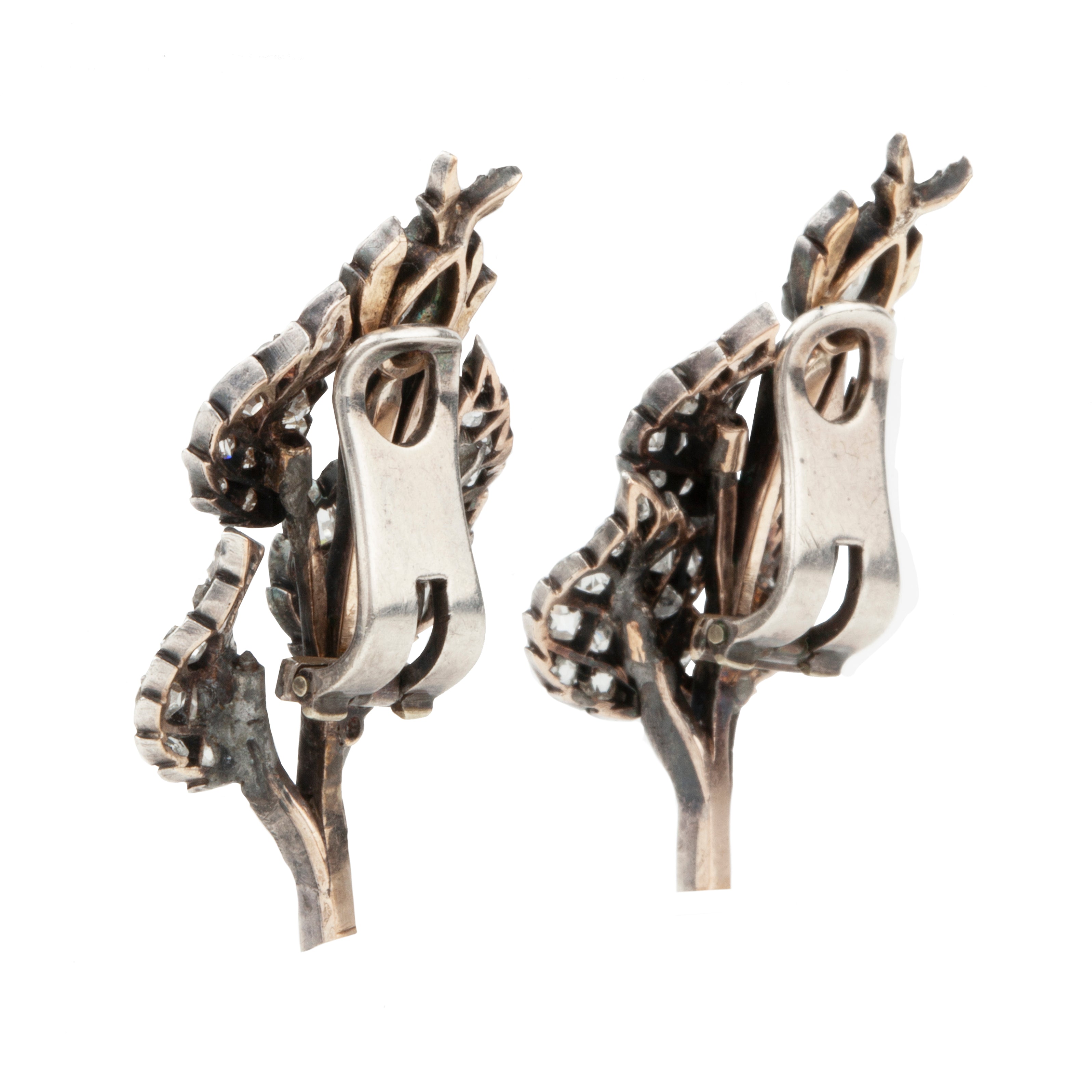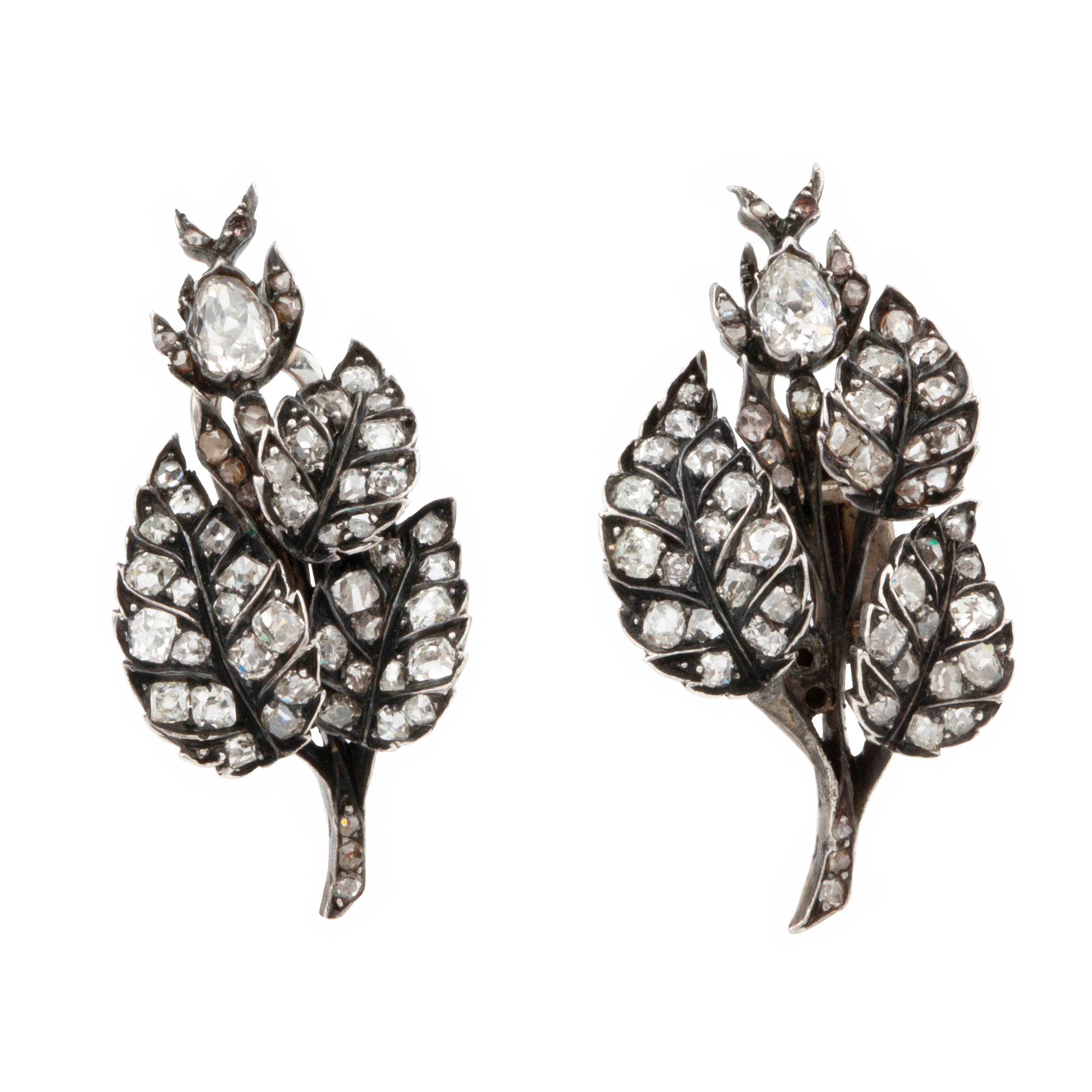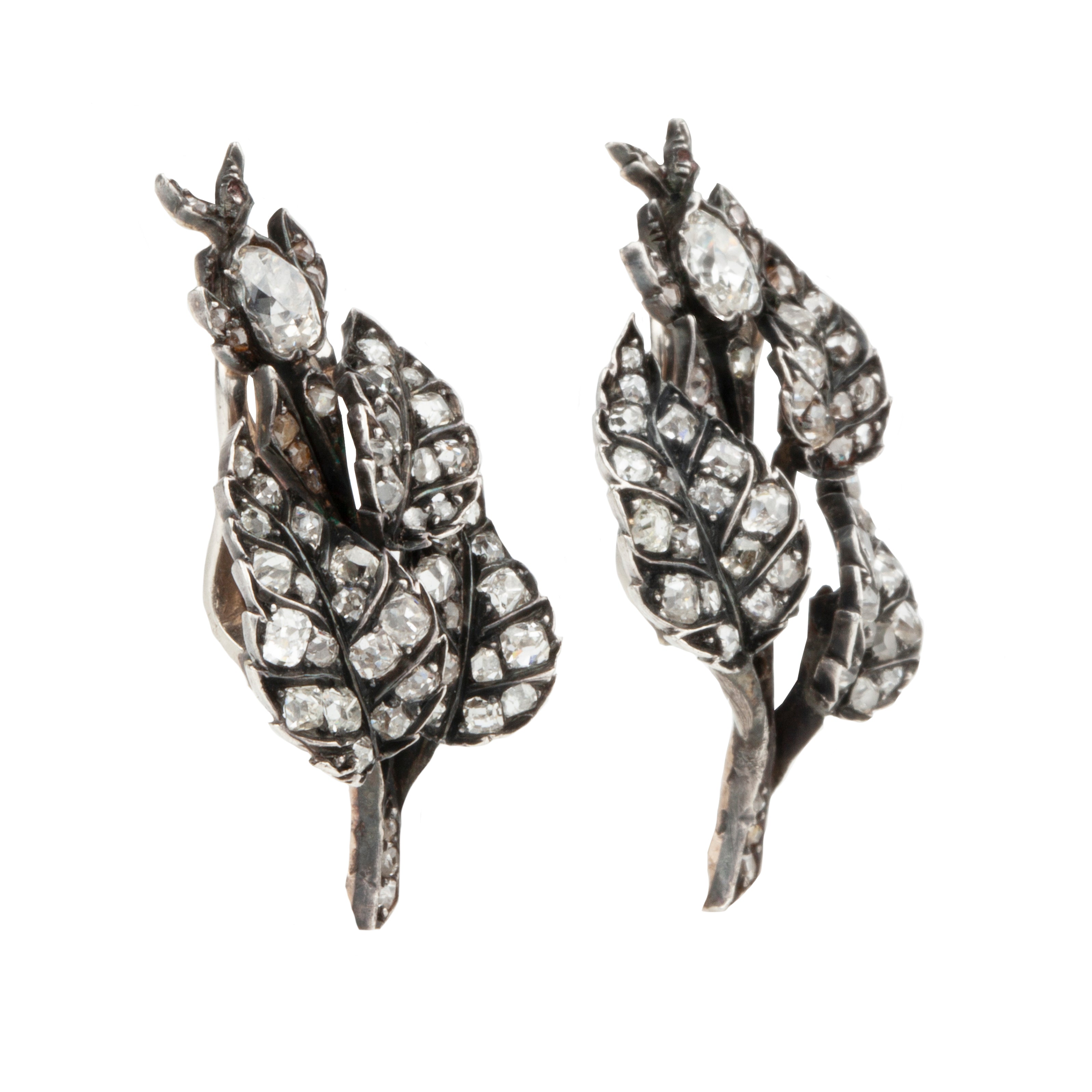 19th century diamond earring in a naturalist motif of flowers and leaves. Both old mine cut and rose cut diamonds are set in silver on gold settings. The realistic design is typical of the naturalist movement of the late 1860's which produced many exceptional diamond pieces in this style. The time period coincided with a newly discovered diamond source in Africa. English in origin. Circa 1860.
