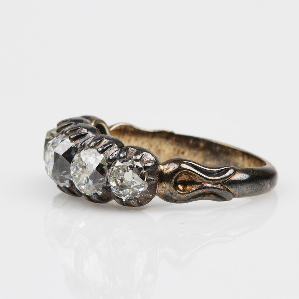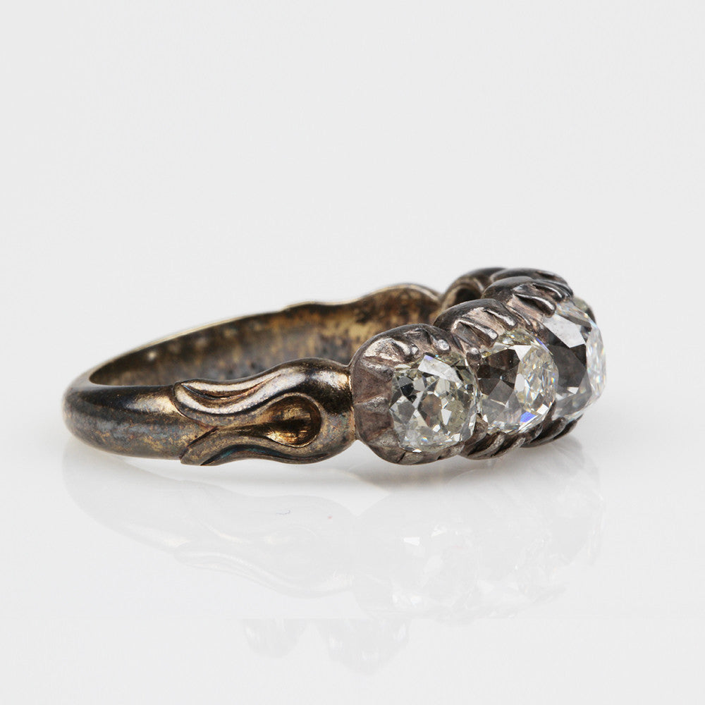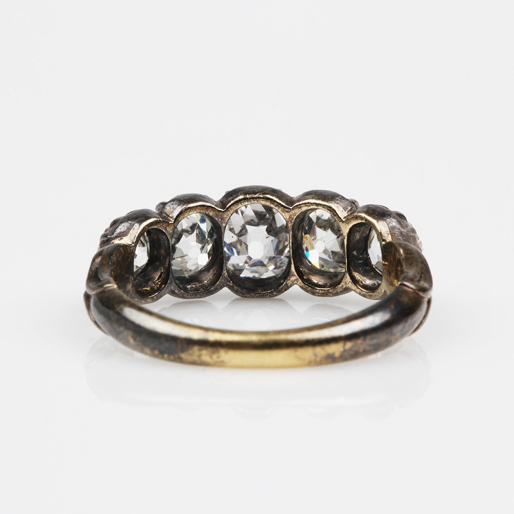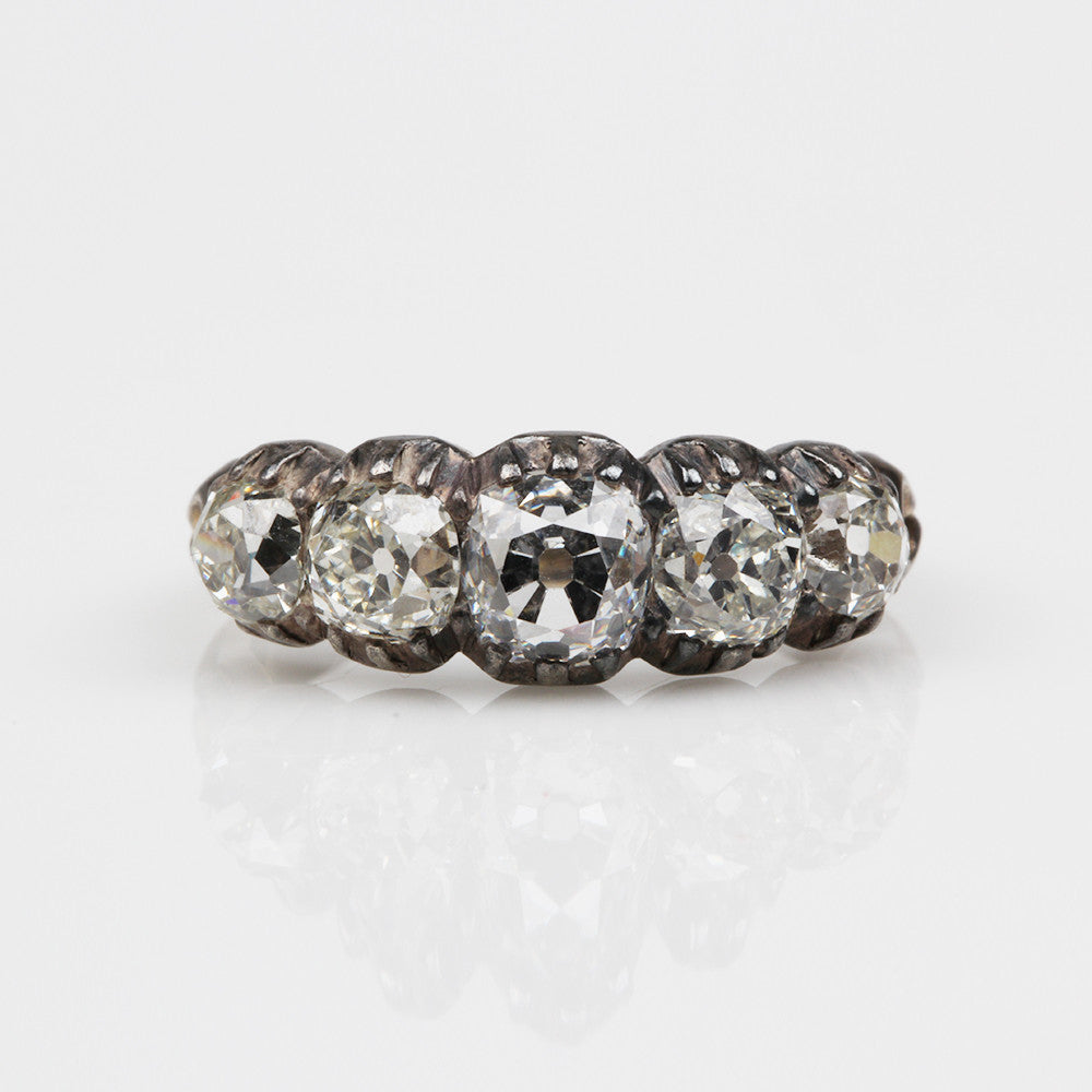 Victorian Era Half Hoop Band with 5 Graduated Old Mine Cut Diamonds. Center Stone, approximately .75 carats with total estimated weight at 2.6 carats. Diamonds set in silver cut away settings on 18k gold band. Circa 1850.