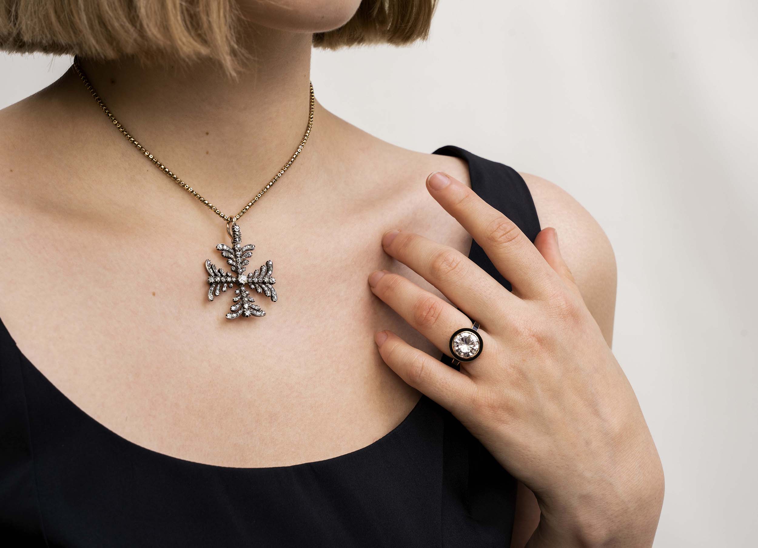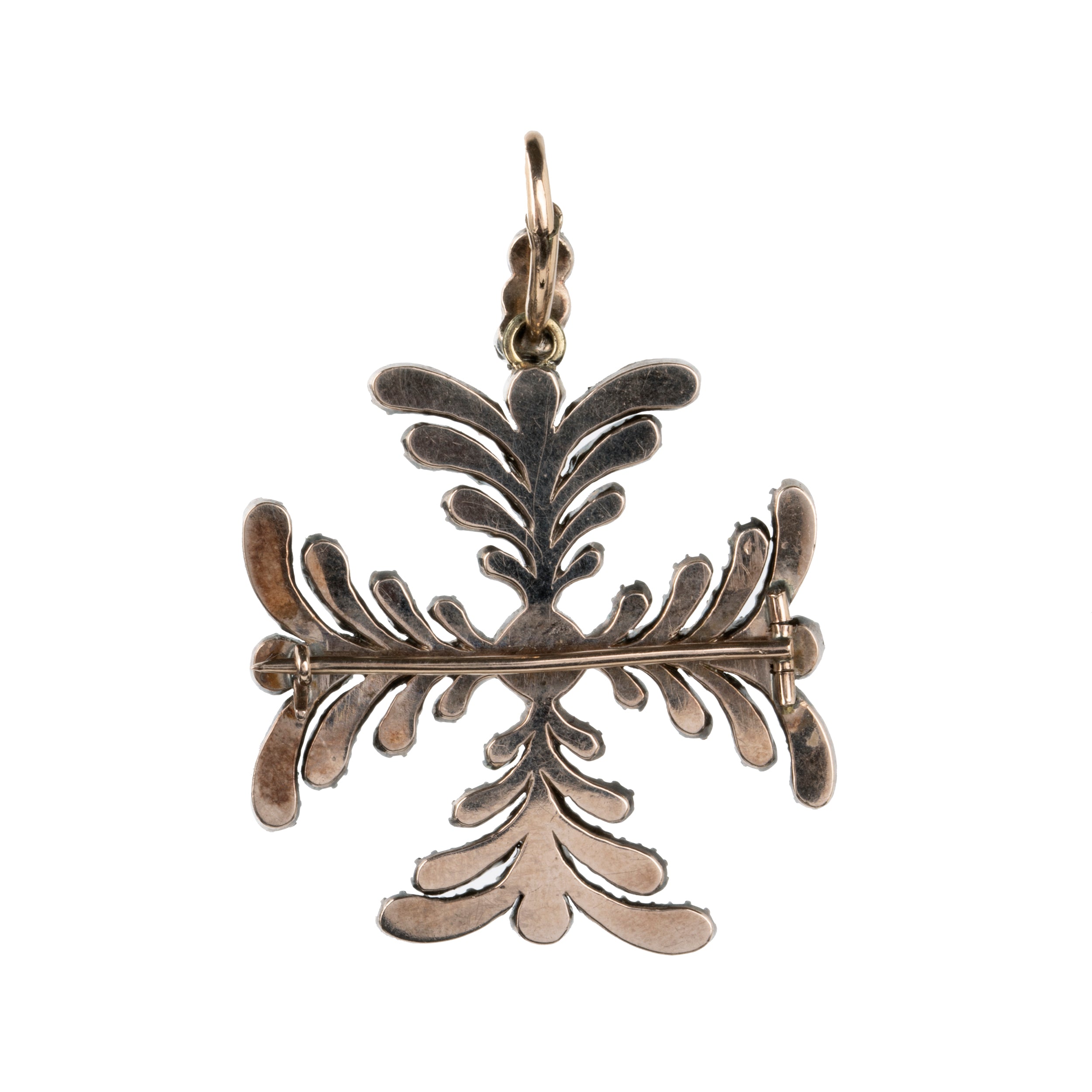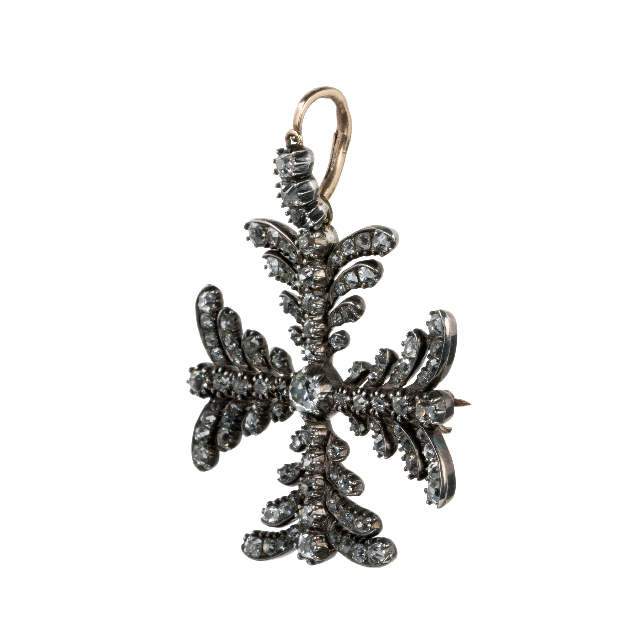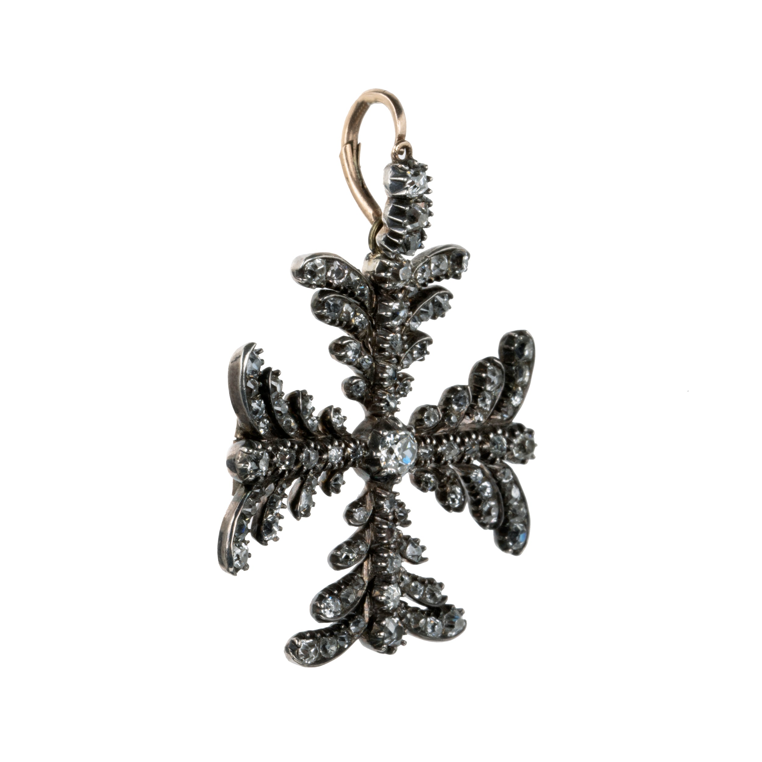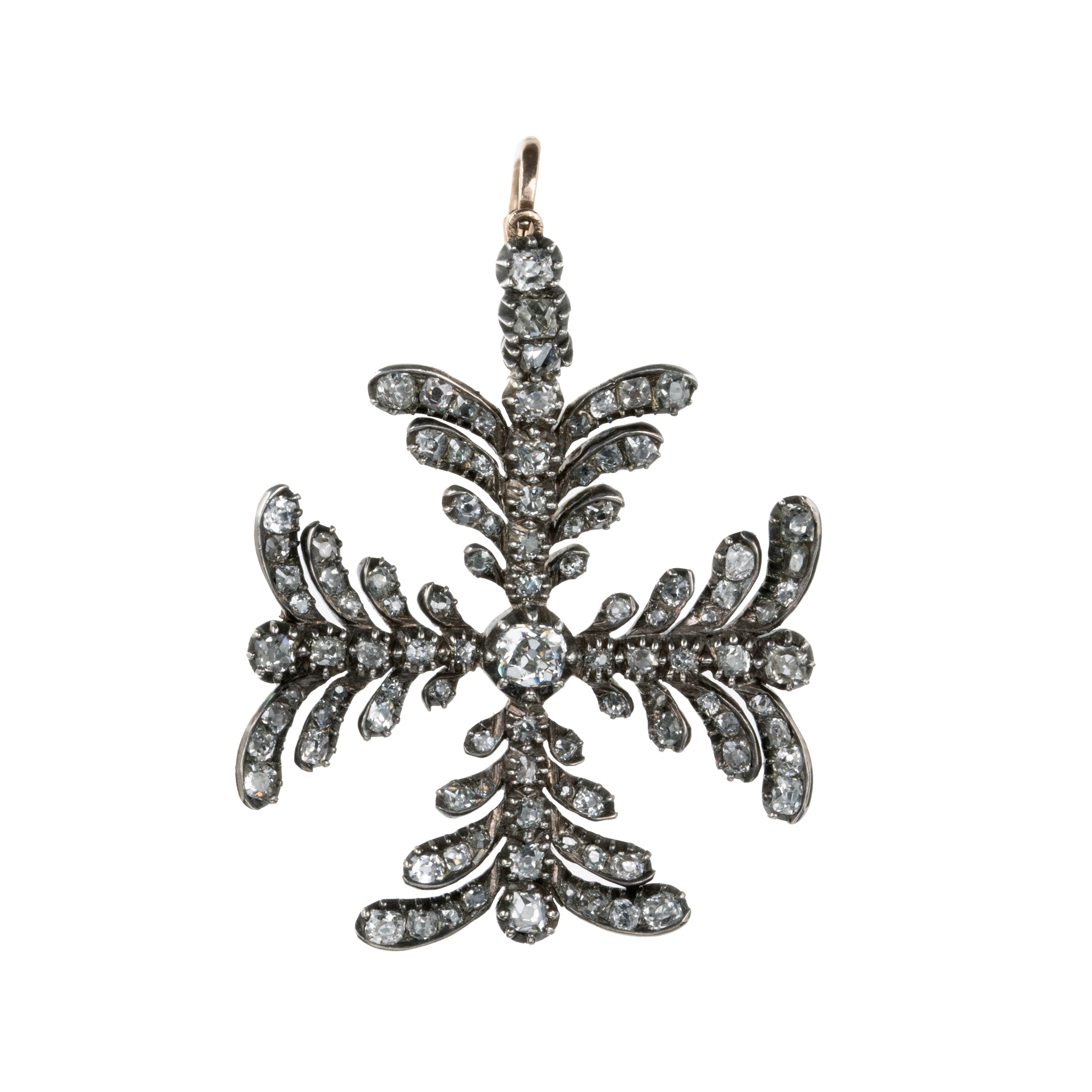 A playful take on a Maltese cross form. This 19th-century pendant has dozens of rose cut and small old mine-cut diamonds set in silver on gold. Approximately 3.75 carats in total diamond weight. Presented in its original 19th-century box. England, circa 1870.