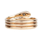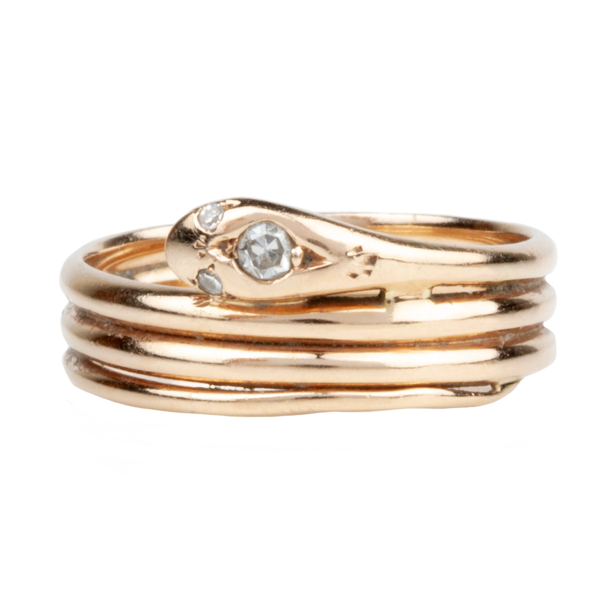 Victorian era coiled snake ring, with diamonds eyes and diamond head, in rose gold. English in origin. Circa 1870.