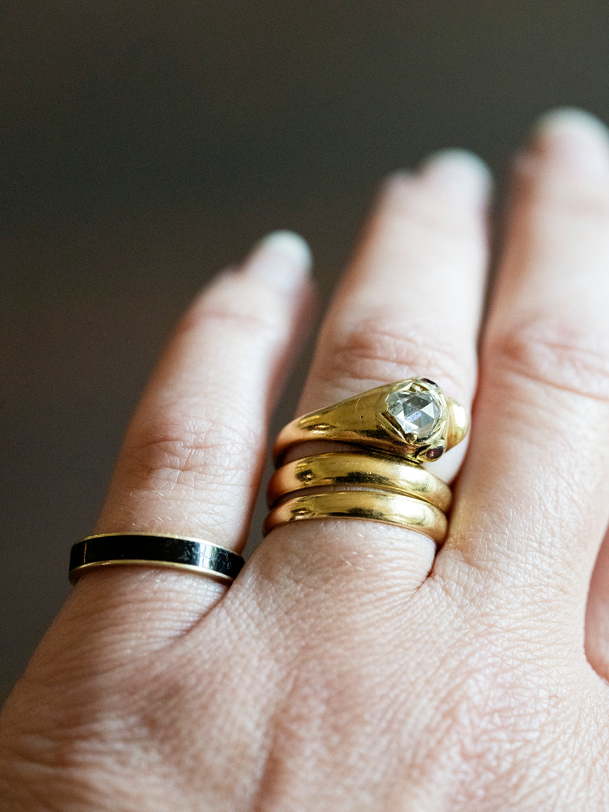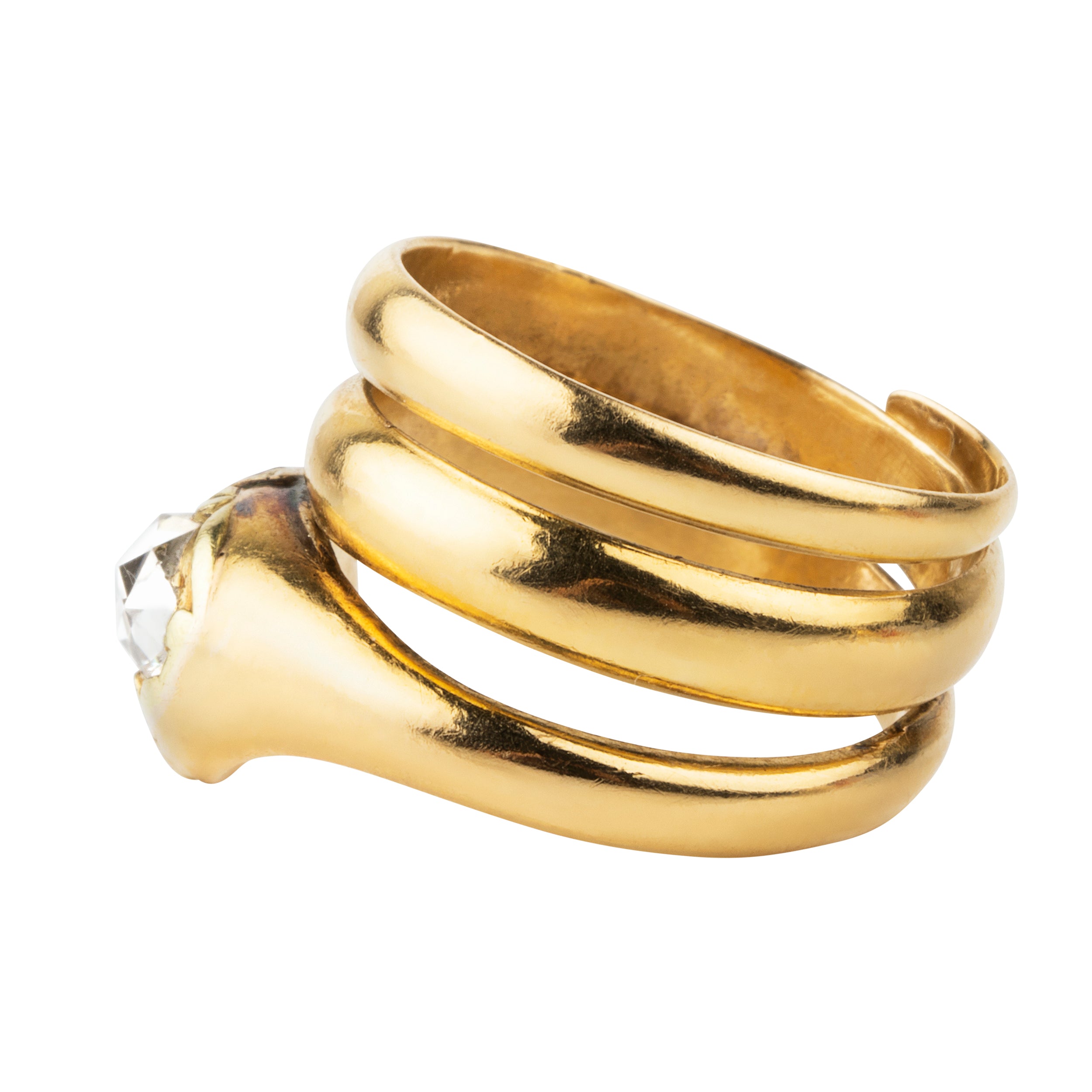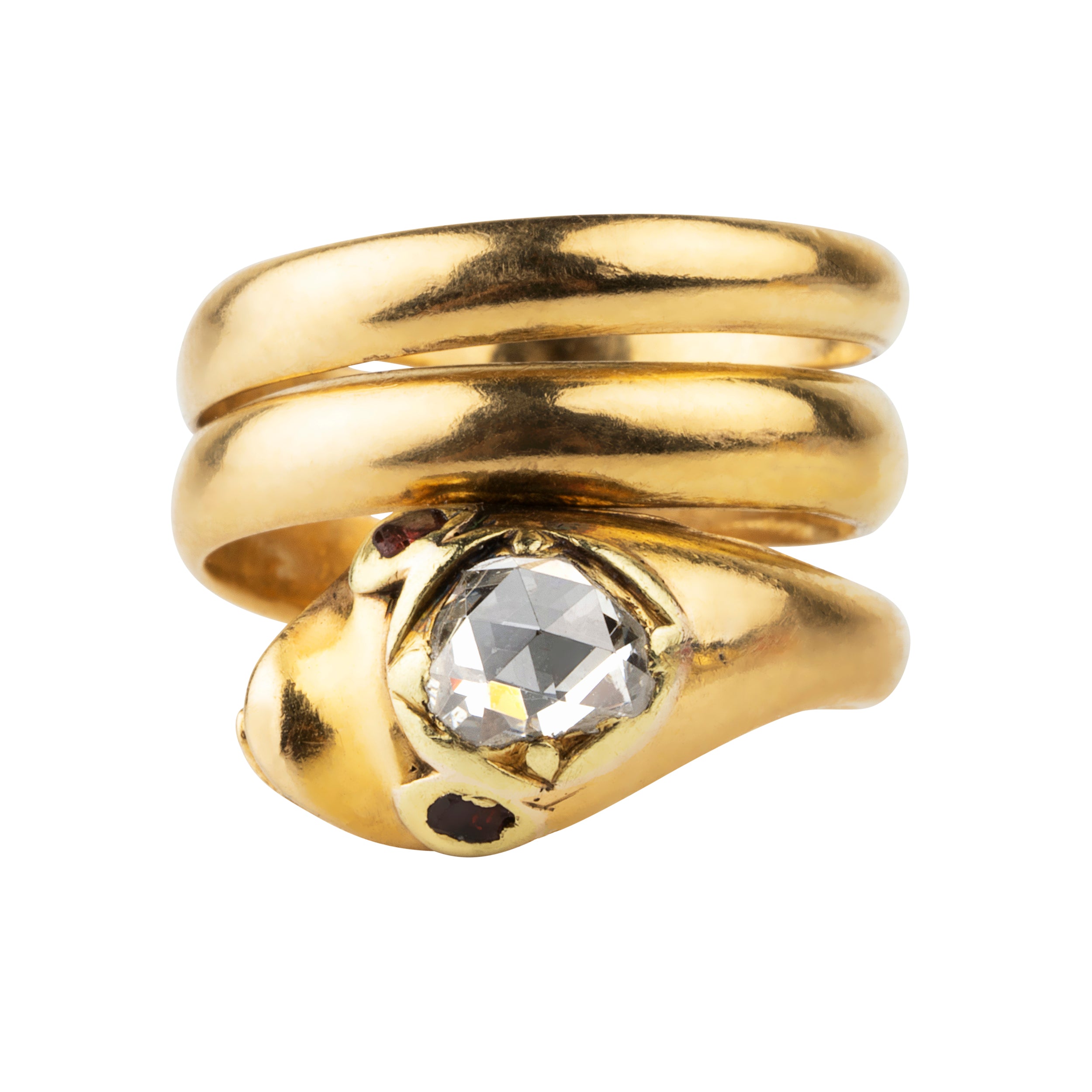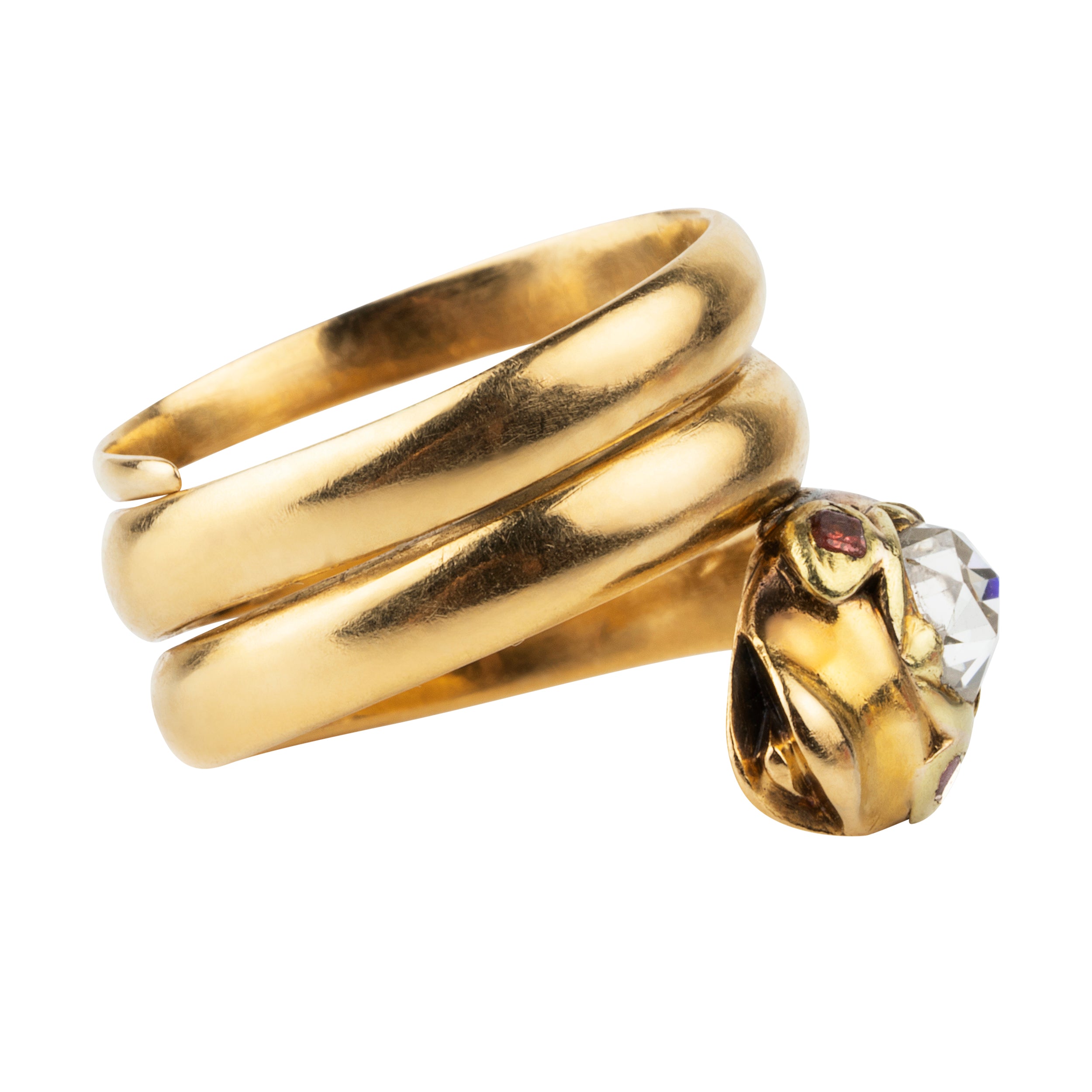 Victorian era coiled snake ring with rose cut diamond and ruby eyes, in 18k gold. The serpent wound its way through the 19th-century jewelry as an amulet, a talisman, a good luck charm, and a symbol of enduring love. England. Circa 1870.