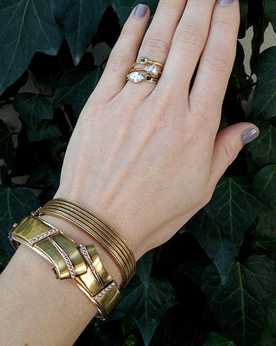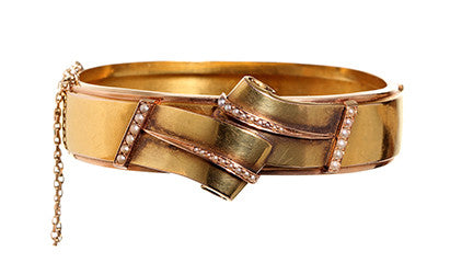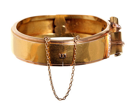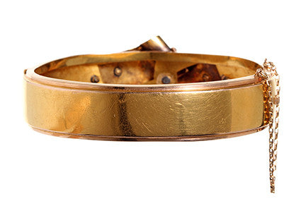 Hinged at side with safety chain and push-button closure. Inner circumference of bracelet measures approximately 6.75".