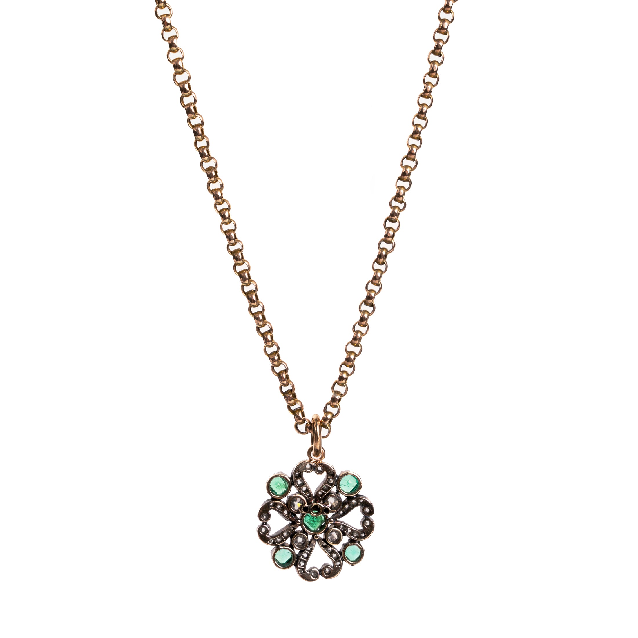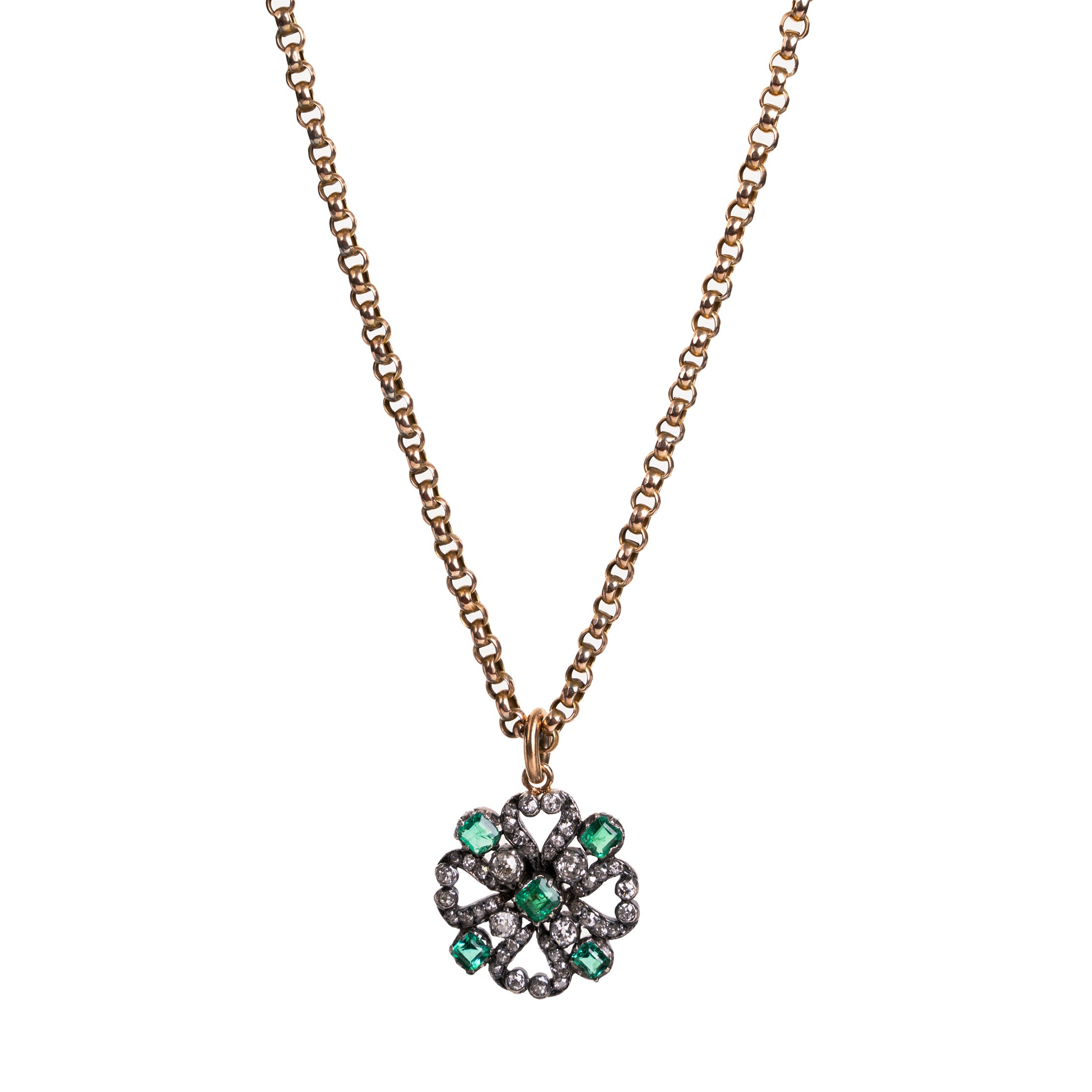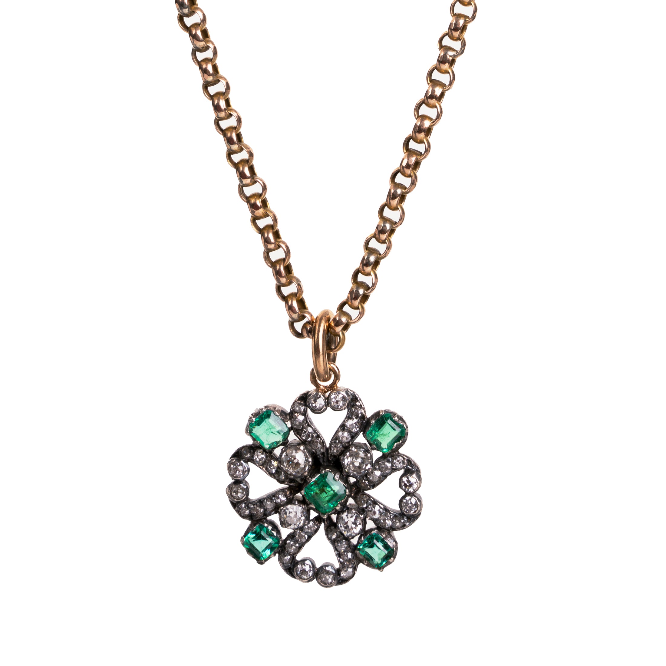 Bright emeralds in a quatrefoil design with old mine and rose cut diamonds. Fine workmanship in silver topped gold settings. English in origin. Circa 1880.