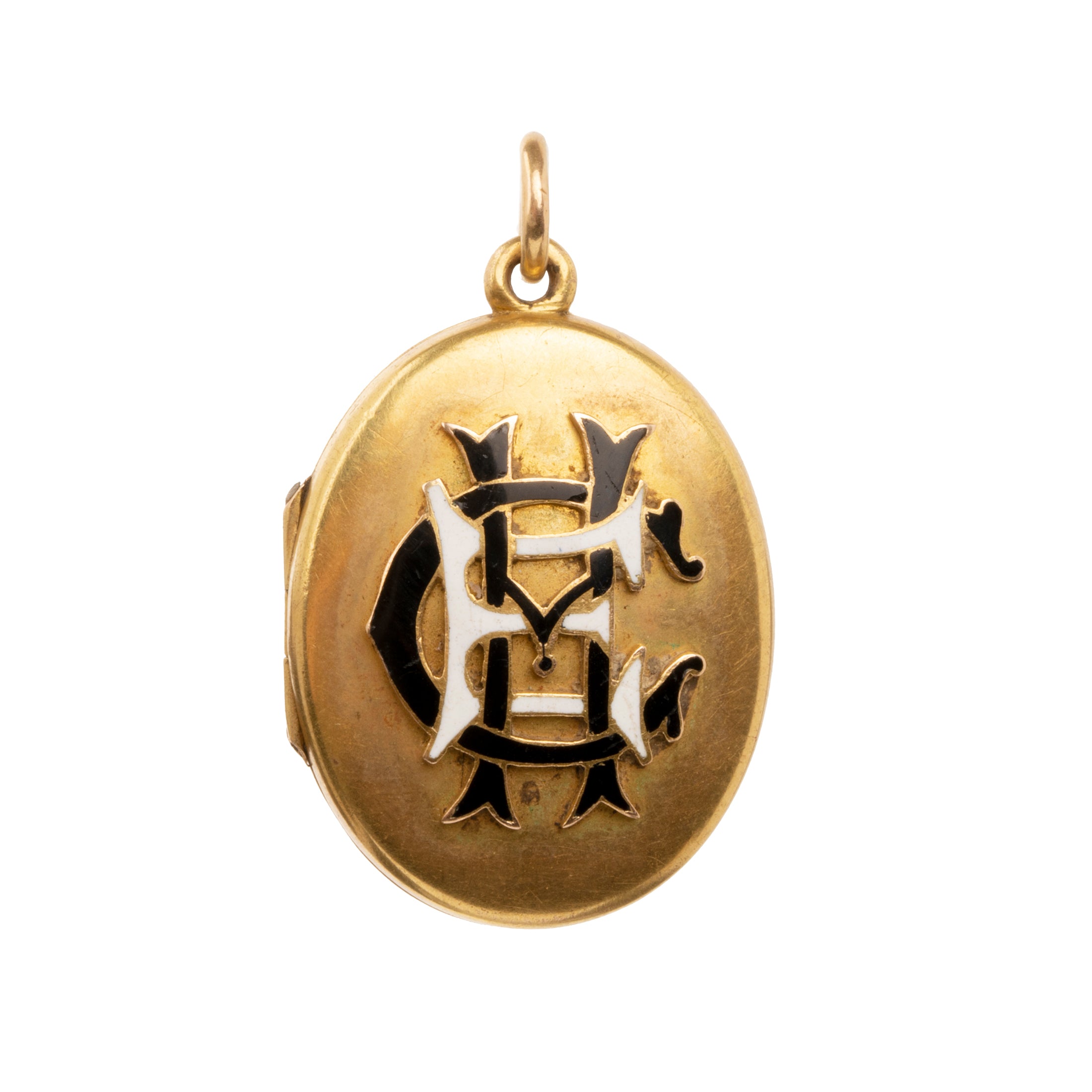 Victorian era black enamel and gold locket. Bold monogram "CHE" in black and white Enamel and 18k Gold. The original glass is present on both sides and both frames are still intact. English in origin. Circa 1870.