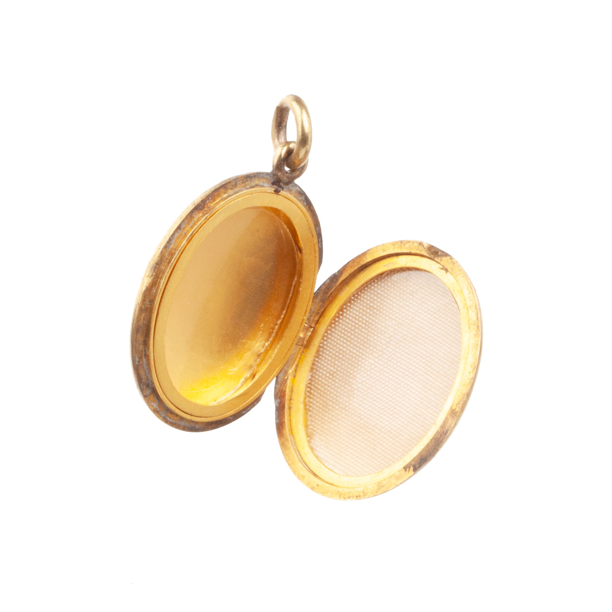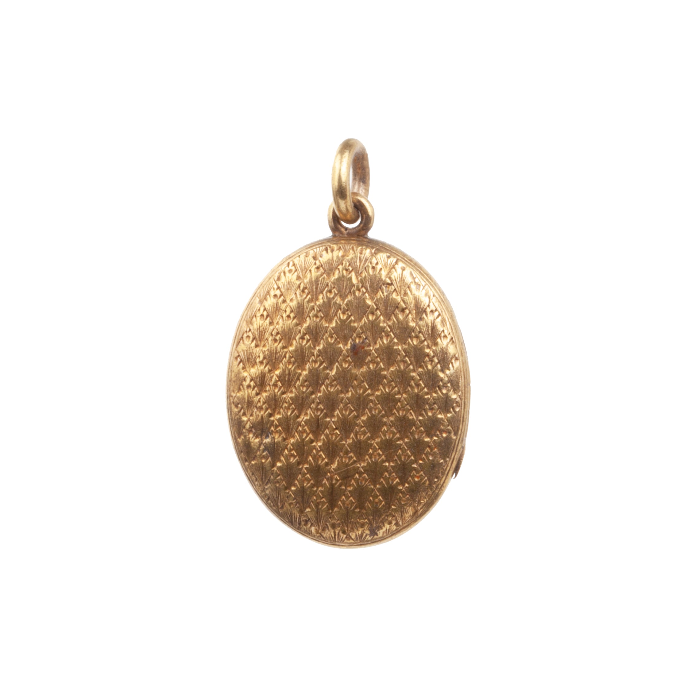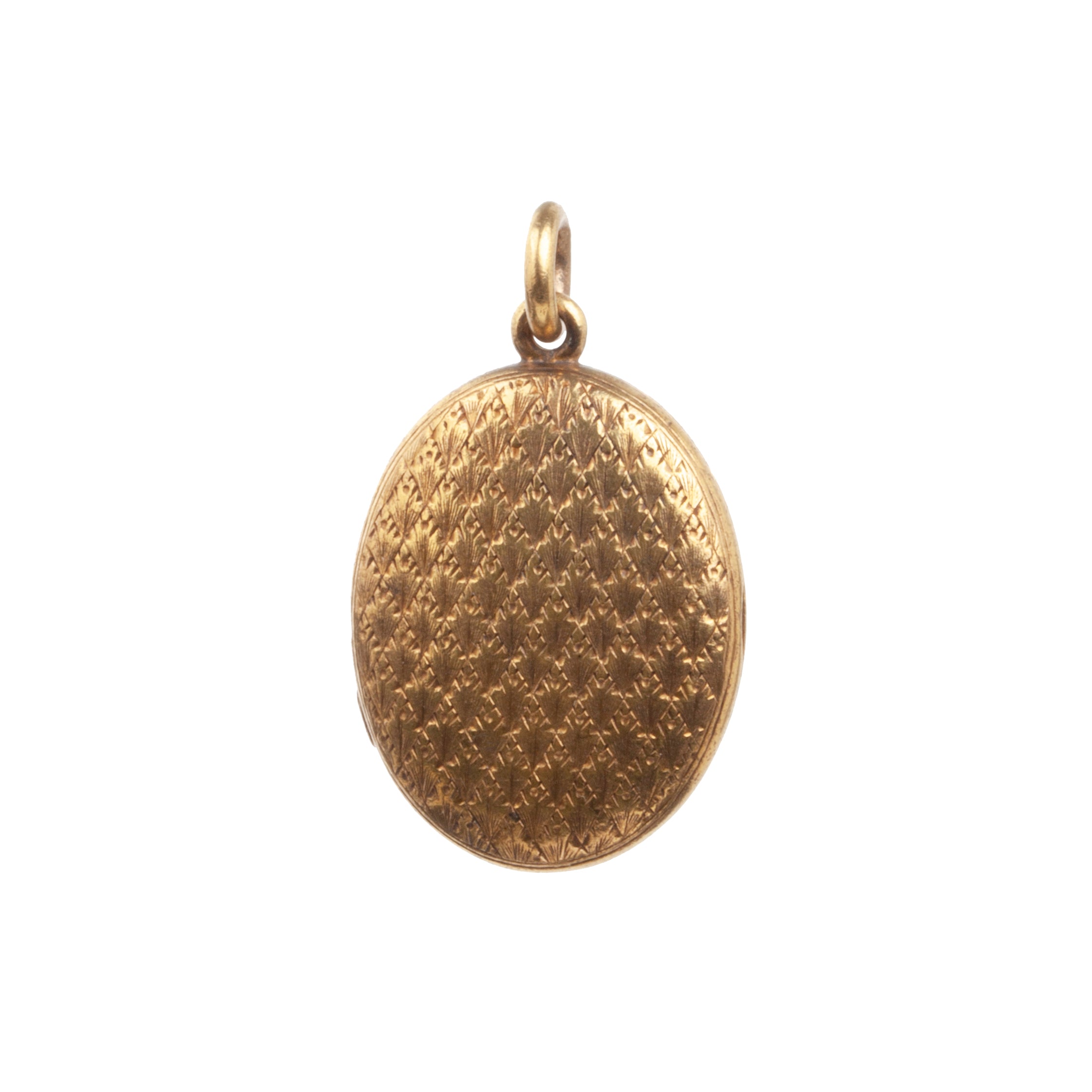 Victorian era locket with engraved details, in 15k gold. Beautiful dark patina enhances the engraved pattern. Original locket fixtures and glass are intact. English in origin. Circa 1890.