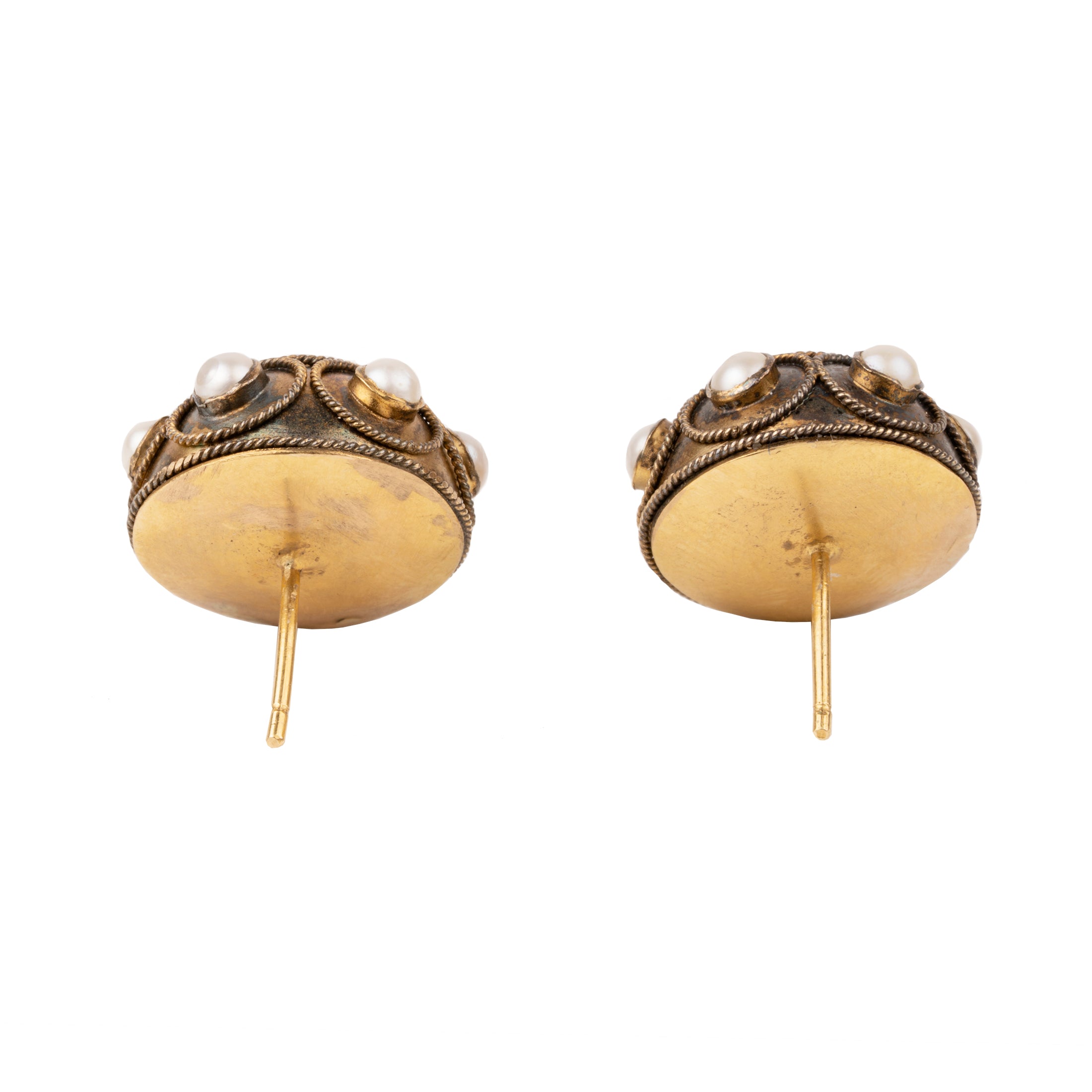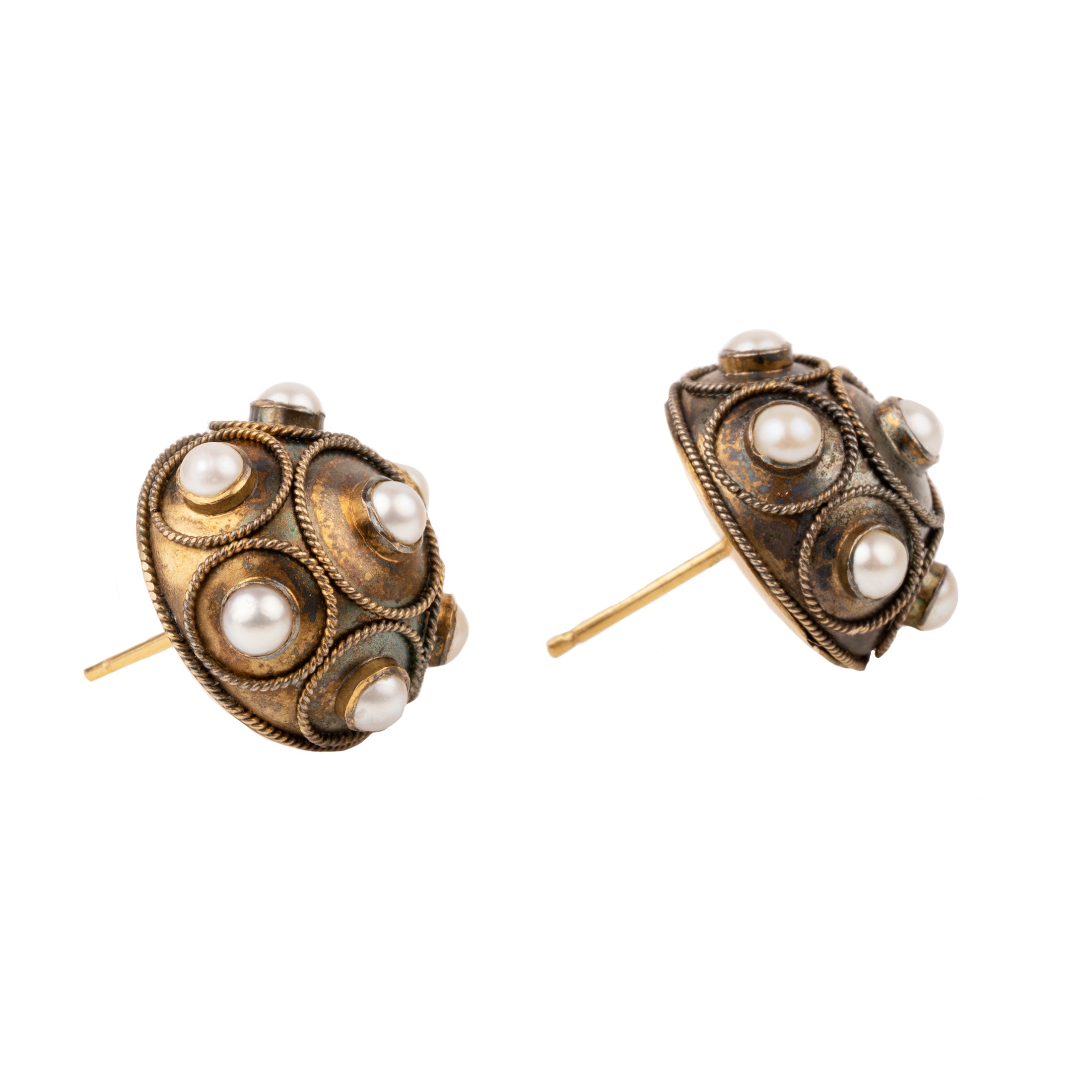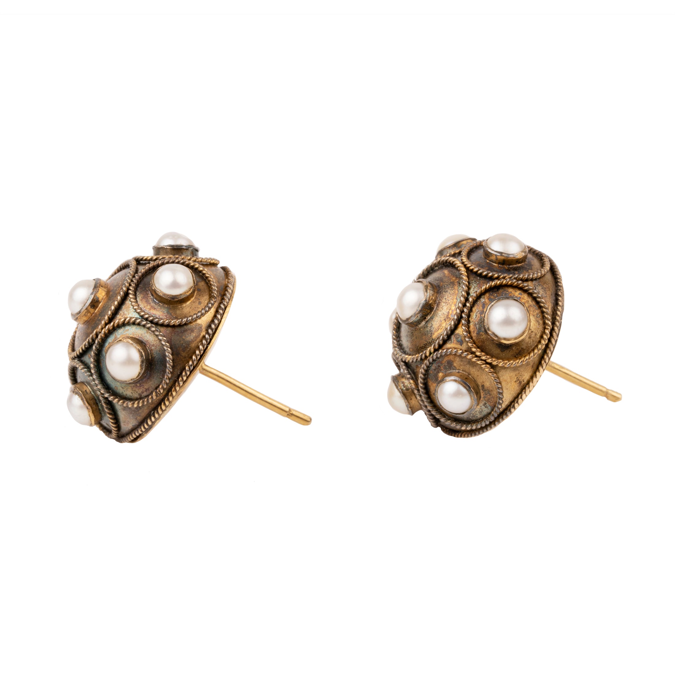 Victorian era Etruscan Revival pearl stud earrings, in gold. English in origin. Circa 1870.