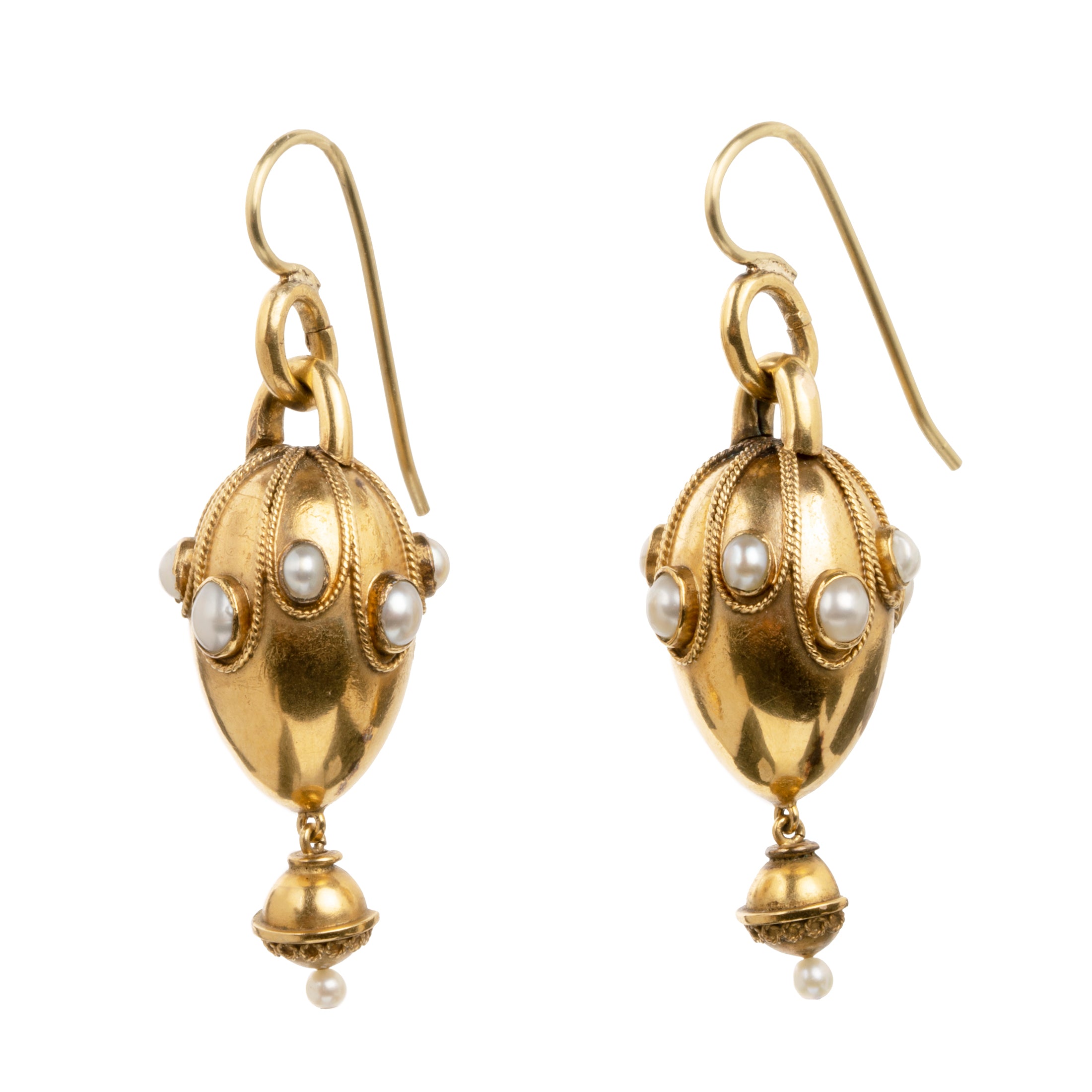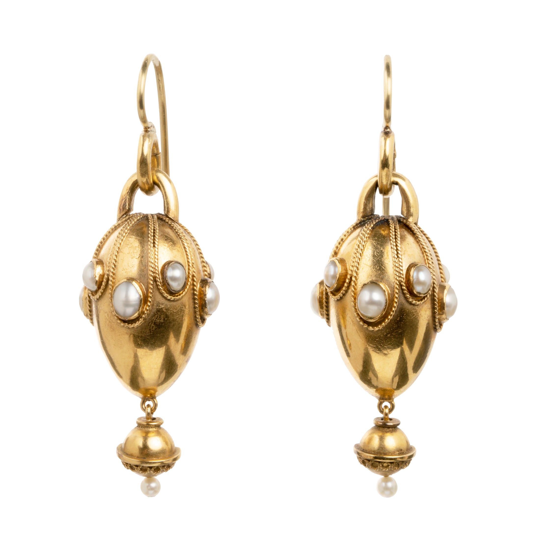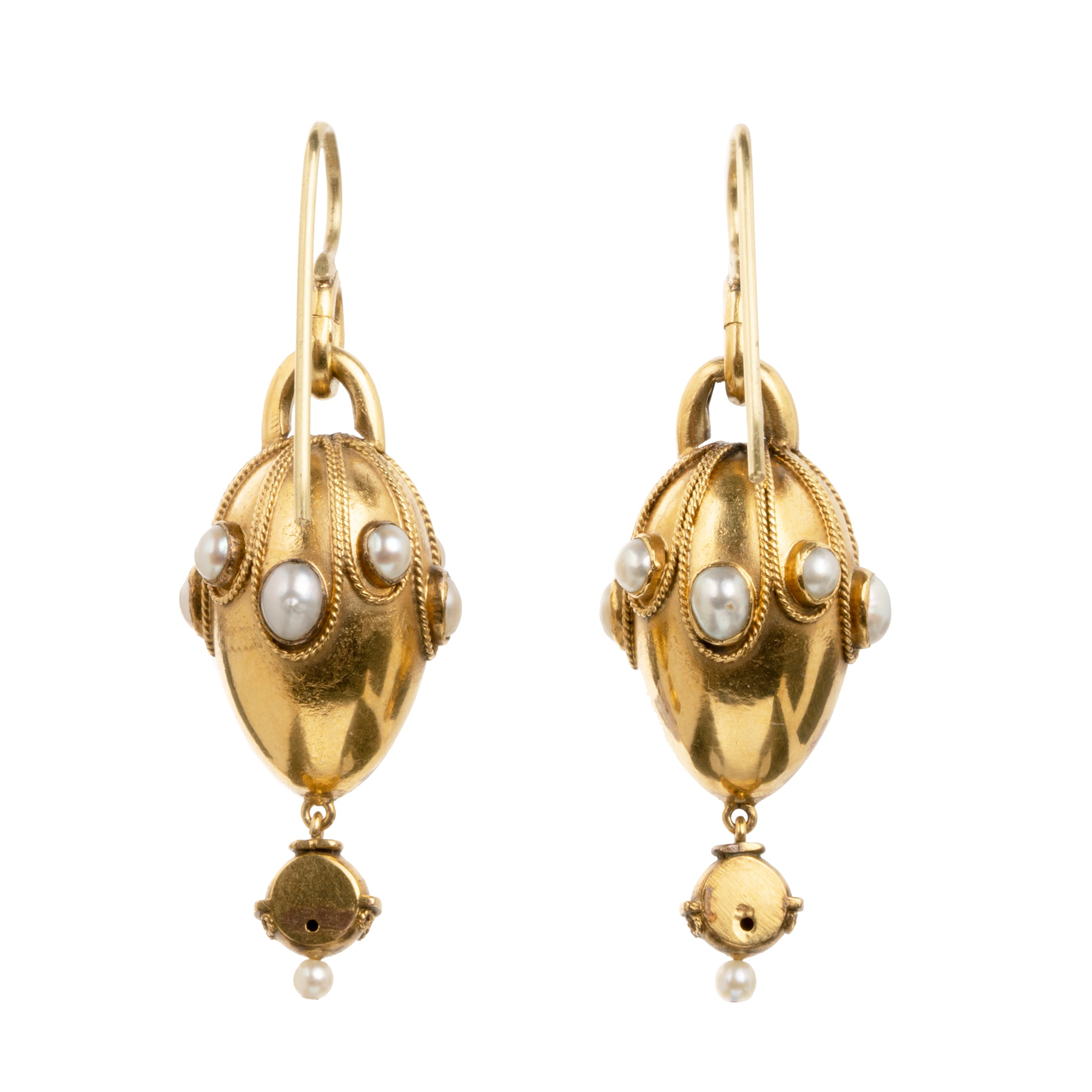 Victorian era Etruscan Revival pearl torpedo earrings, in 18k gold. English in origin. Circa 1870.