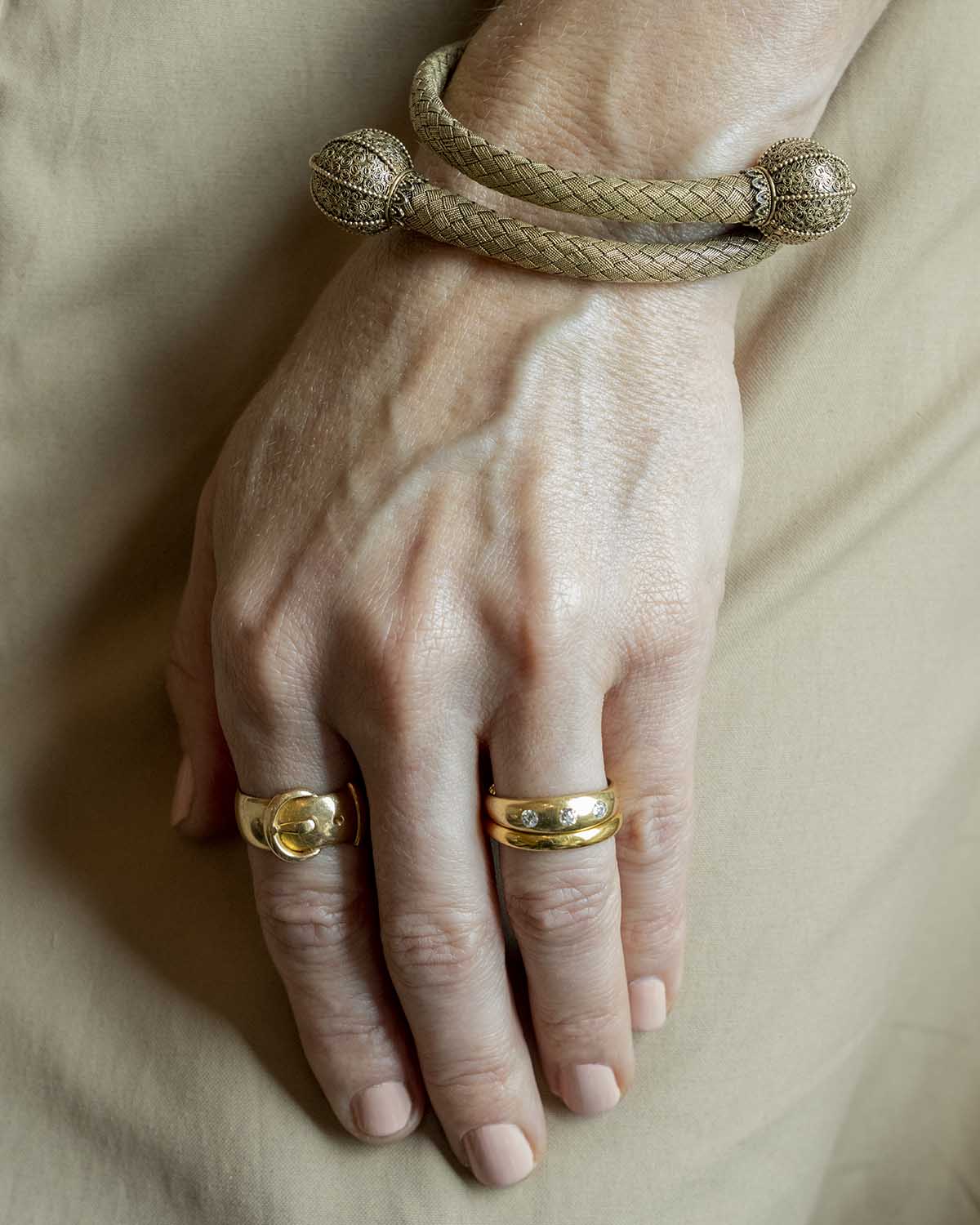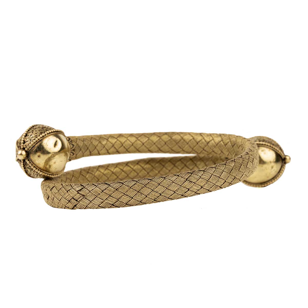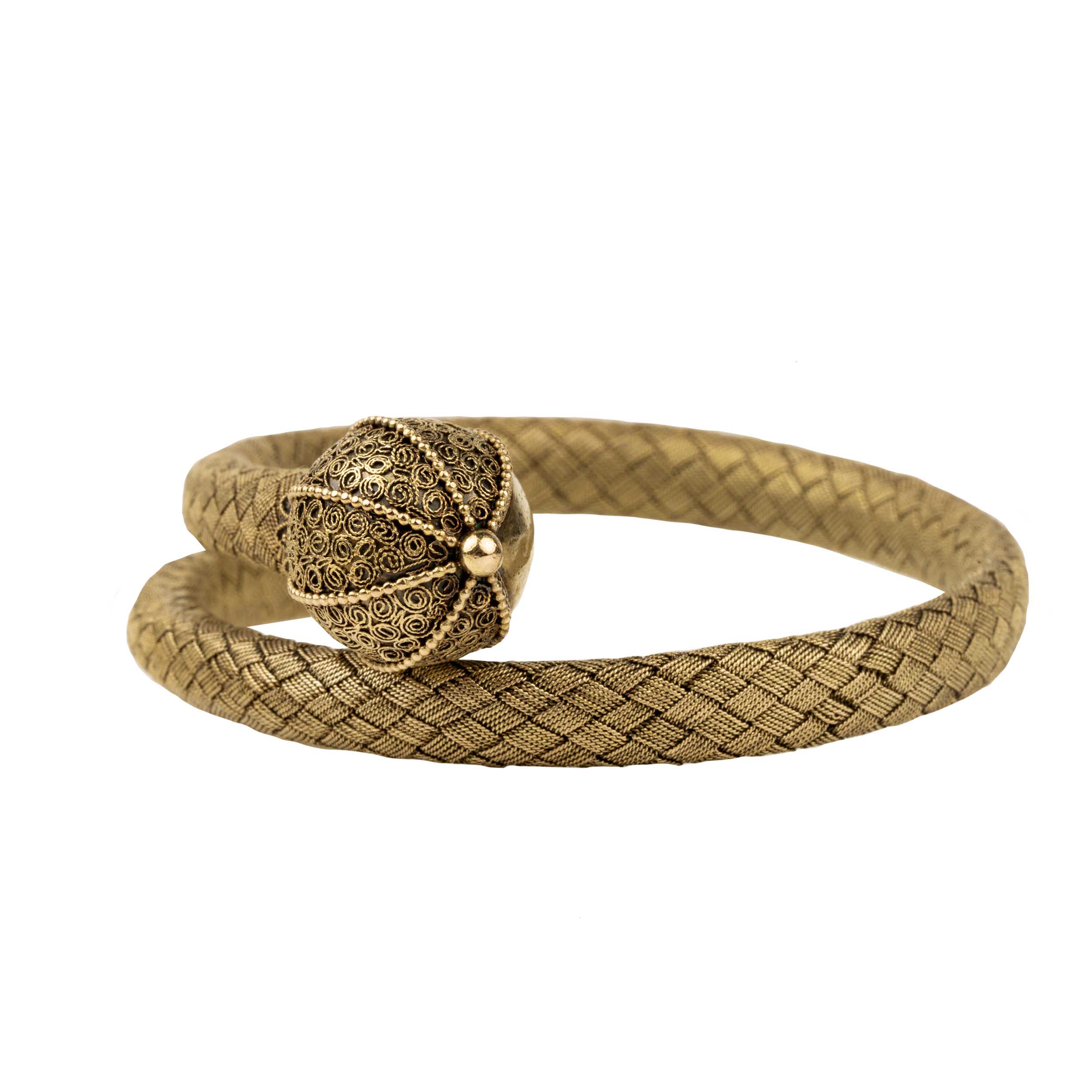 Victorian era Etruscan revival woven gold wrap bracelet, in 14k gold. Bracelet wraps around wrist and can fit most wrist sizes. Circa 1890.