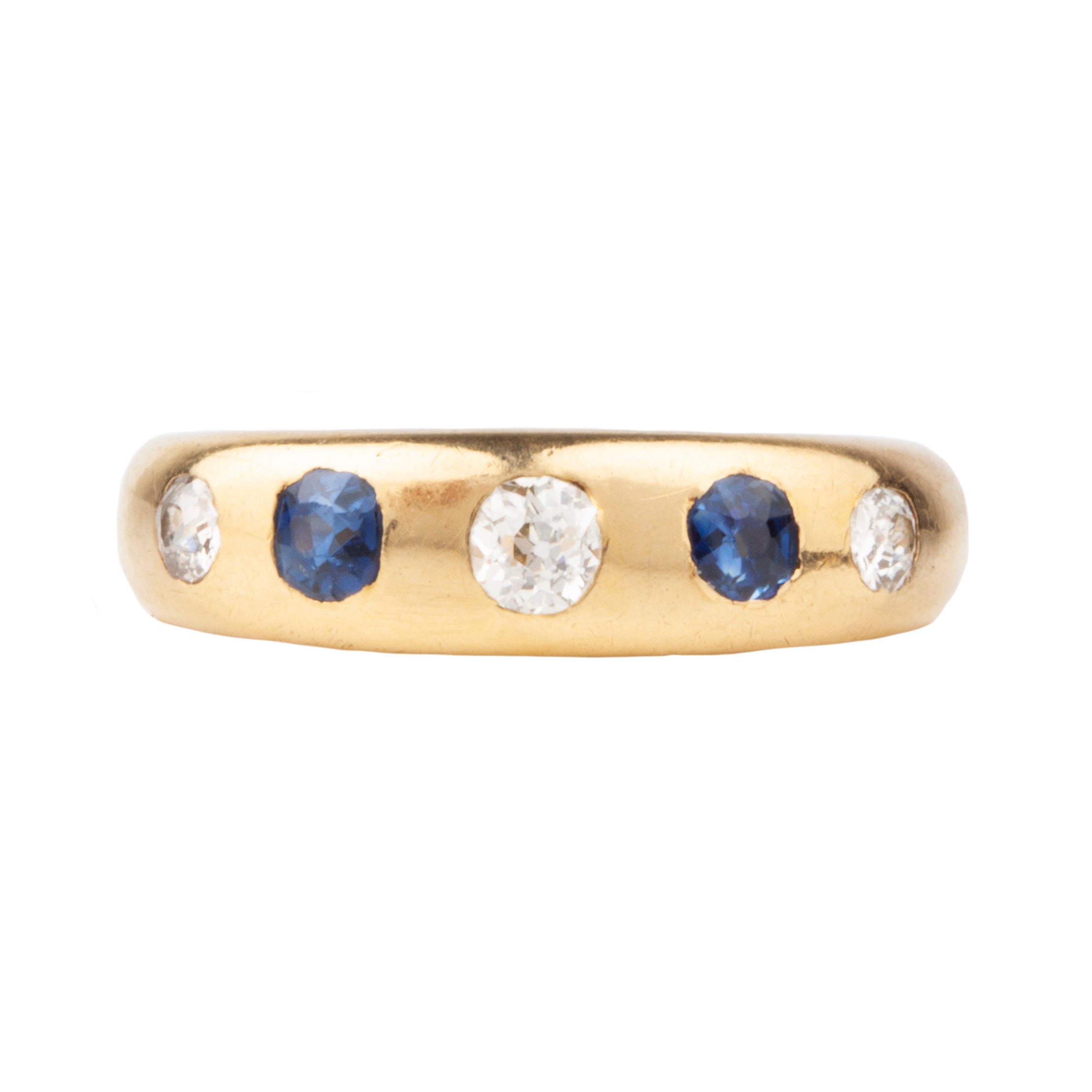 Turn of the century, five stone ring with three old mine cut diamonds and two deep blue sapphires. Set in a gypsy set 18k gold ring. English in origin. Hallmarks indicate the ring was made in Birmingham in 1912.