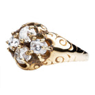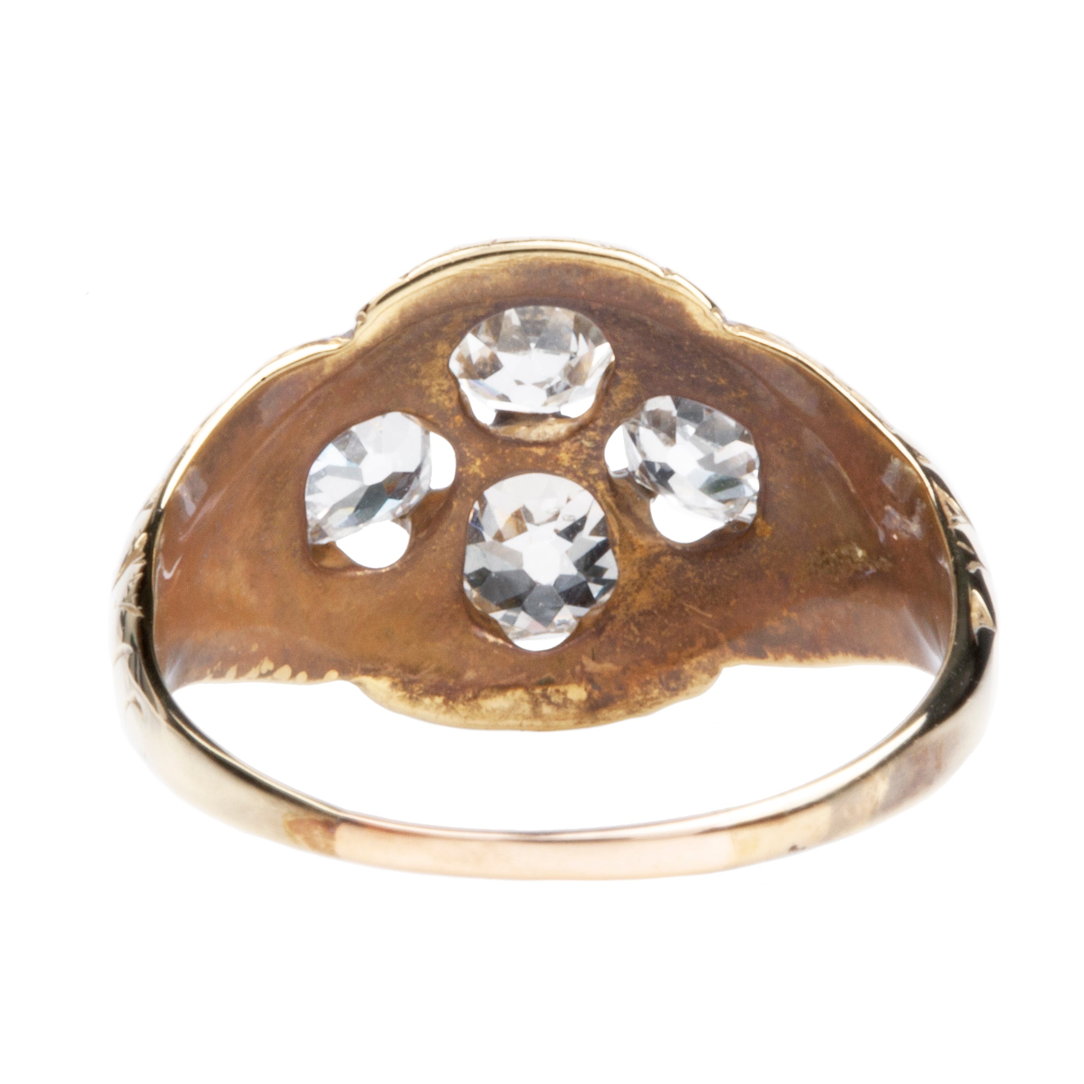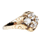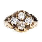 Victorian era four stone diamond cluster ring. Four Old Mine cut diamond set in 14k claw style settings, with engraved Victorian details. Approximately 0.90 carats in total diamond weight. English in origin. Circa 1890.