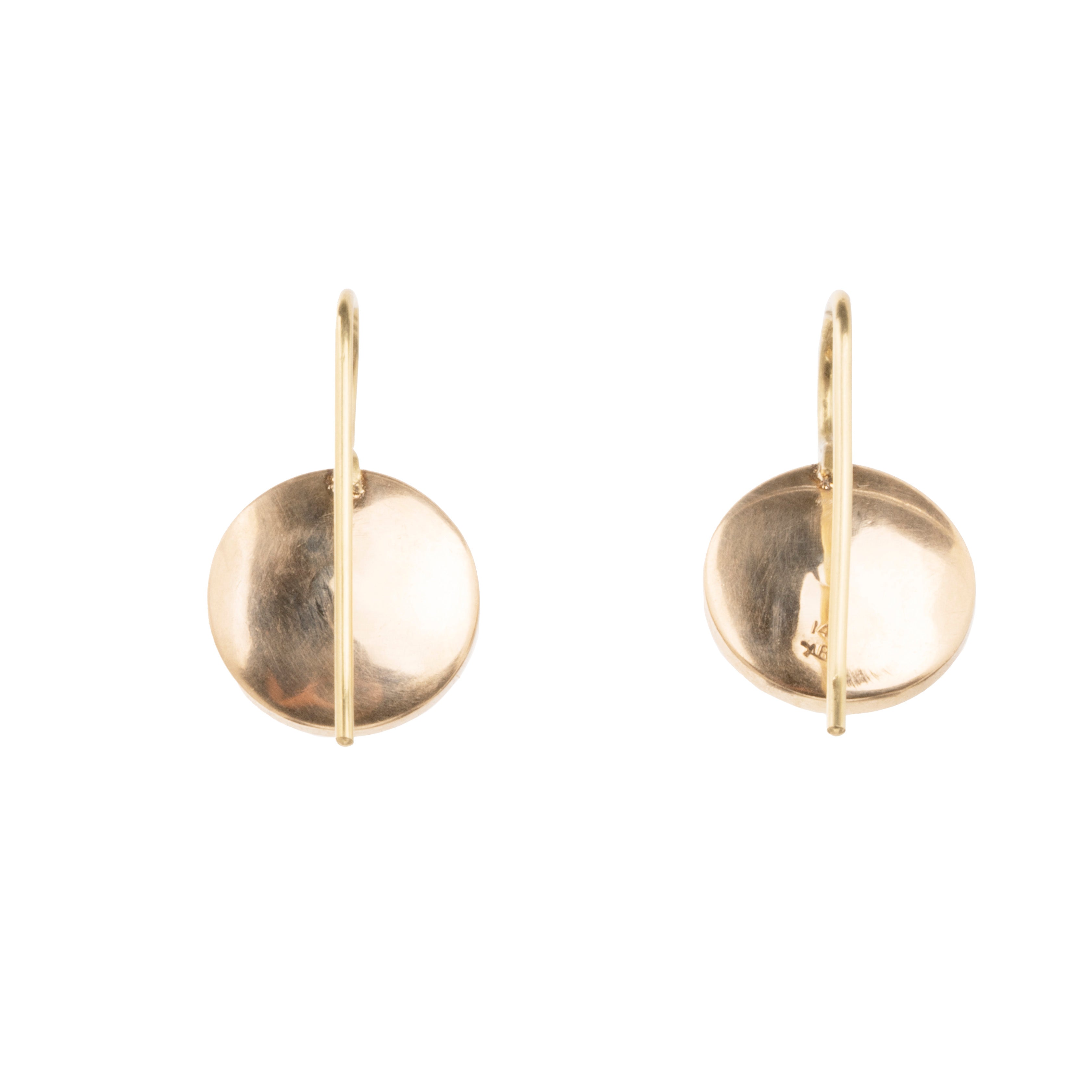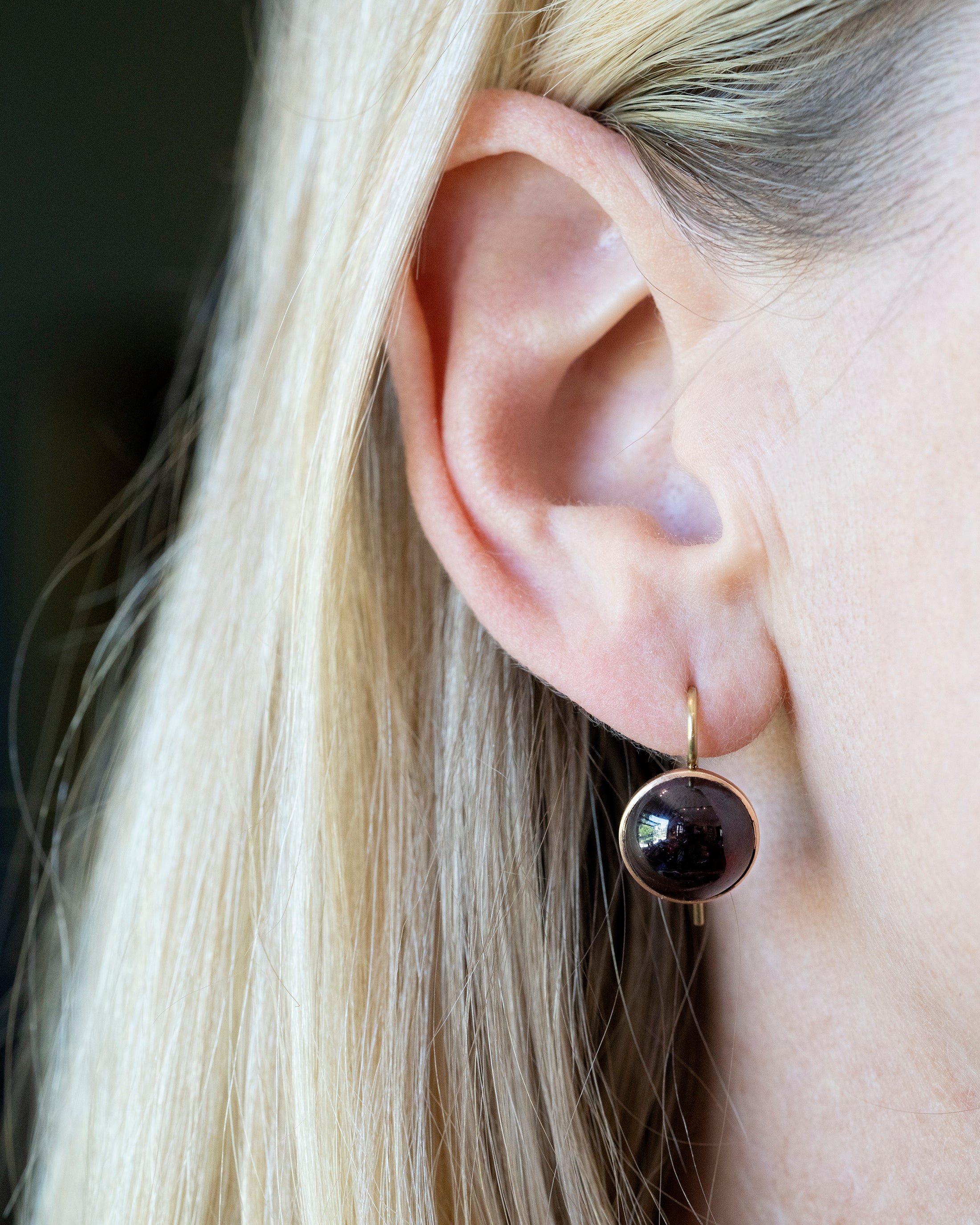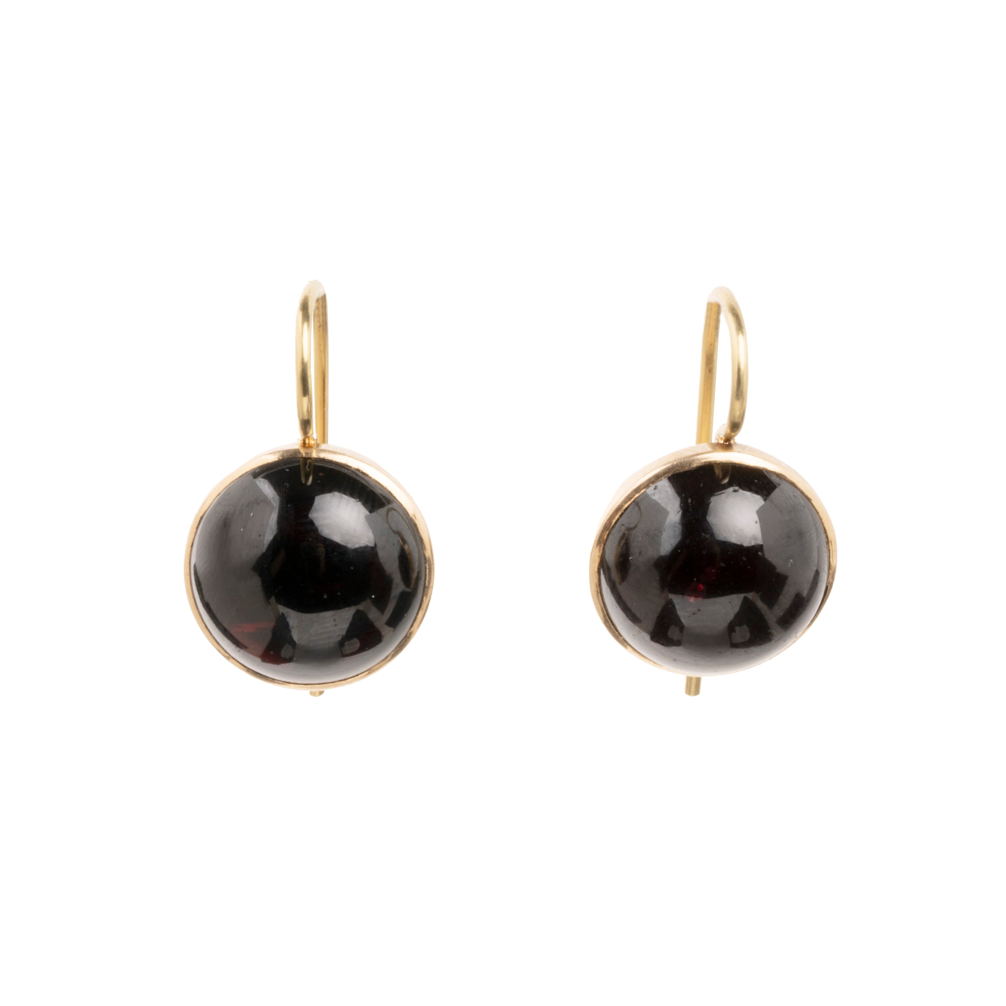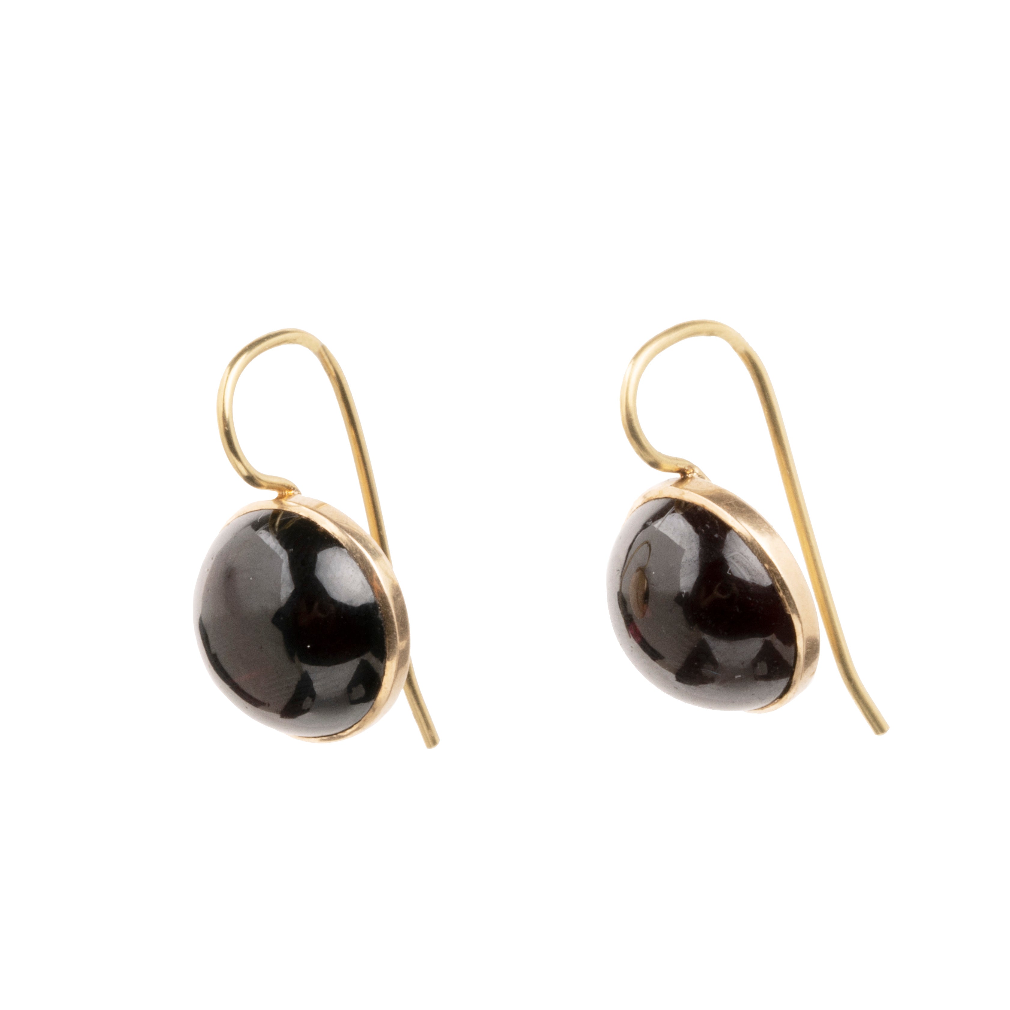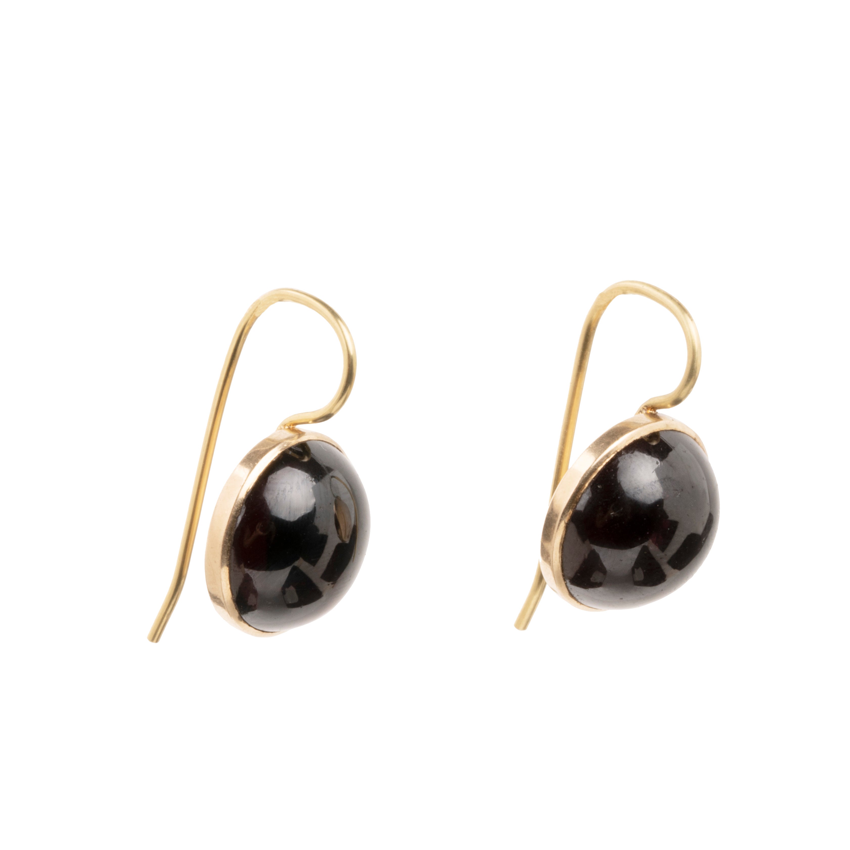 Victorian era cabochon garnet earrings. Dark red garnets are set in a closed back 9k gold settings, on 18k gold wires. What were once beautiful Victorian era buttons or cufflinks are now perfect everyday earrings. English in origin. Circa 1880.