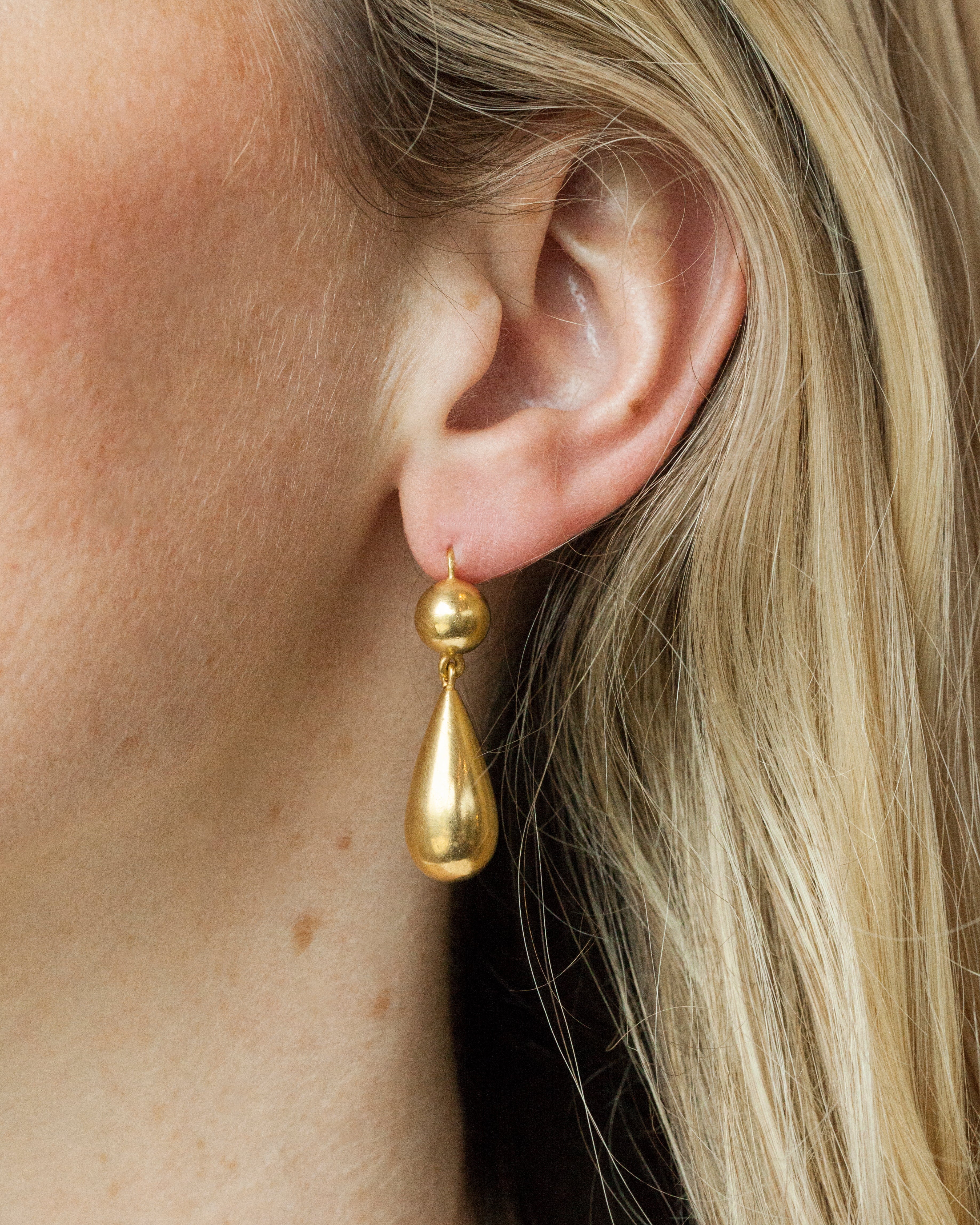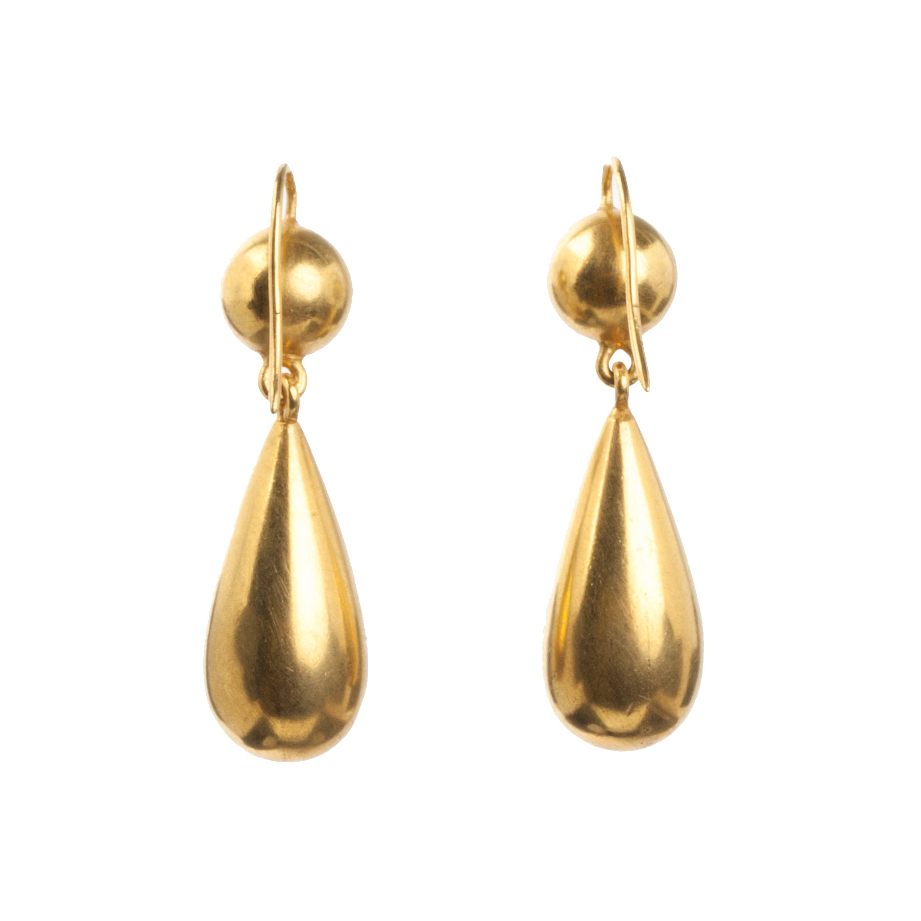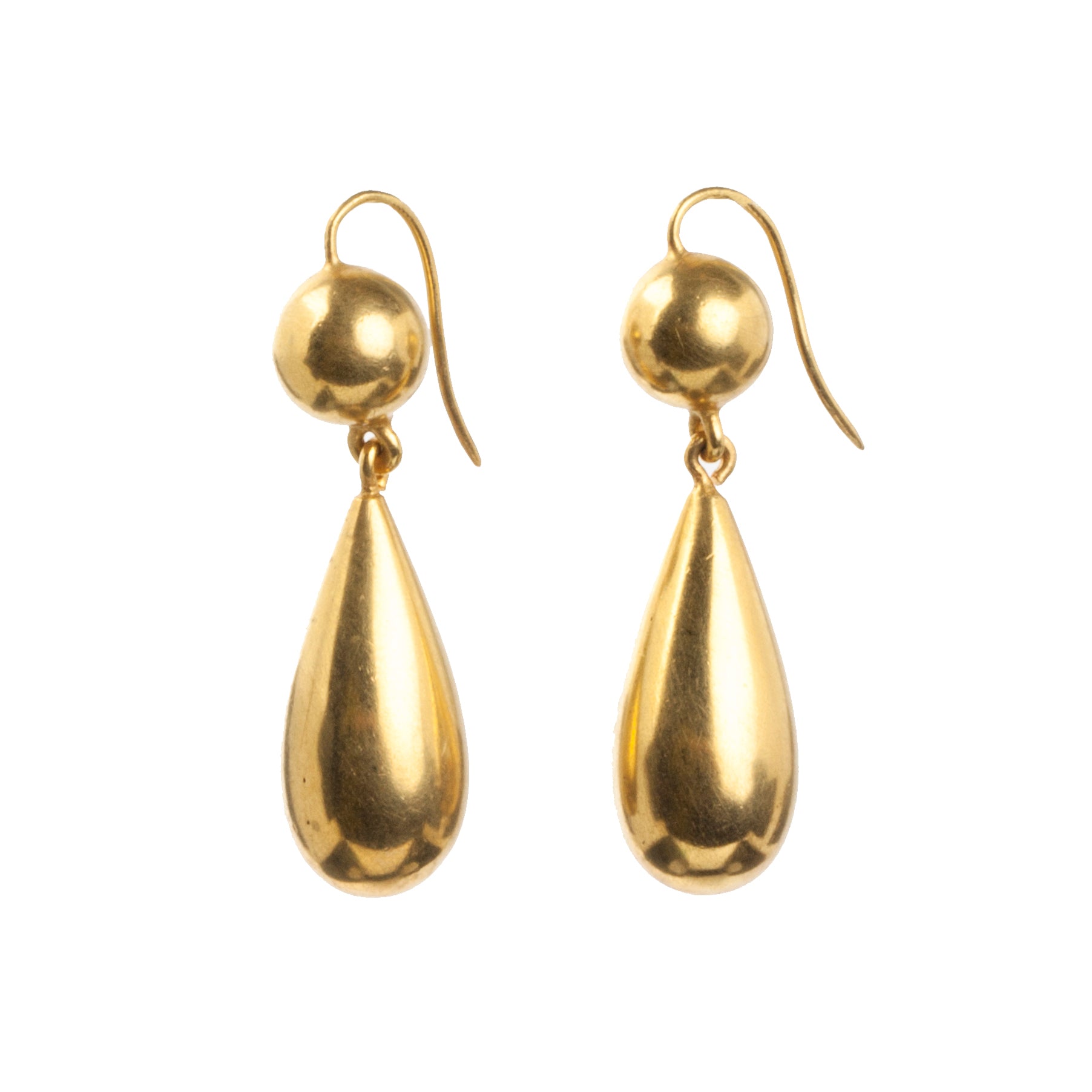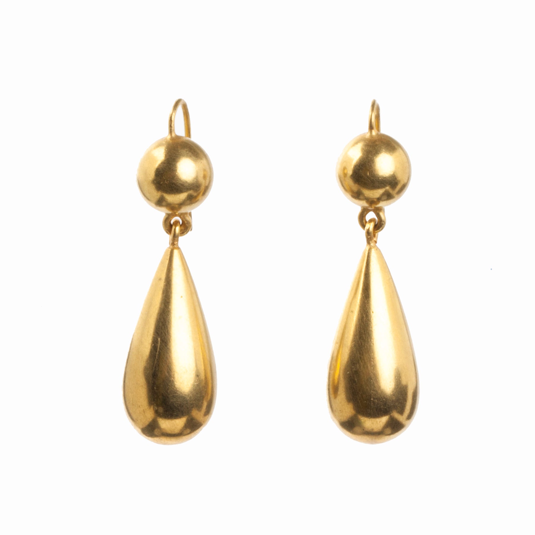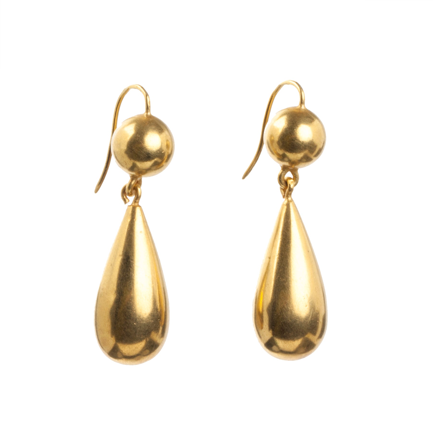 Victorian era gilded metal earrings in tear drop form. Their size and lightness were dictated by fashion and economic factors. The horizontal lines of style of dress and hair needed to be offset by drop pendants. Lovely everyday earrings. Circa 1870. English in Origin.
