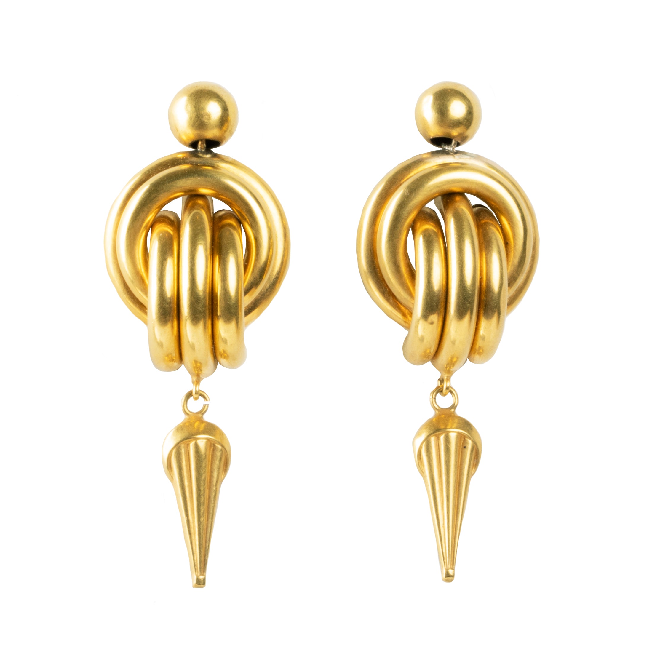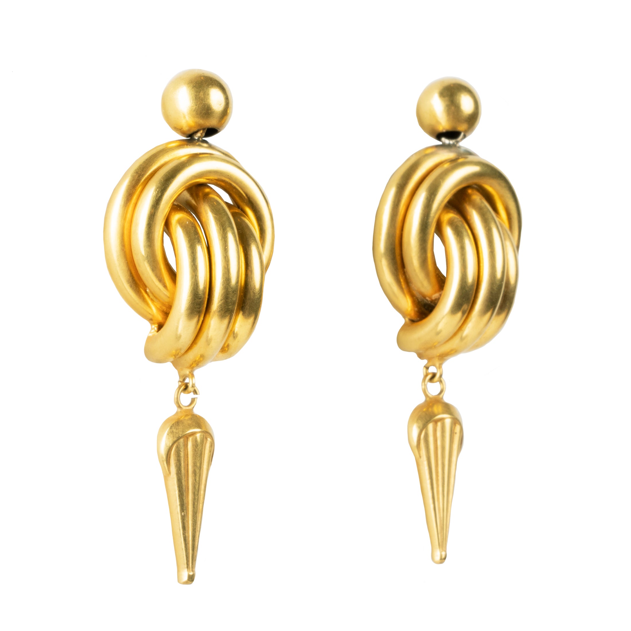 Victorian era gold earrings in brightly gilded 9ct gold. Double knot motif with pointed drops. English in origin. Circa 1870.
