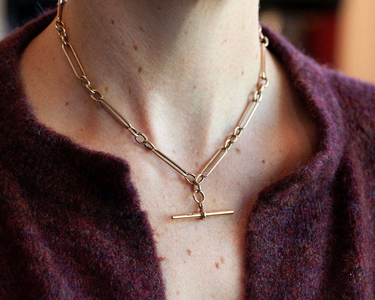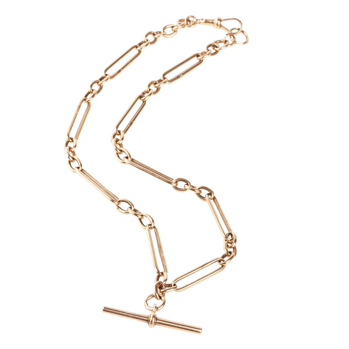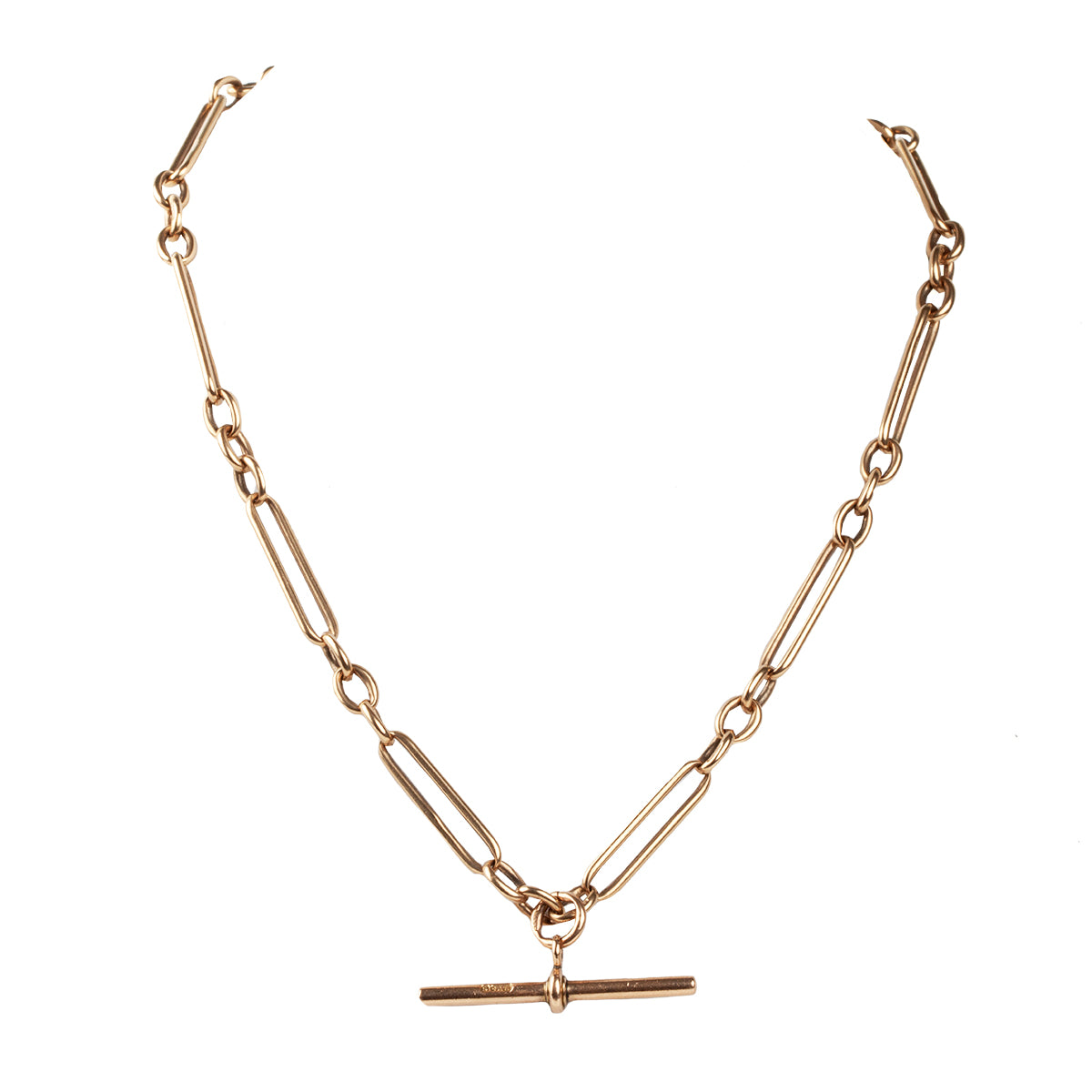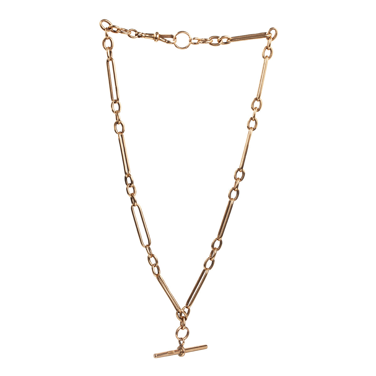 Victorian era 9k rose gold Albert watch chain necklace, with elongated links. Perfect for everyday wear. English in origin. Circa 1880. Nice and heavy links are individually hallmarked with English marks for 9k gold.