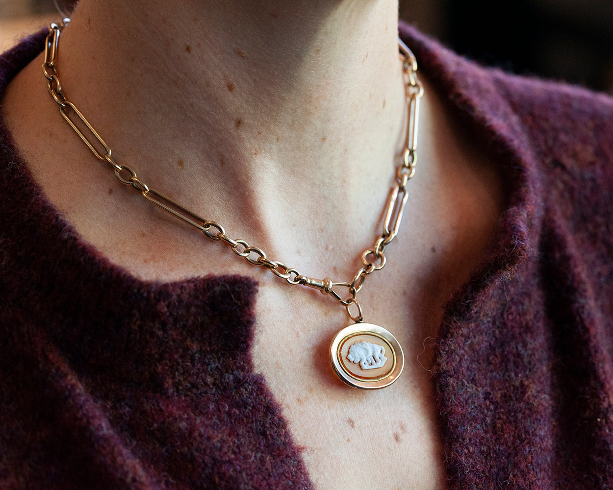 Measures 16" in length and .25" in width. Photographed with a Victorian lion and cherub cameo locket.
