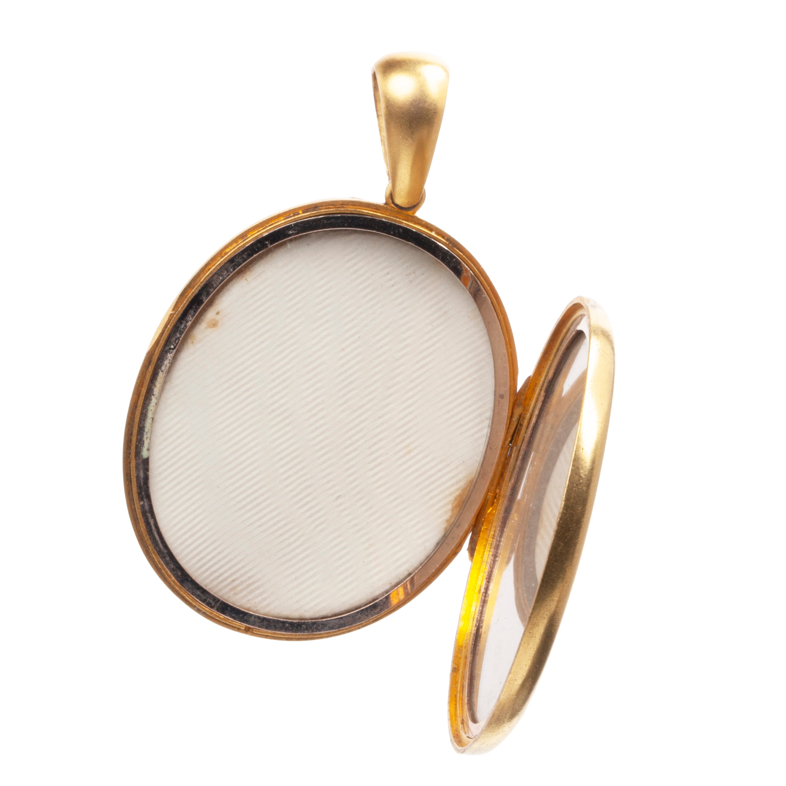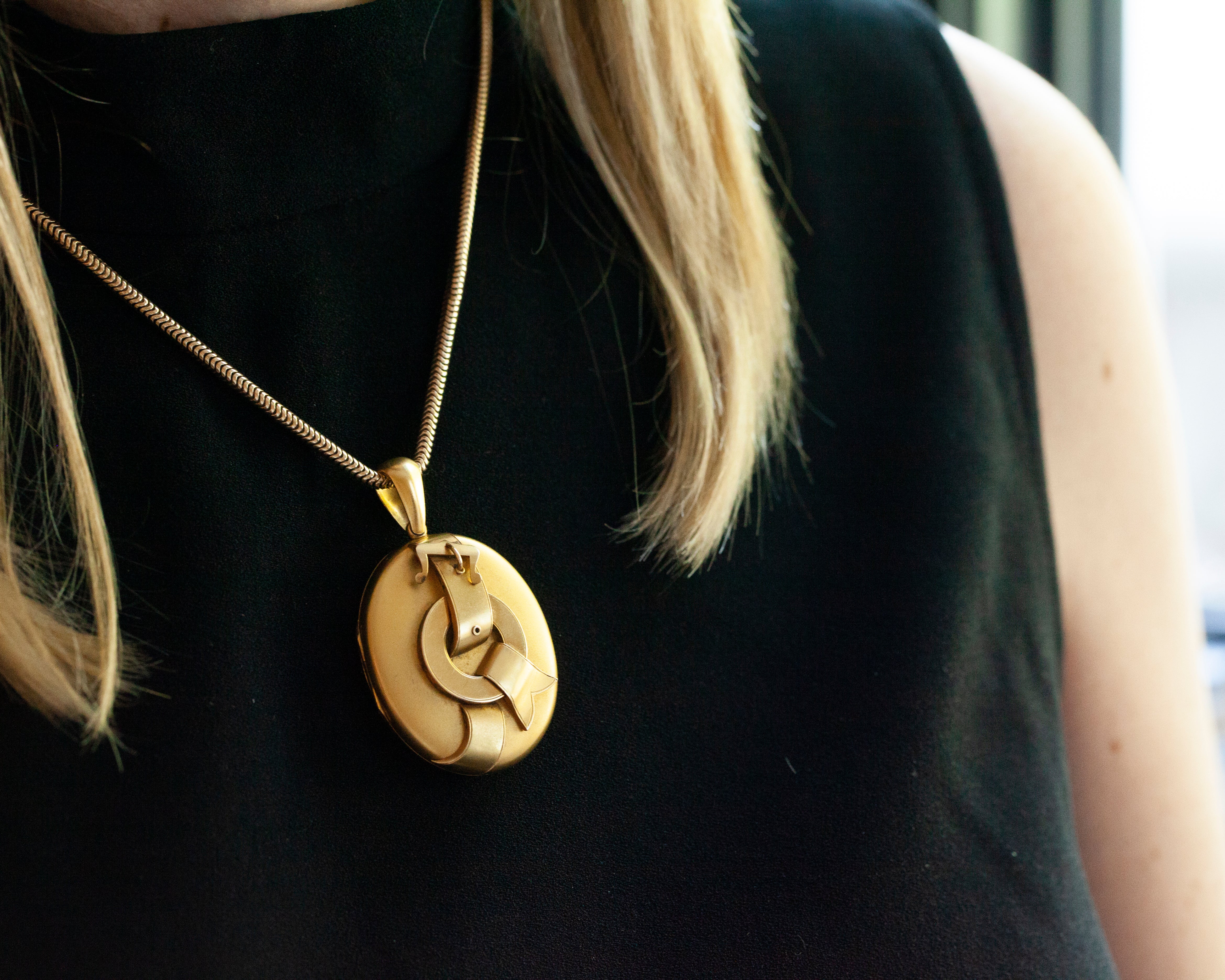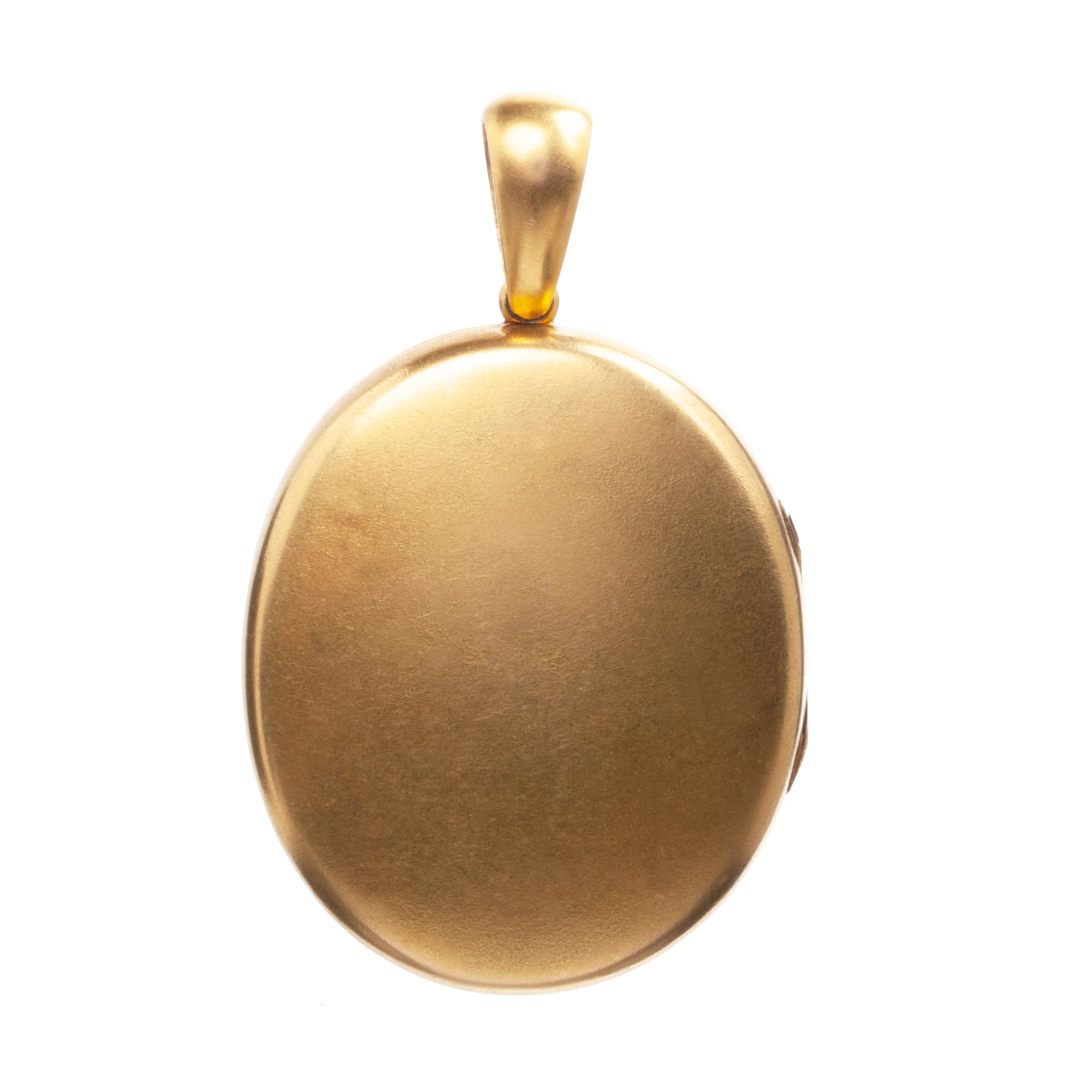 Measures 2.25" in length and 1.25" in width. The locket hangs on a Victorian 17.25" snake chain 9k gold chain, which is sold separately. Antique chains are available in-store. Please call the shop to inquire.
