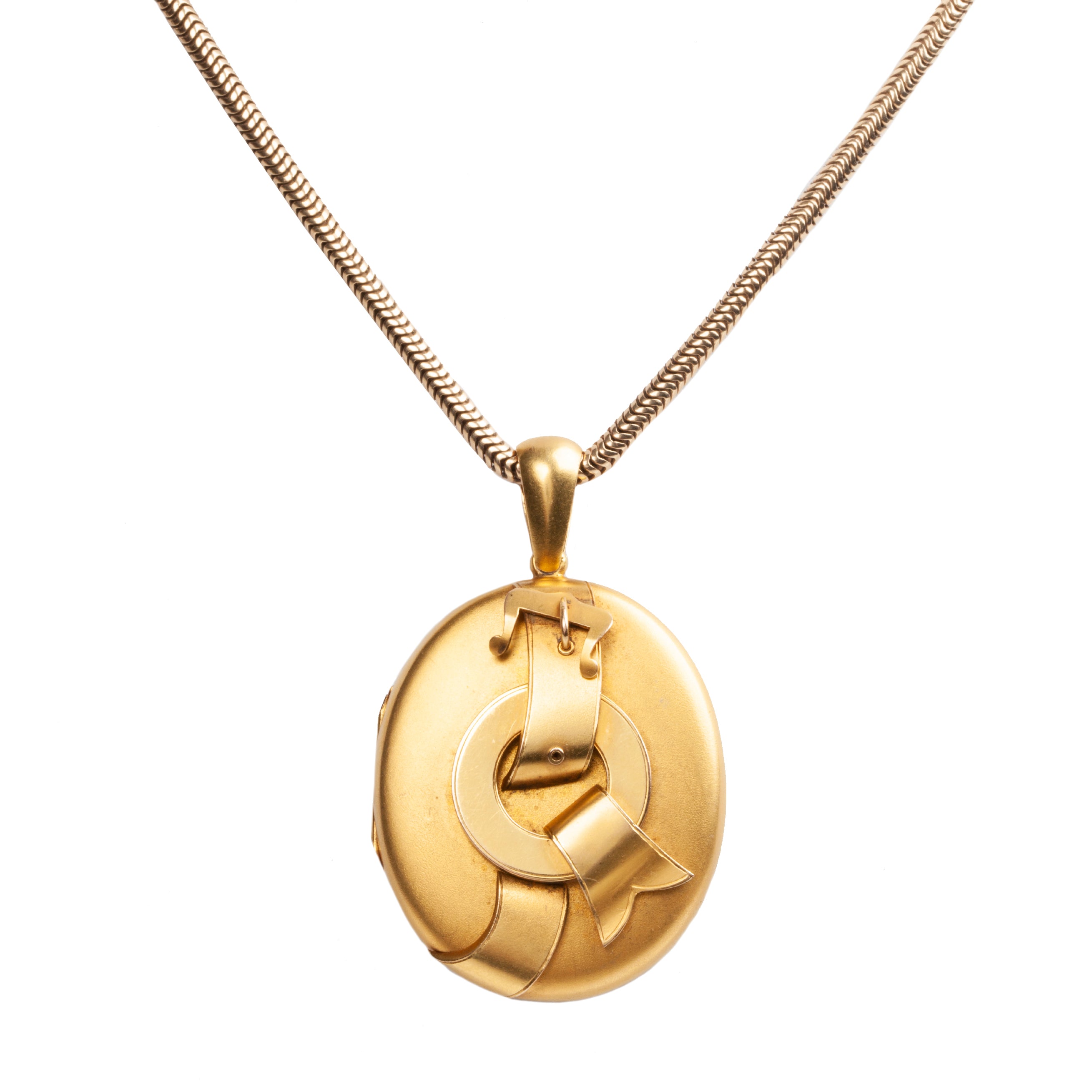 Victorian era 18k gold locket with a buckle motif. Beautiful original bloomed finish. The buckle is a Victorian era symbol of loyalty strength and protection. The original frame and glass is still intact. English in Origin. Circa 1870.