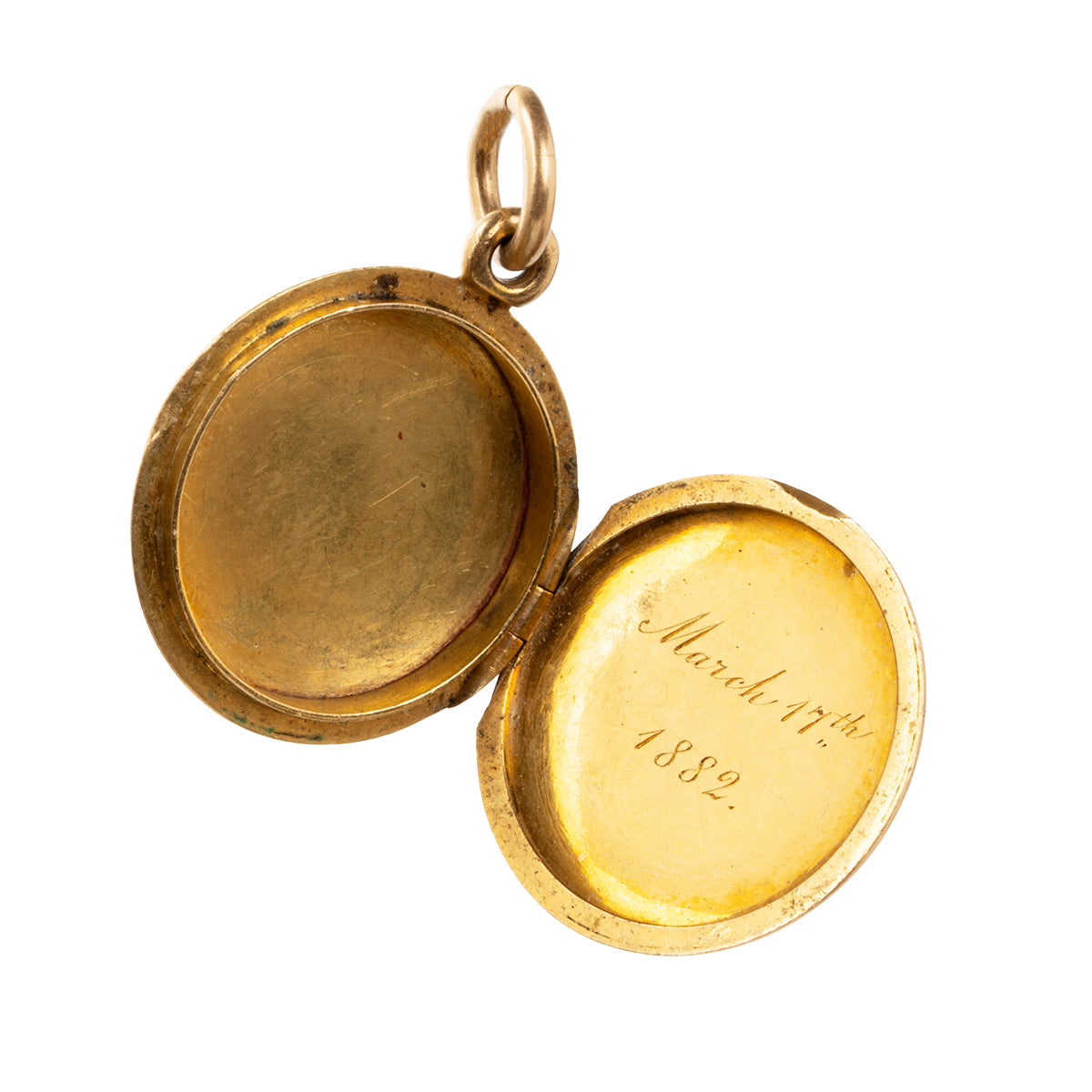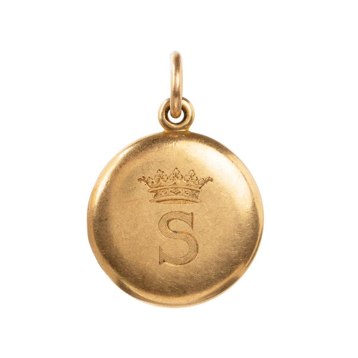 Victorian era gold locket, in 18k gold. Hand engraved 'S' and a coronet crown. Provenance: was given as a birthday gift to Lady Selborne in 1882. Additionally engraved 'March 17th'.