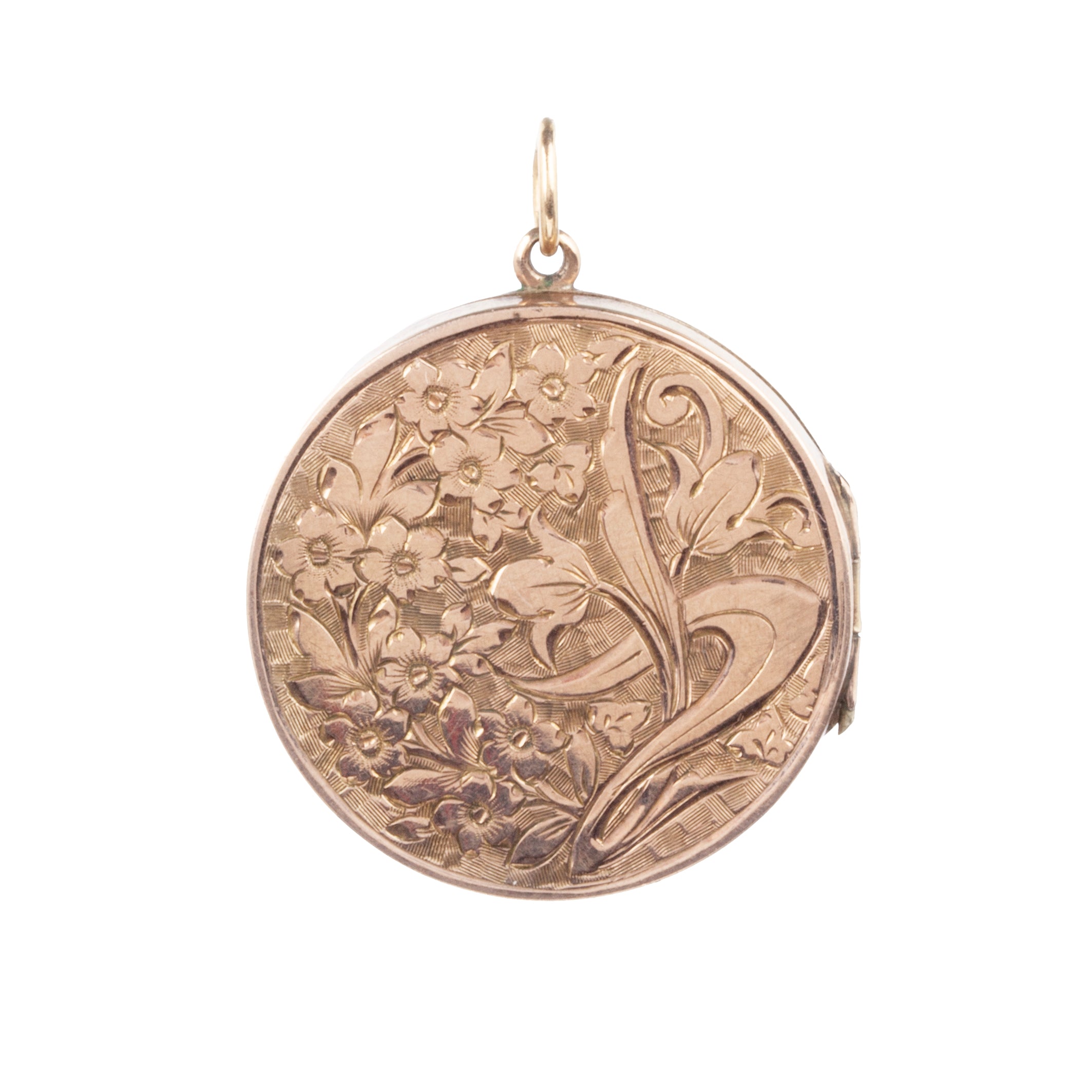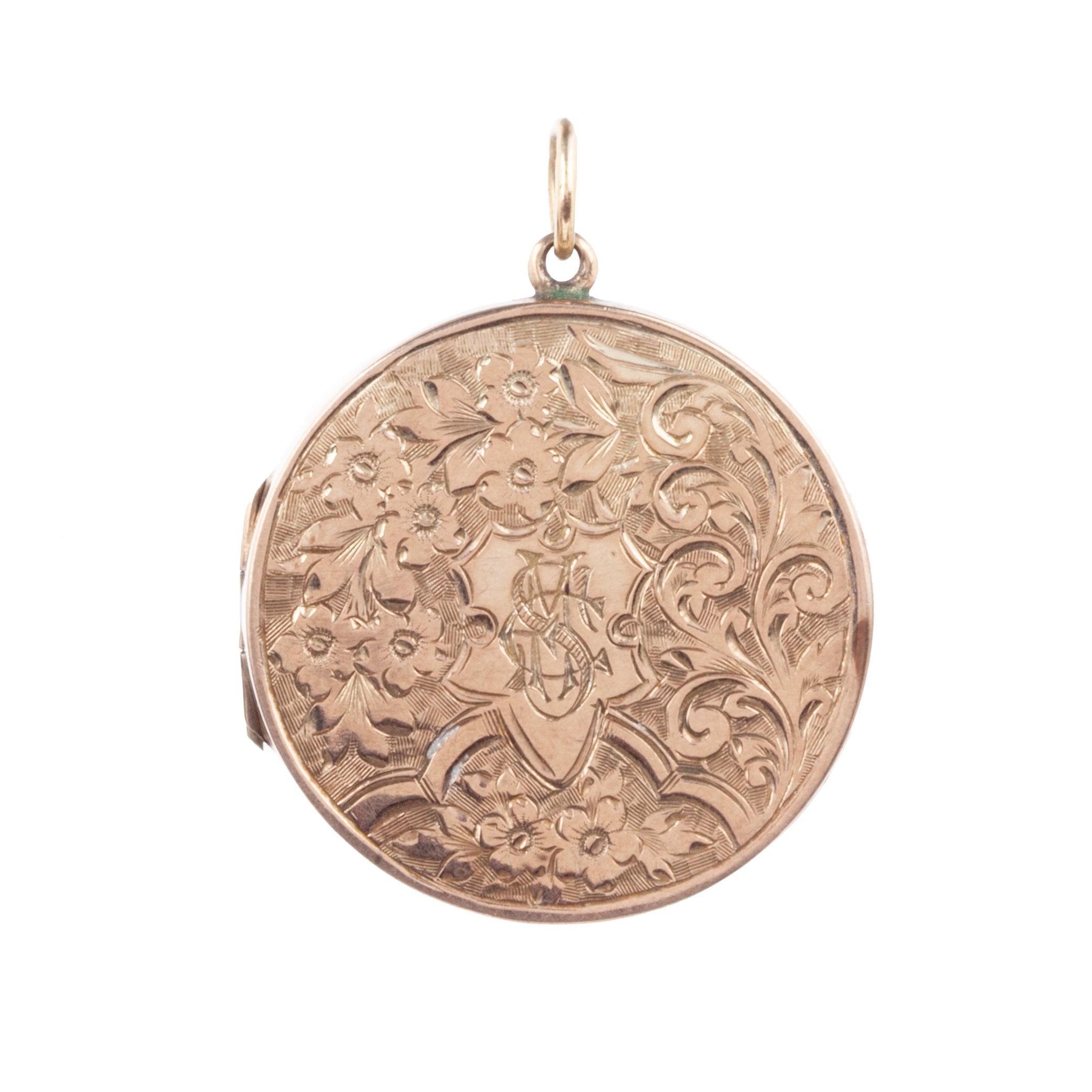 Victorian era round locket, in 9k gold. Beautiful engraved floral details and the monogram " MSC" or "CSM". English in origin. Circa 1890.