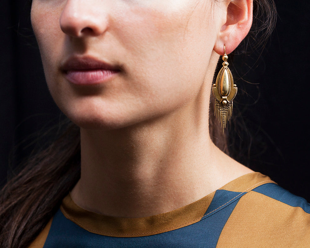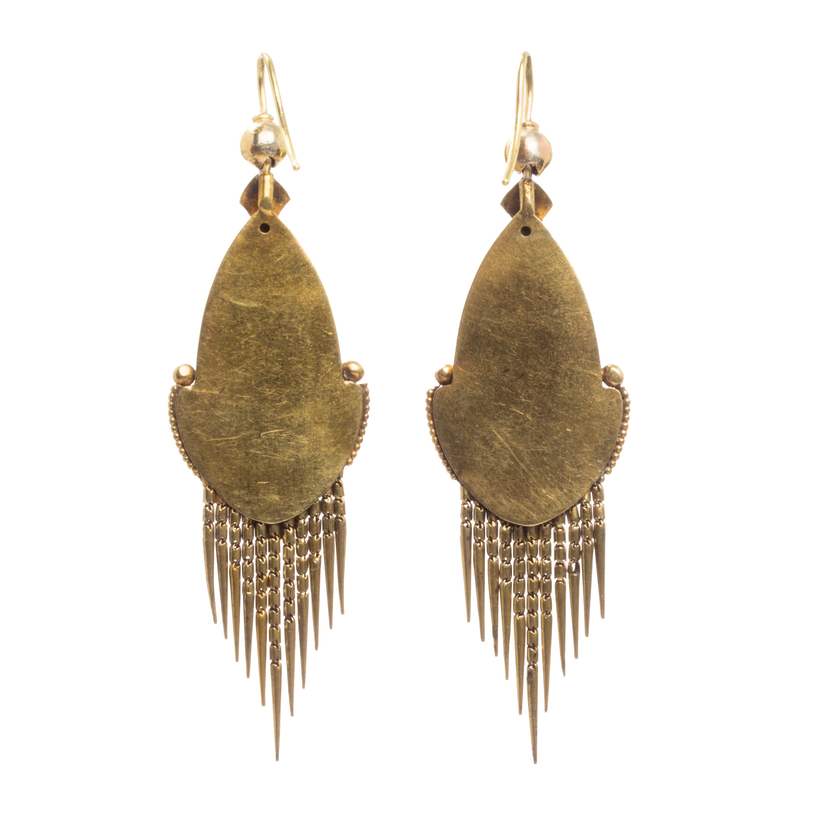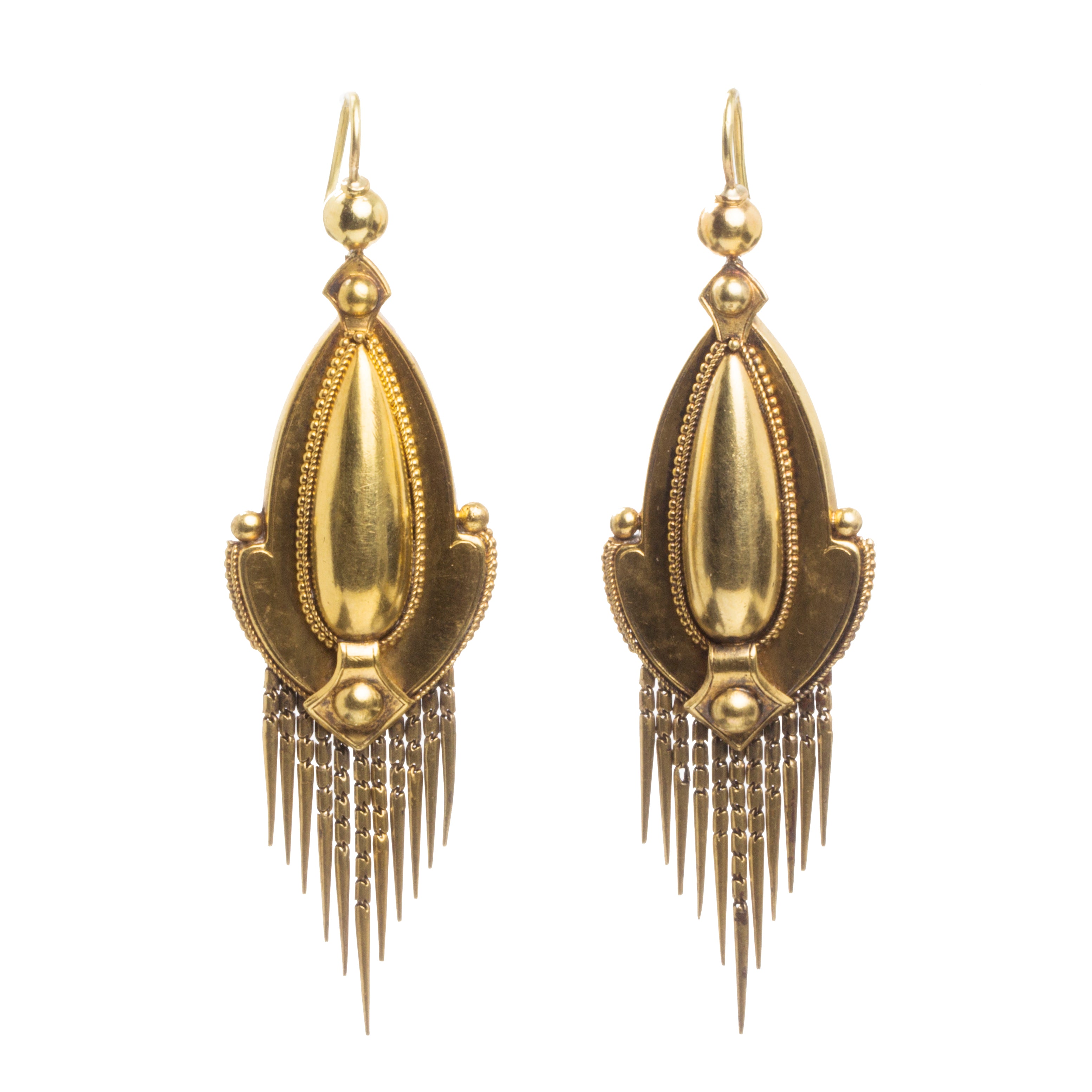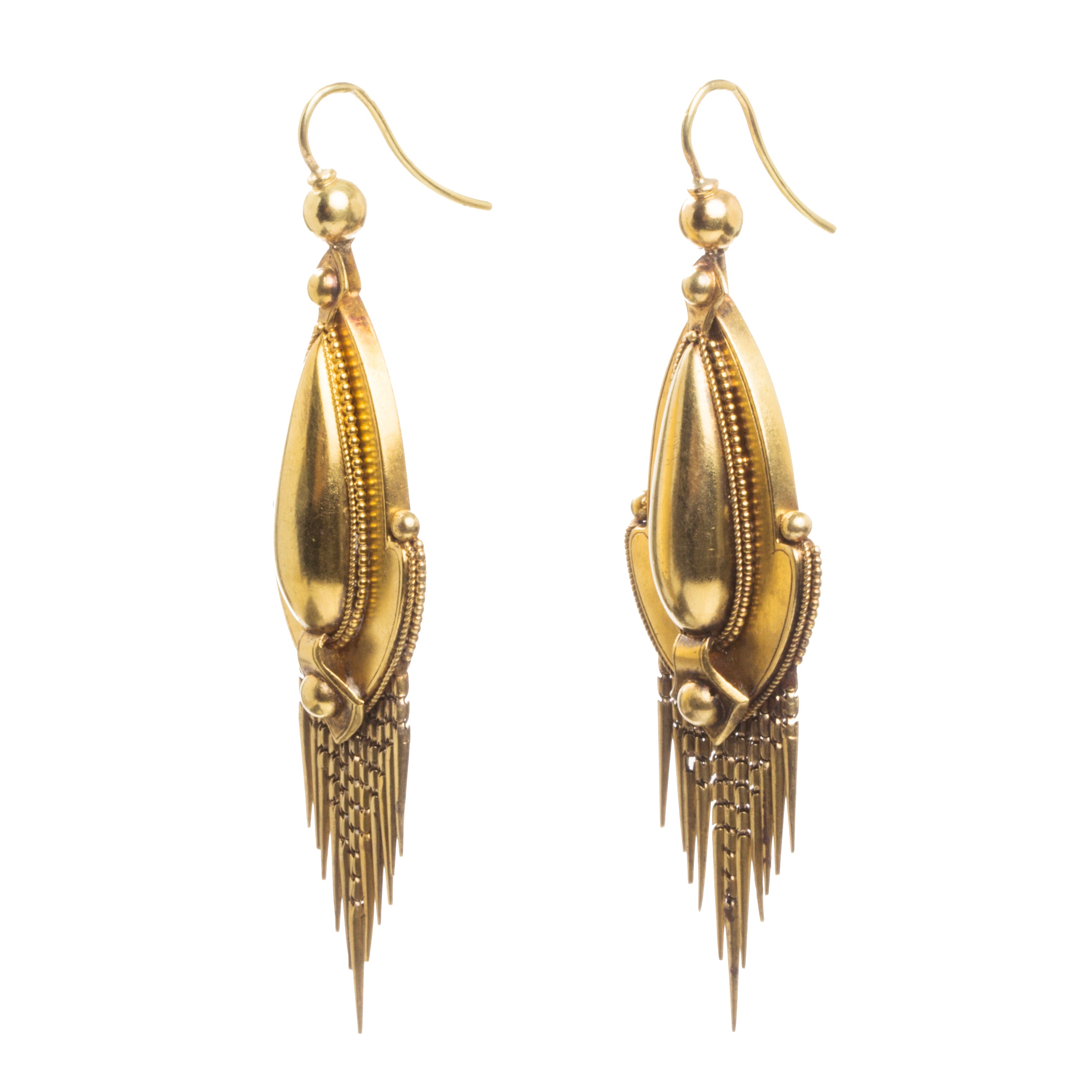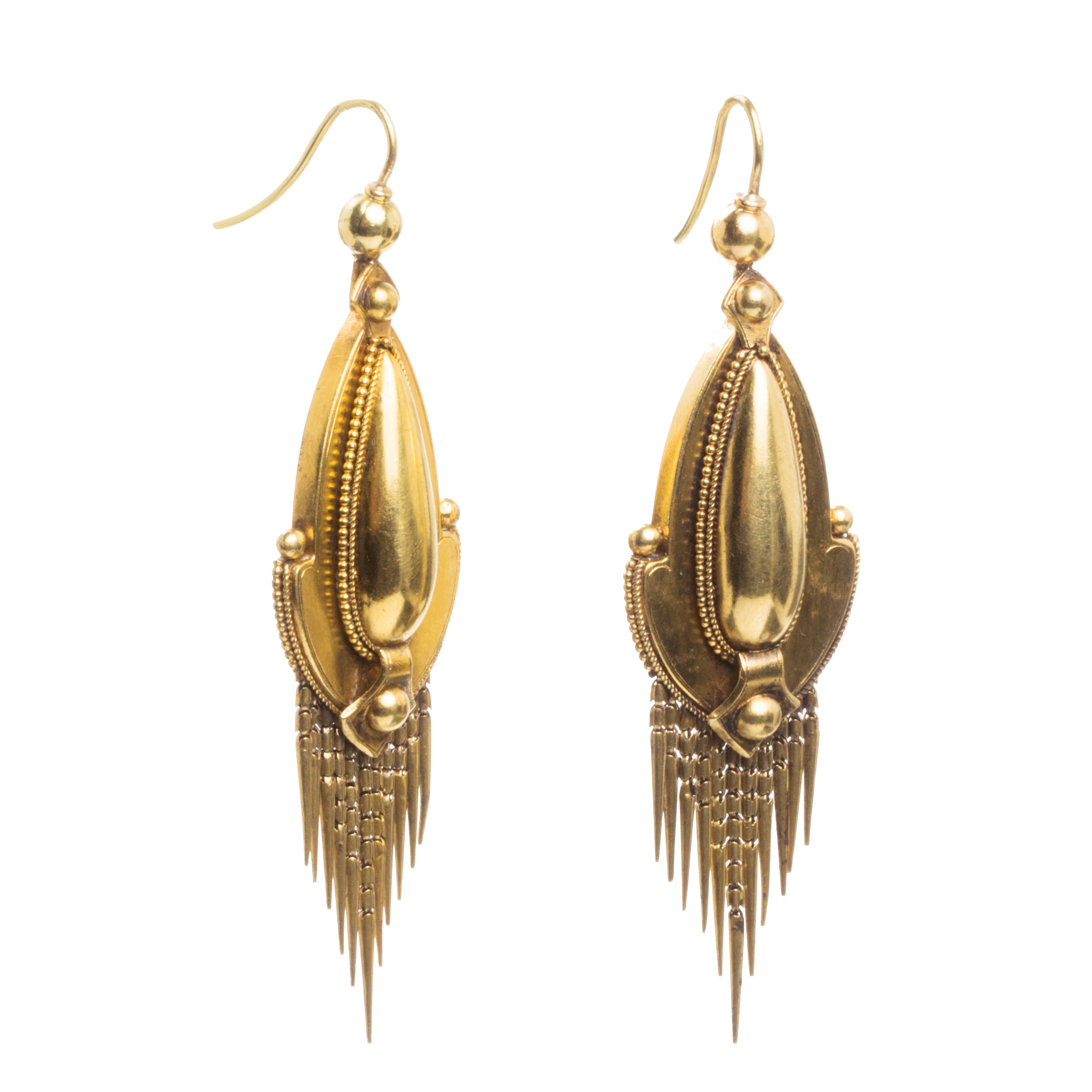 Victorian era 15k gold earrings. All fringe present and perfect. Light weight and very wearable. The dagger tassel details have great movement. English in origin. Circa 1870. Found in London.