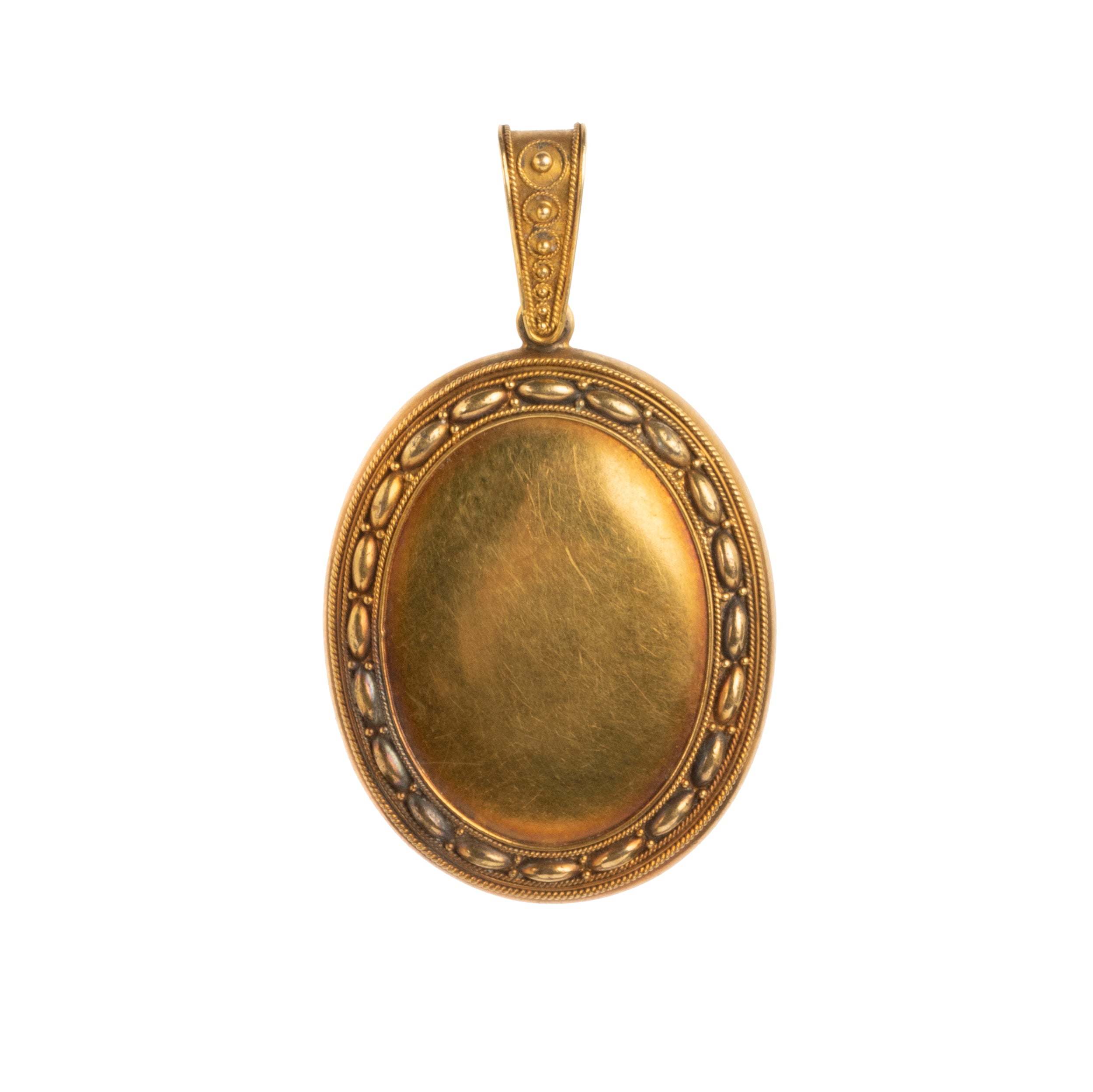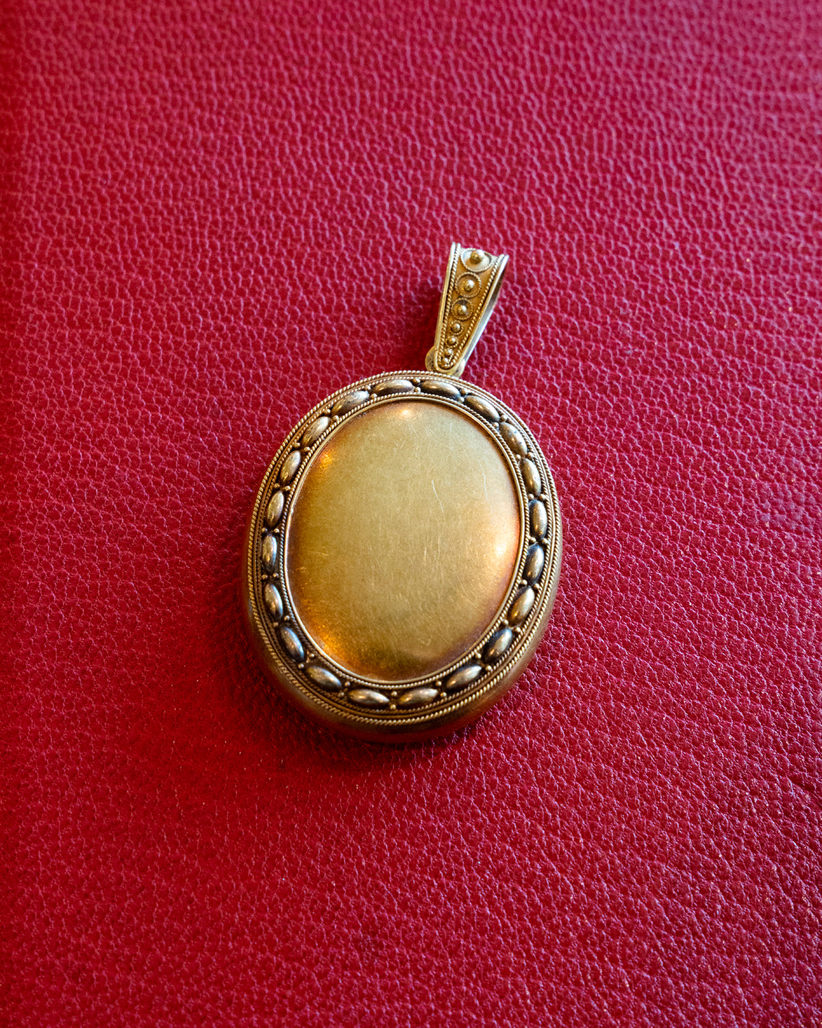 This 18k gold locket is in wonderful condition, a restrained design for the period. The original glass and frame are intact and ready for your own photographs. The locket has acquired a lovely dark patina over the years. English in origin. Circa 1870.