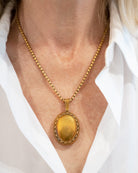 Measures 2." in drop length and 1.25" in width. Antique and modern gold chains are sold separately and are available in-store. Please call or email the shop to inquire.