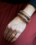 The back of the bangle reveals wear and age with minor denting. The bracelets are a small size with an inner circumference of 6" and 1.25" wide.
