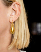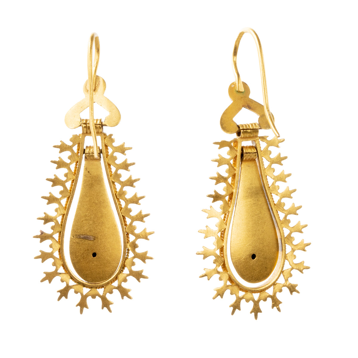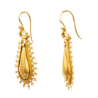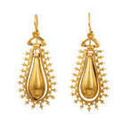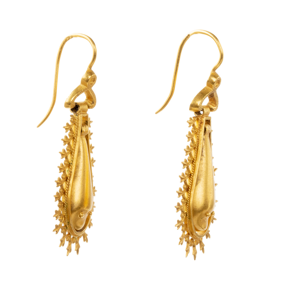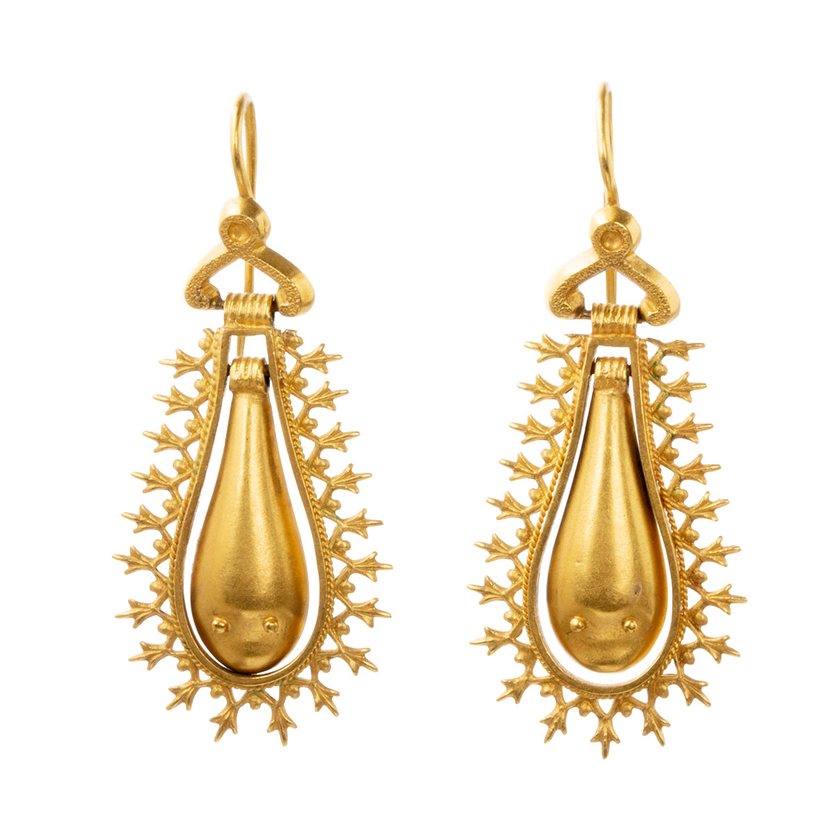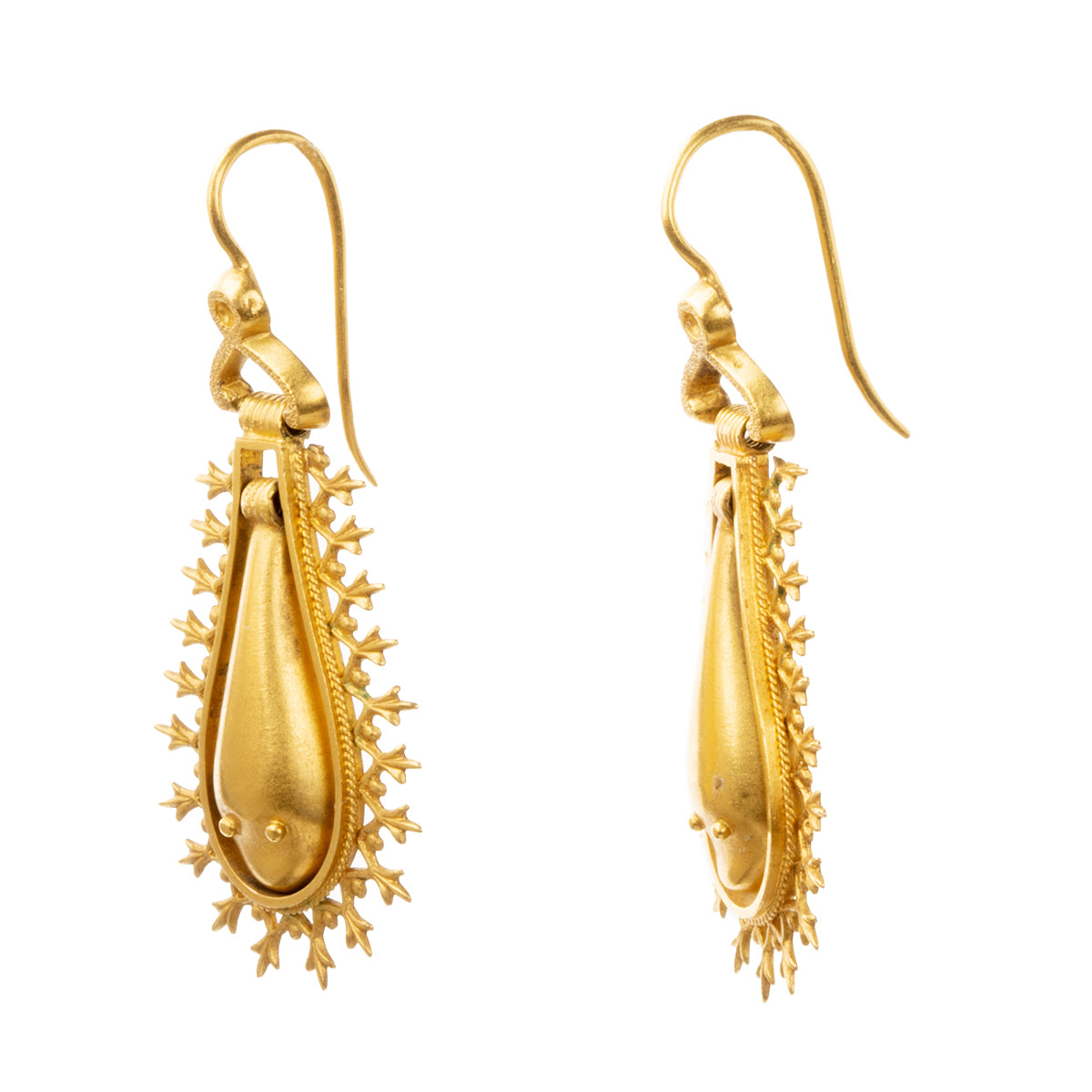 Victorian era gold drop earrings. Gold dangles with snake head pendulum drop in an Etruscan revival style. English in origin. Circa 1870.