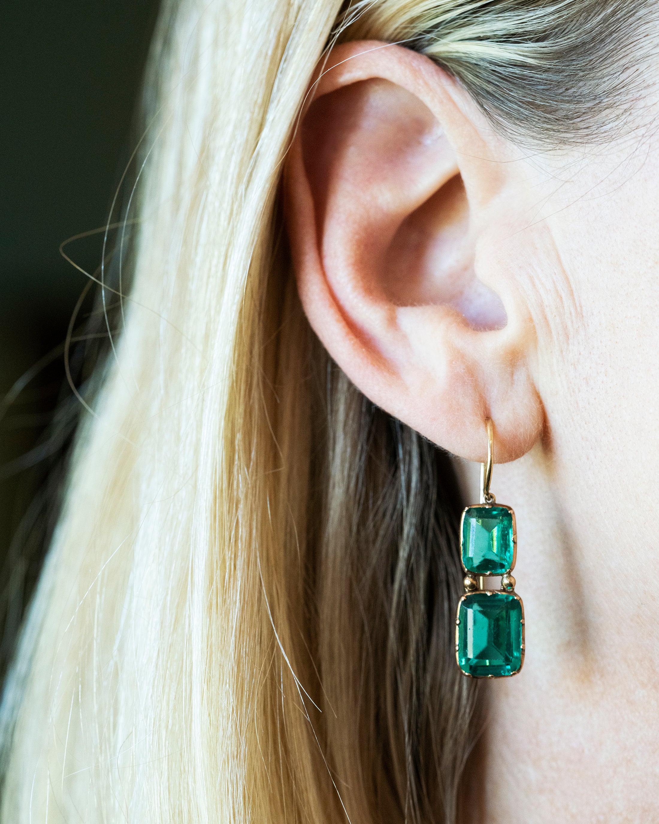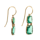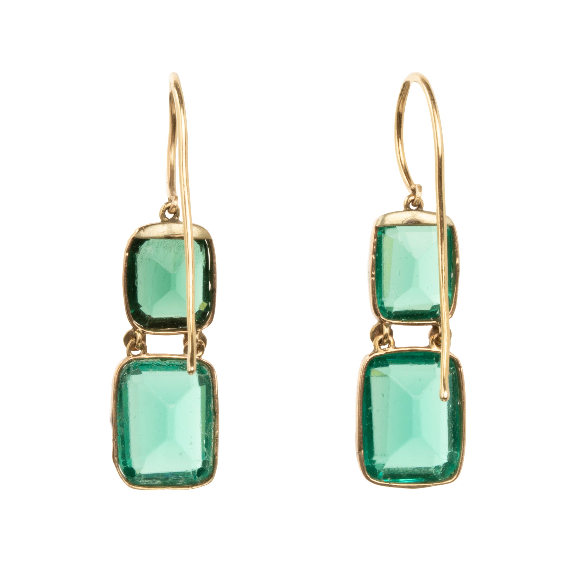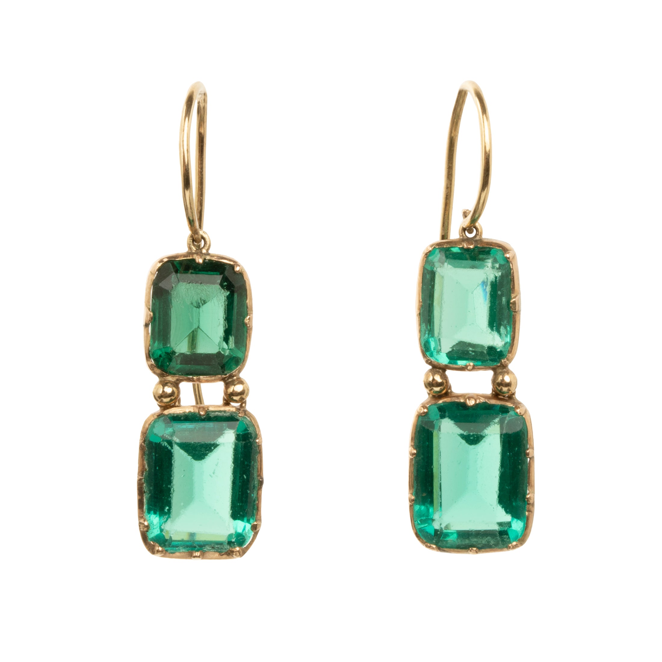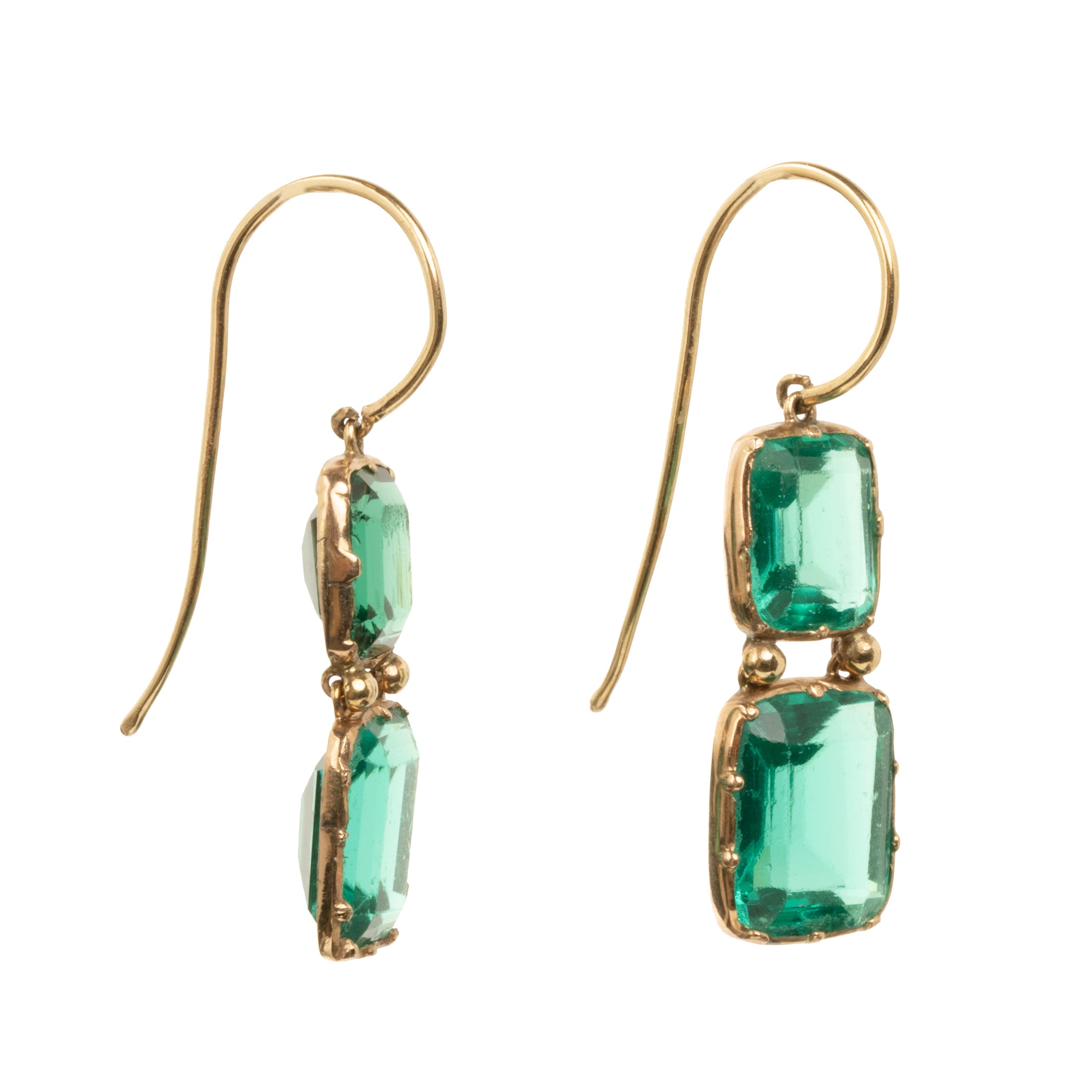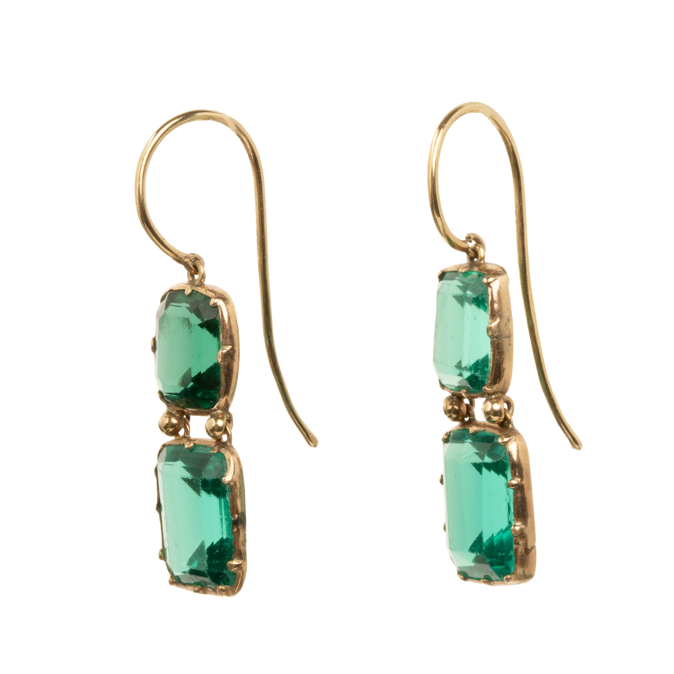 Victorian era green paste earring, in 15k gold. Once elements of a larger piece, later converted into earrings. English in origin. Circa 1850.