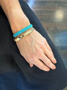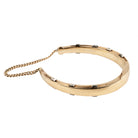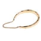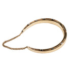Inner circumference measures approximately 5.5" and it hinged with a gold safety chain. This bracelet can fit a small - medium sized wrist. Measures 1/2" in depth.