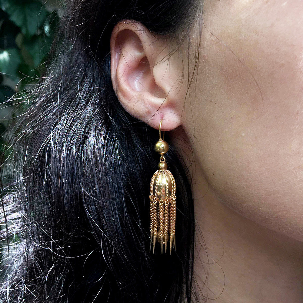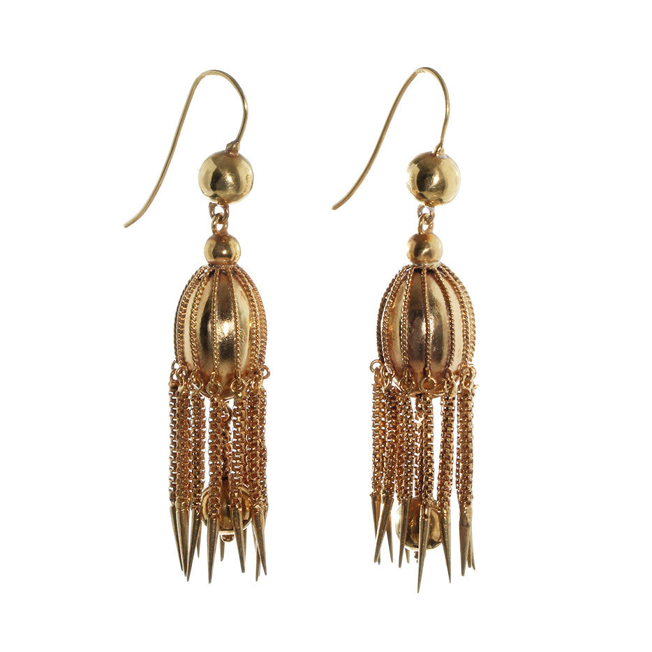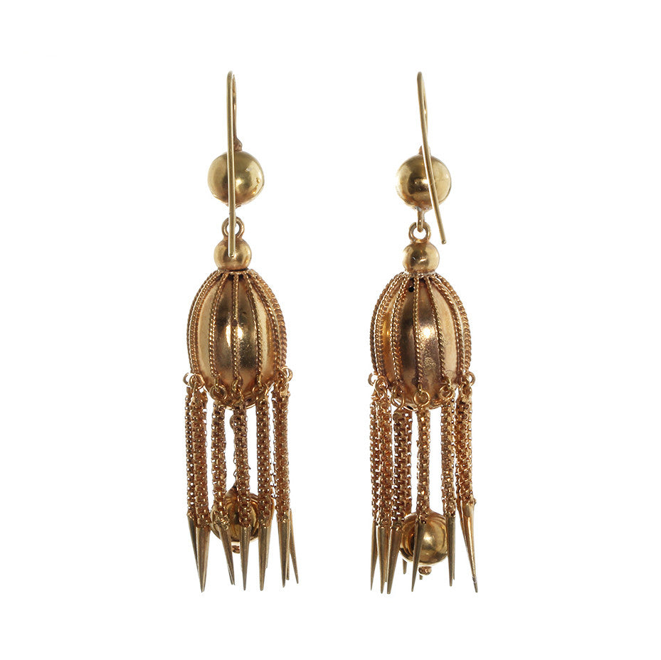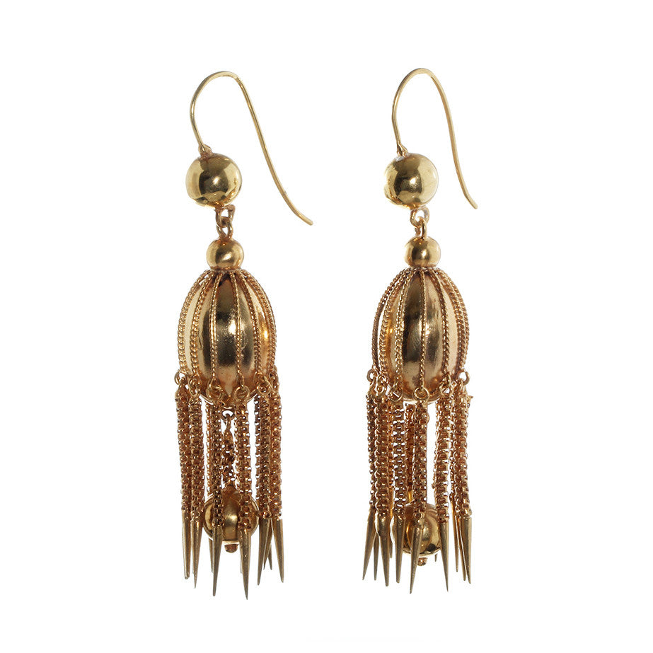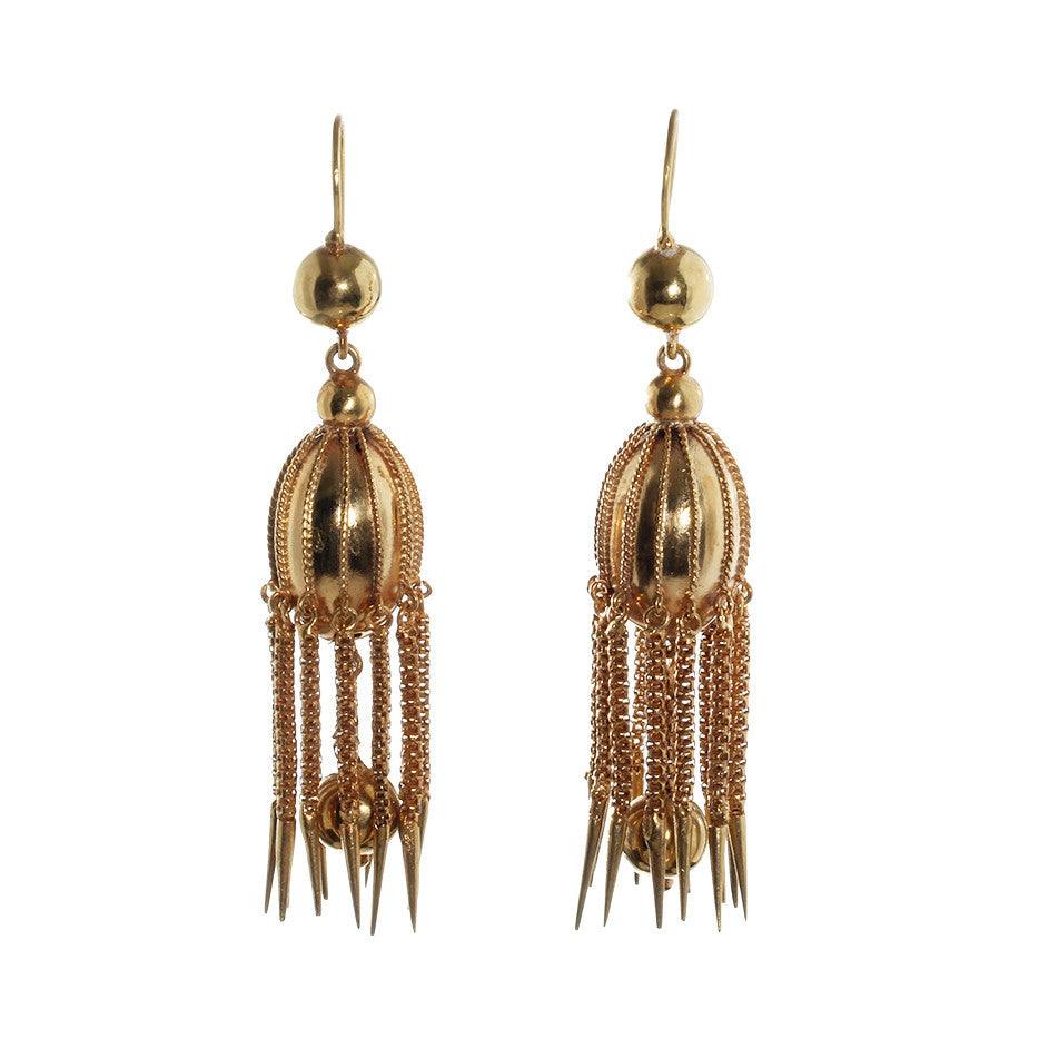 Victorian Era dagger tassel earrings, in 18k gold. Earrings resemble a jelly fish motif. Dramatic dagger tassel details have great movement. Circa 1870. English in Origin.