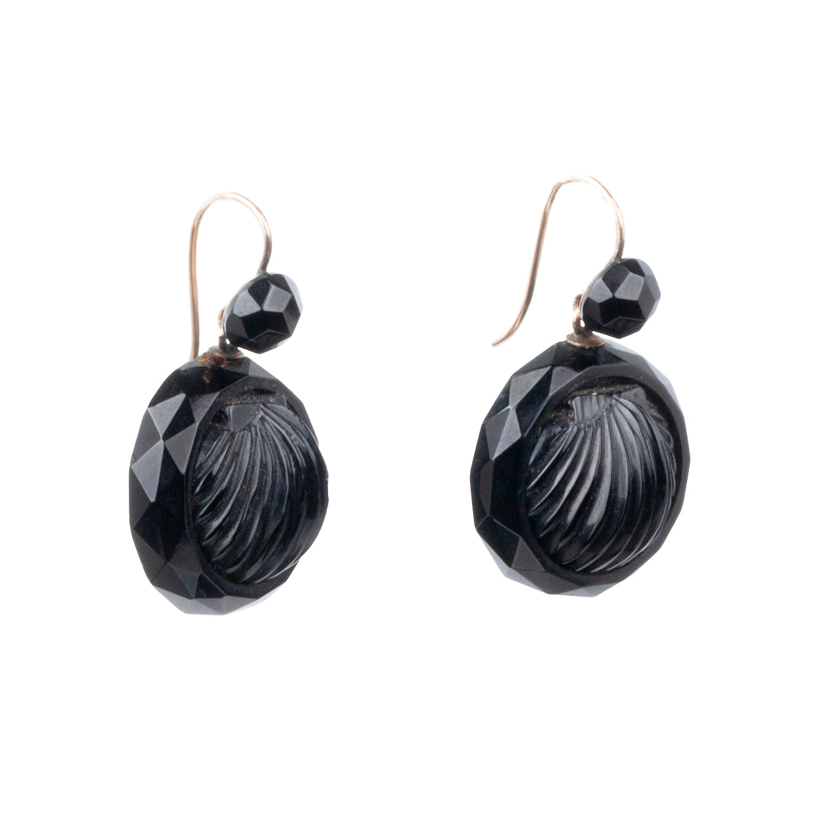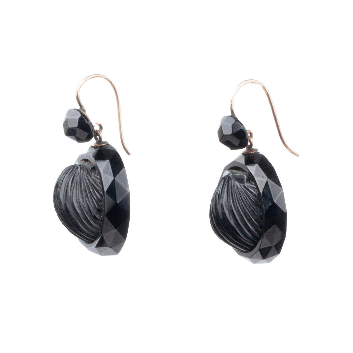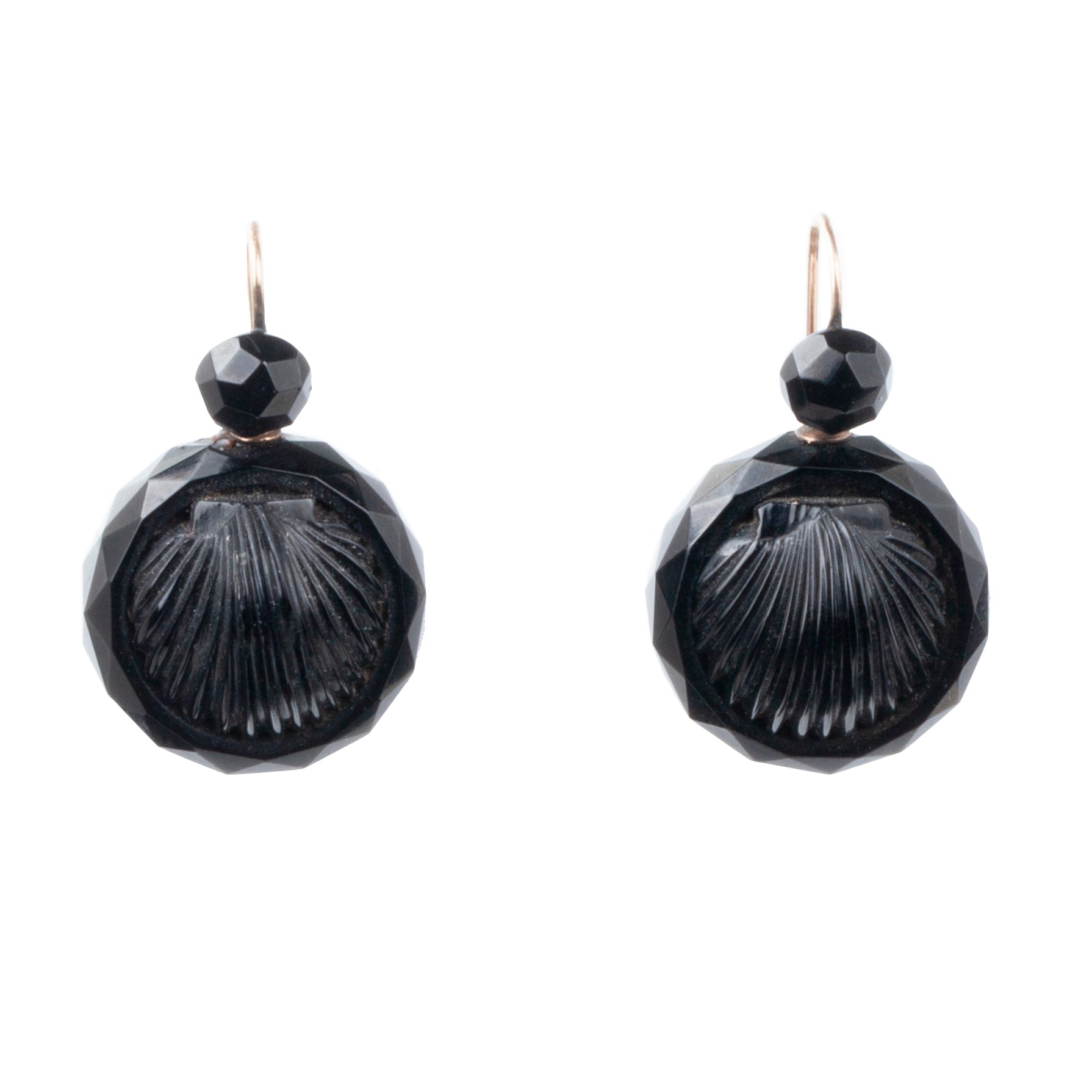 Victorian era jet earrings. Hand-carved in the form of a scallop shell. Very light in weight and easily worn. Circa 1860, English in Origin.