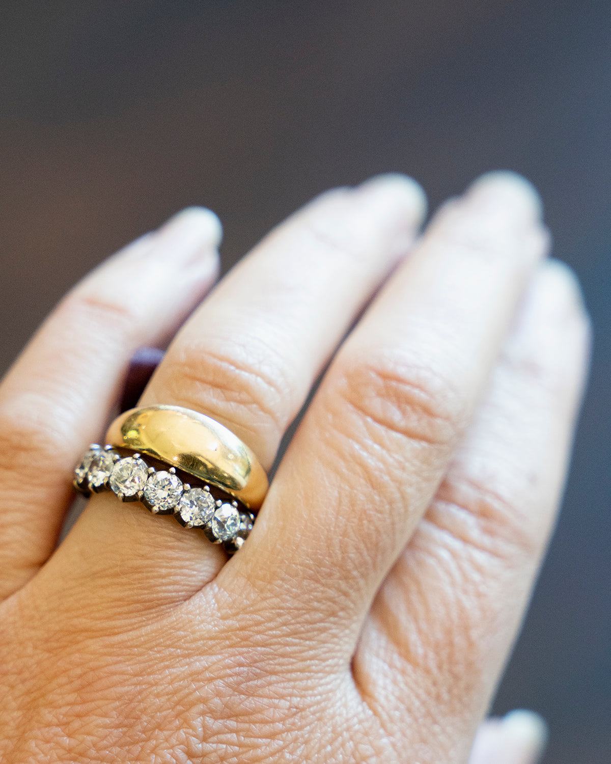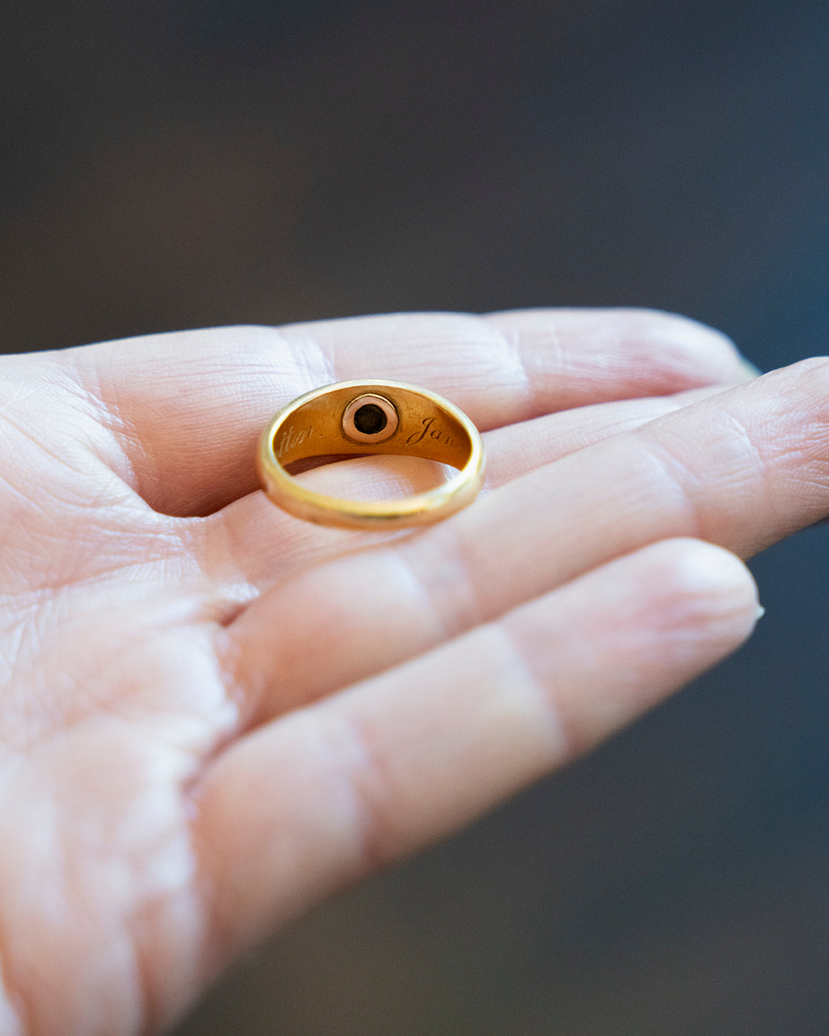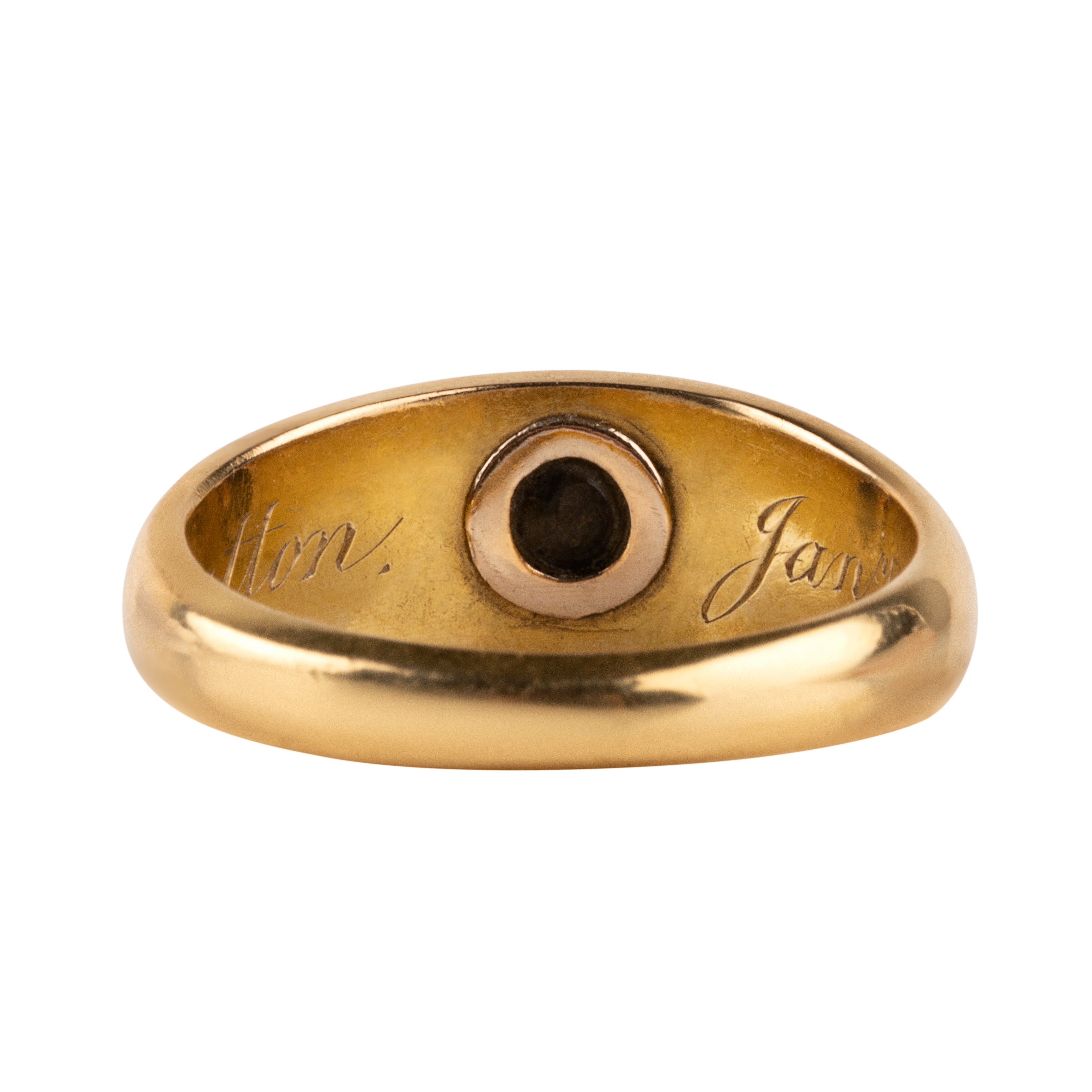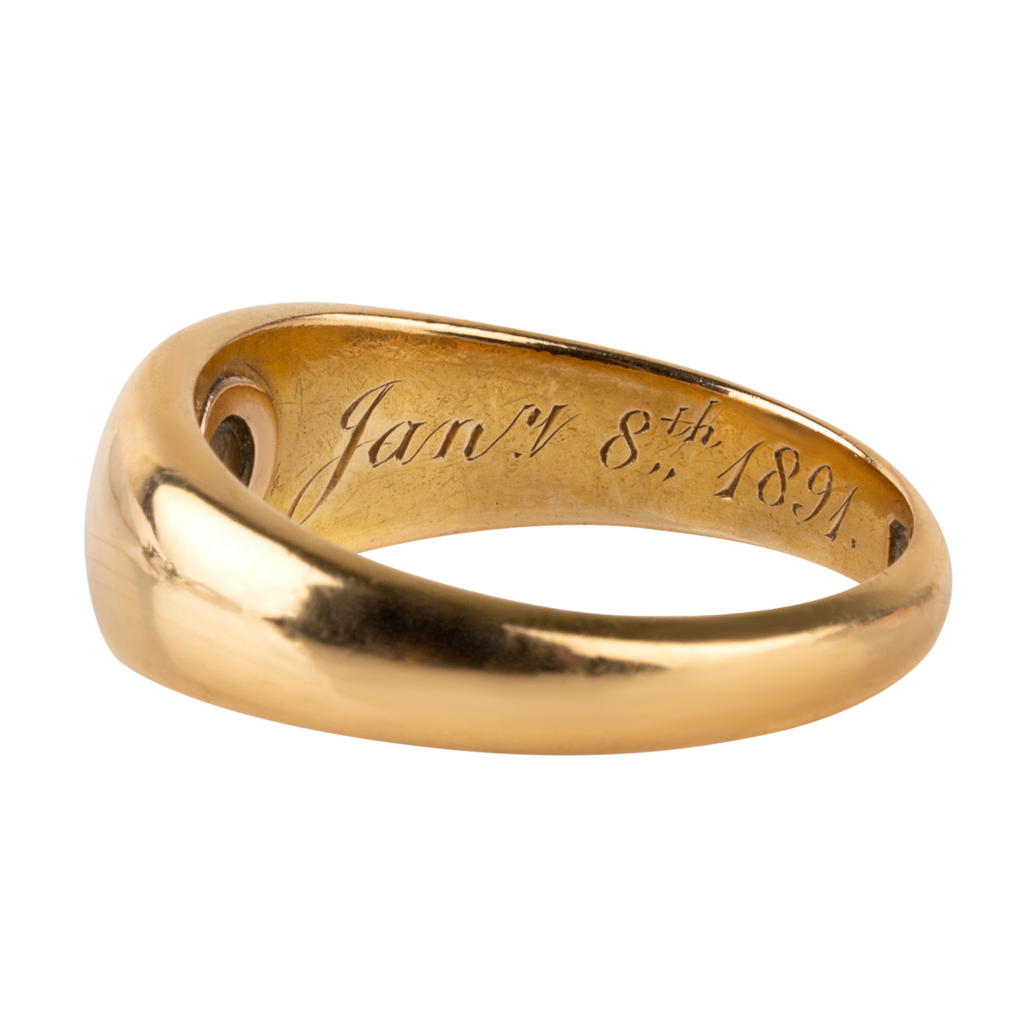 Victorian era ring with hidden locket compartment, in 22k gold. Engraved “January 8 1891”. The ring has a hollow construction to accommodate the tiny locket compartment. England, 1891.