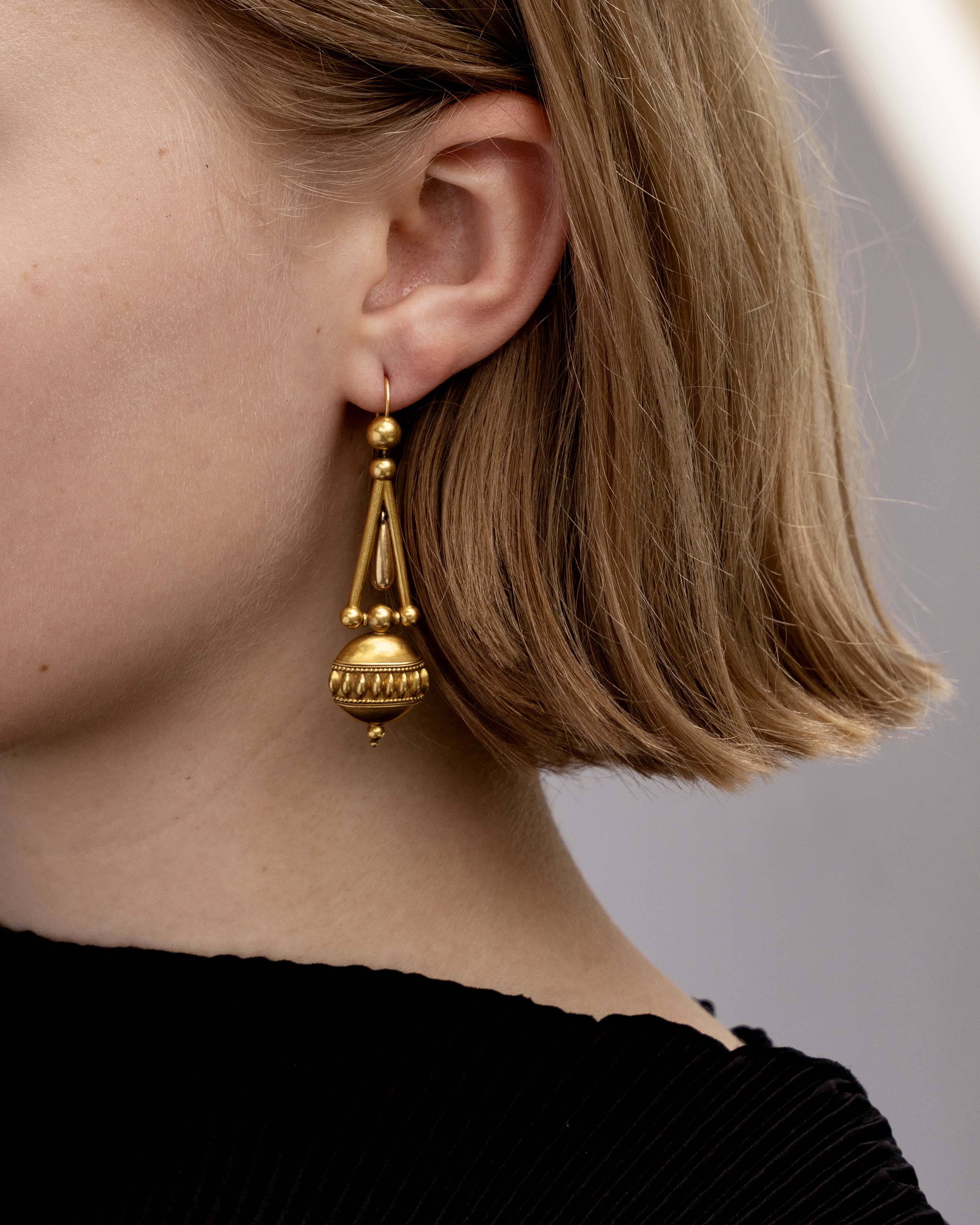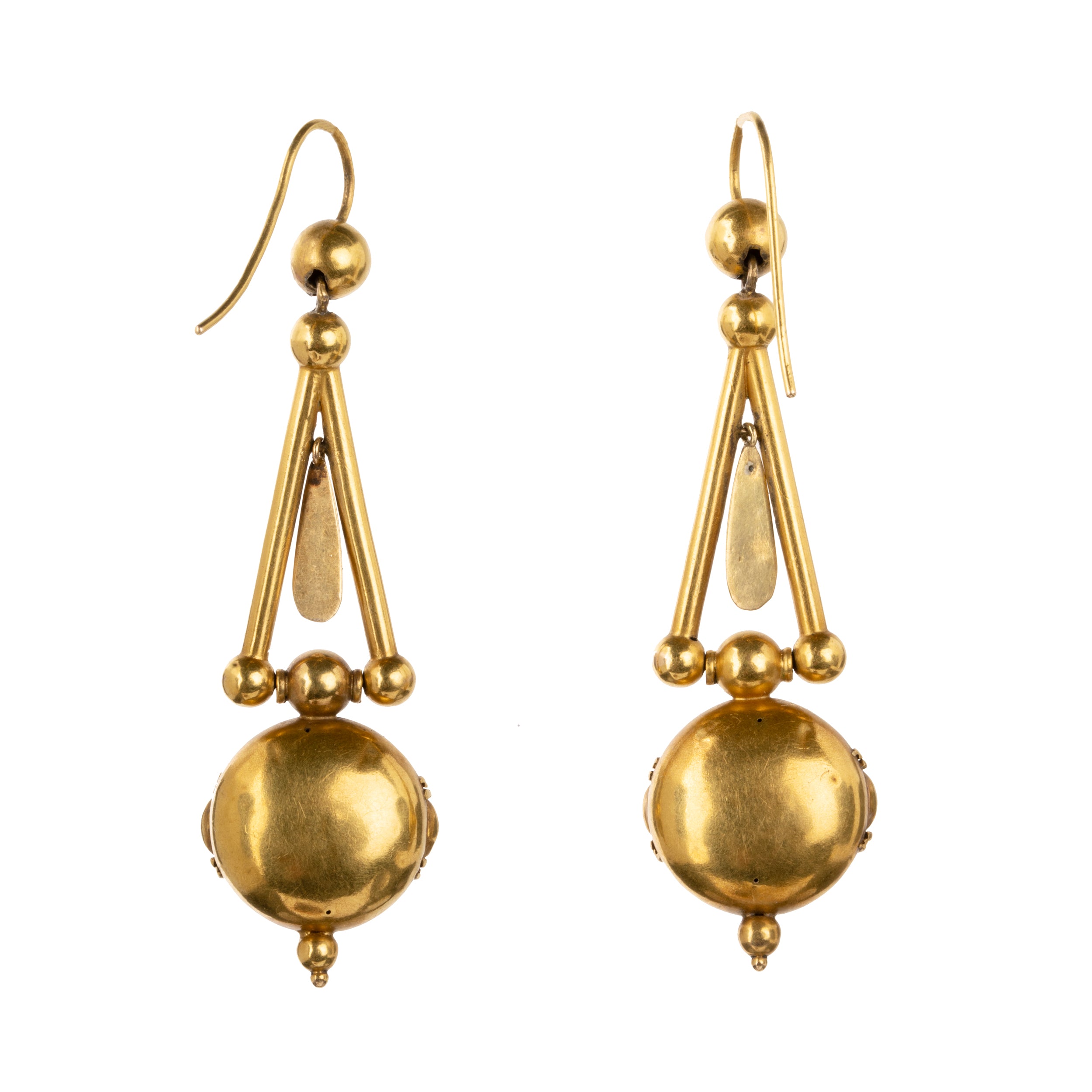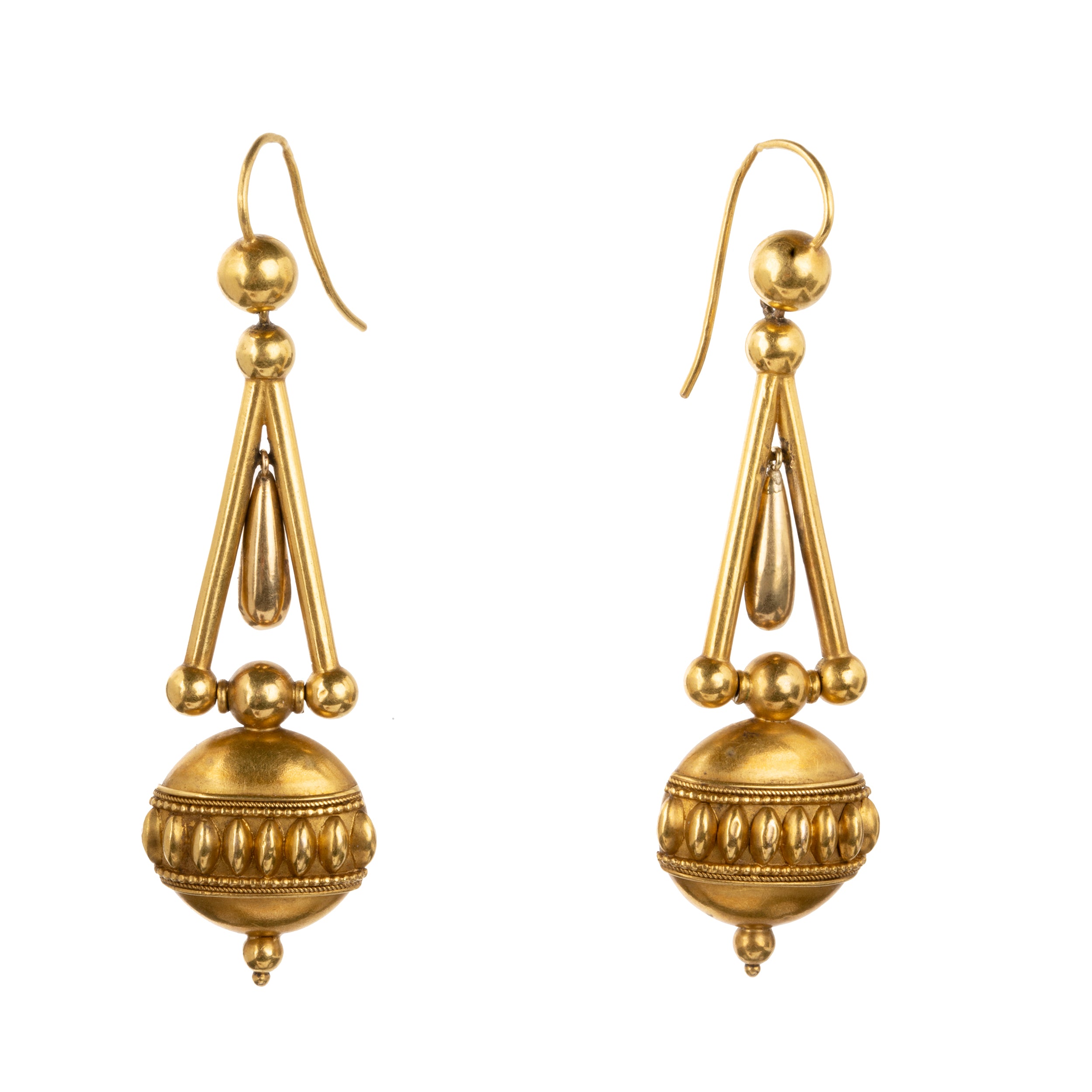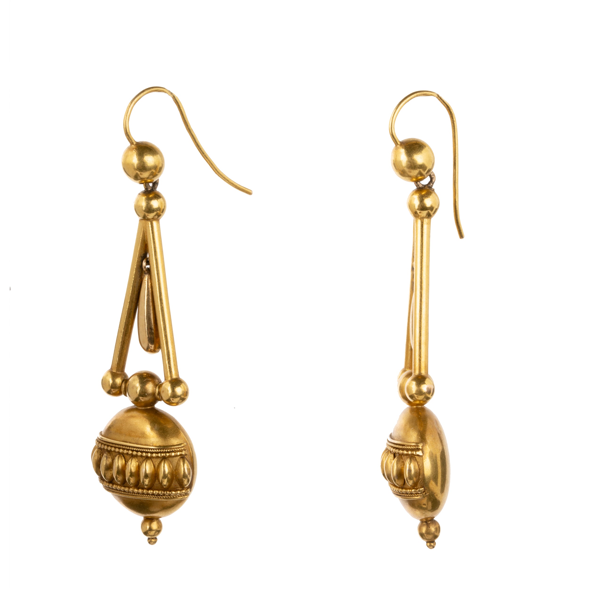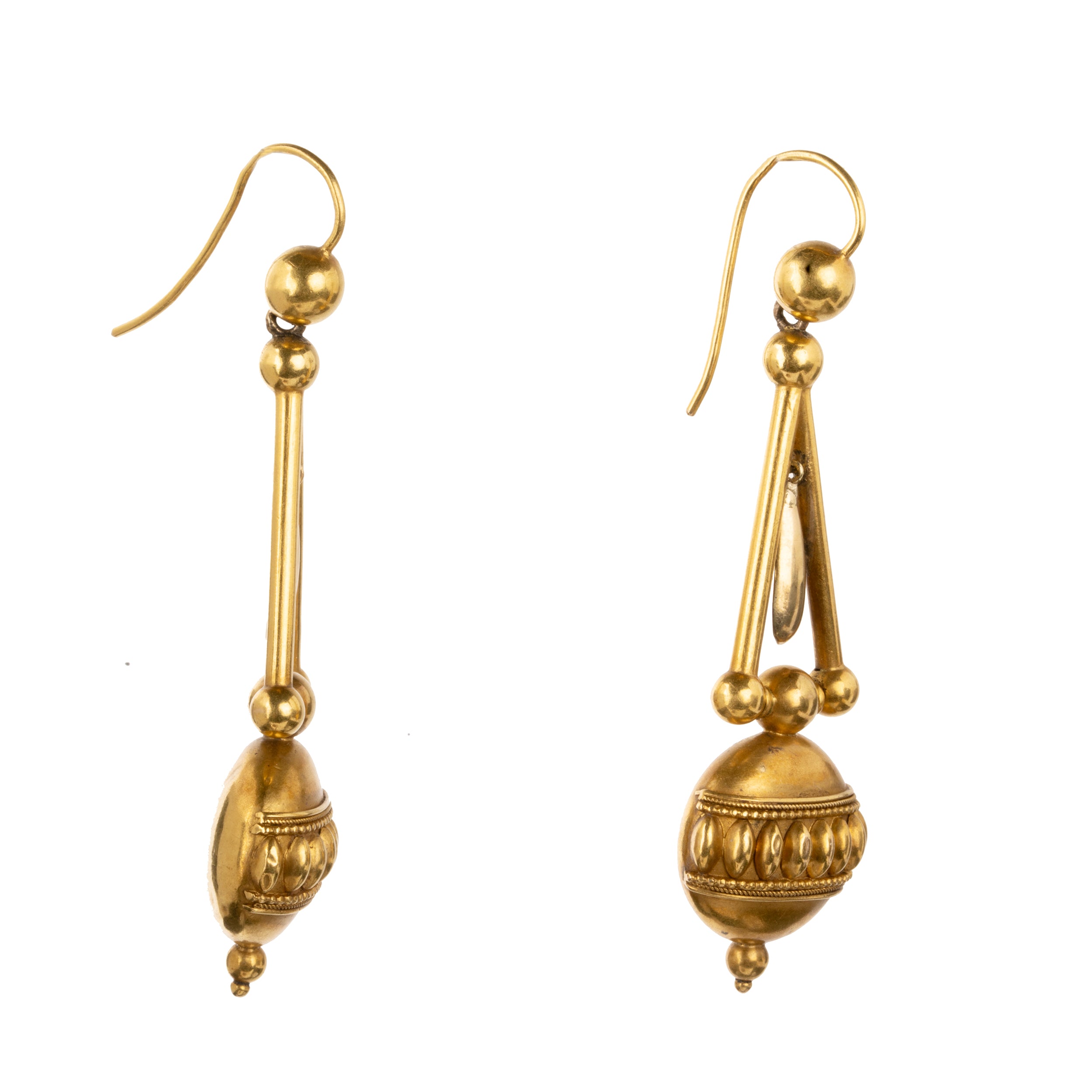 15k Gold earrings with a well-preserved bloomed finish. A well-made example featuring Etruscan revival design details and several moving elements. Lightweight and easy to wear. England, circa 1870.