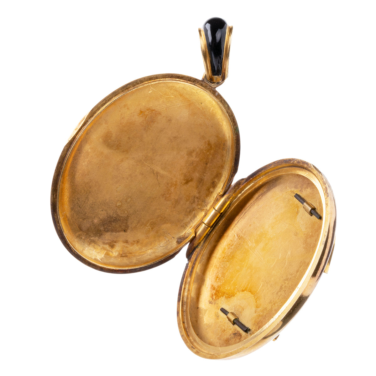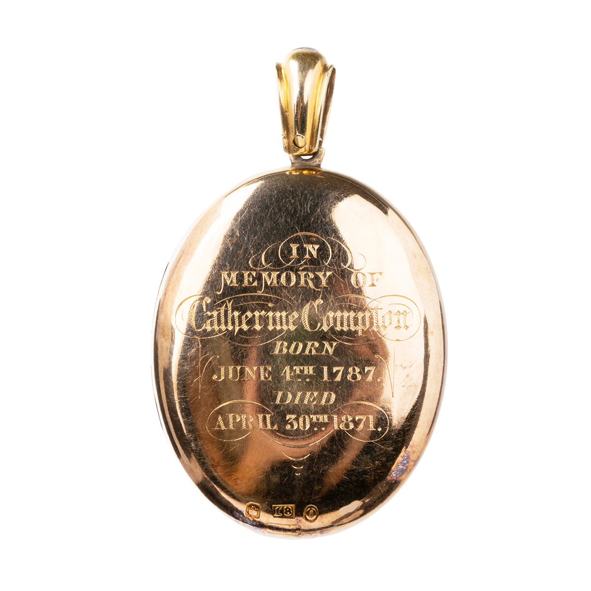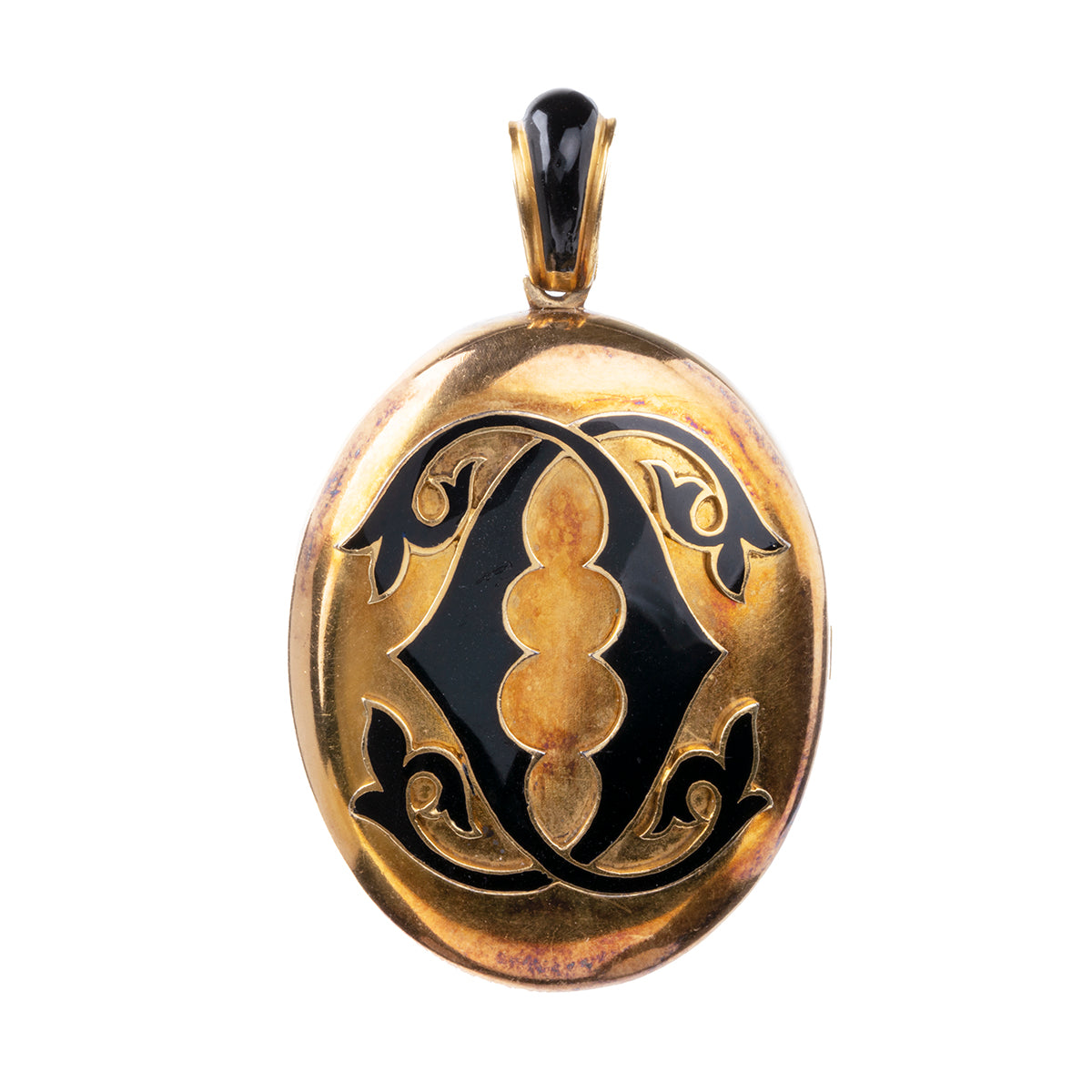 Victorian era black enamel and gold locket. Bold monogram "CC" in black enamel and 18k Gold. Detailed hand engraving on the backside, 'IN MEMORY OF CATHERINE COMPTON BORN JUNE 4TH 1787. DIED APRIL 30TH 1871.'. The glass and frames are missing but personal photos can still be added. English in origin. Found in Amsterdam. Circa 1871.