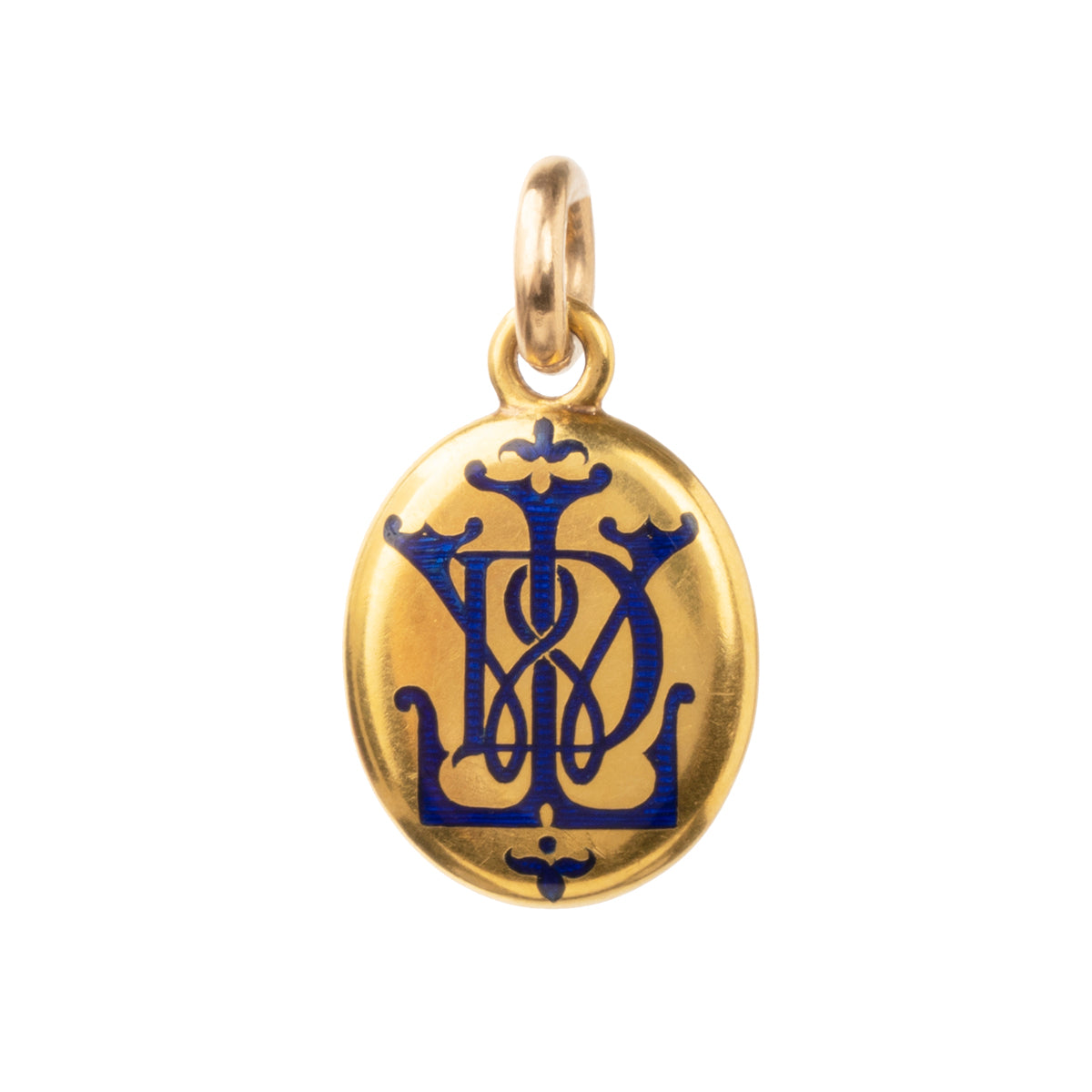 Victorian era monogram locket, in 18k gold. Blue enamel "WDL" monogram details. English in origin. Circa 1860.