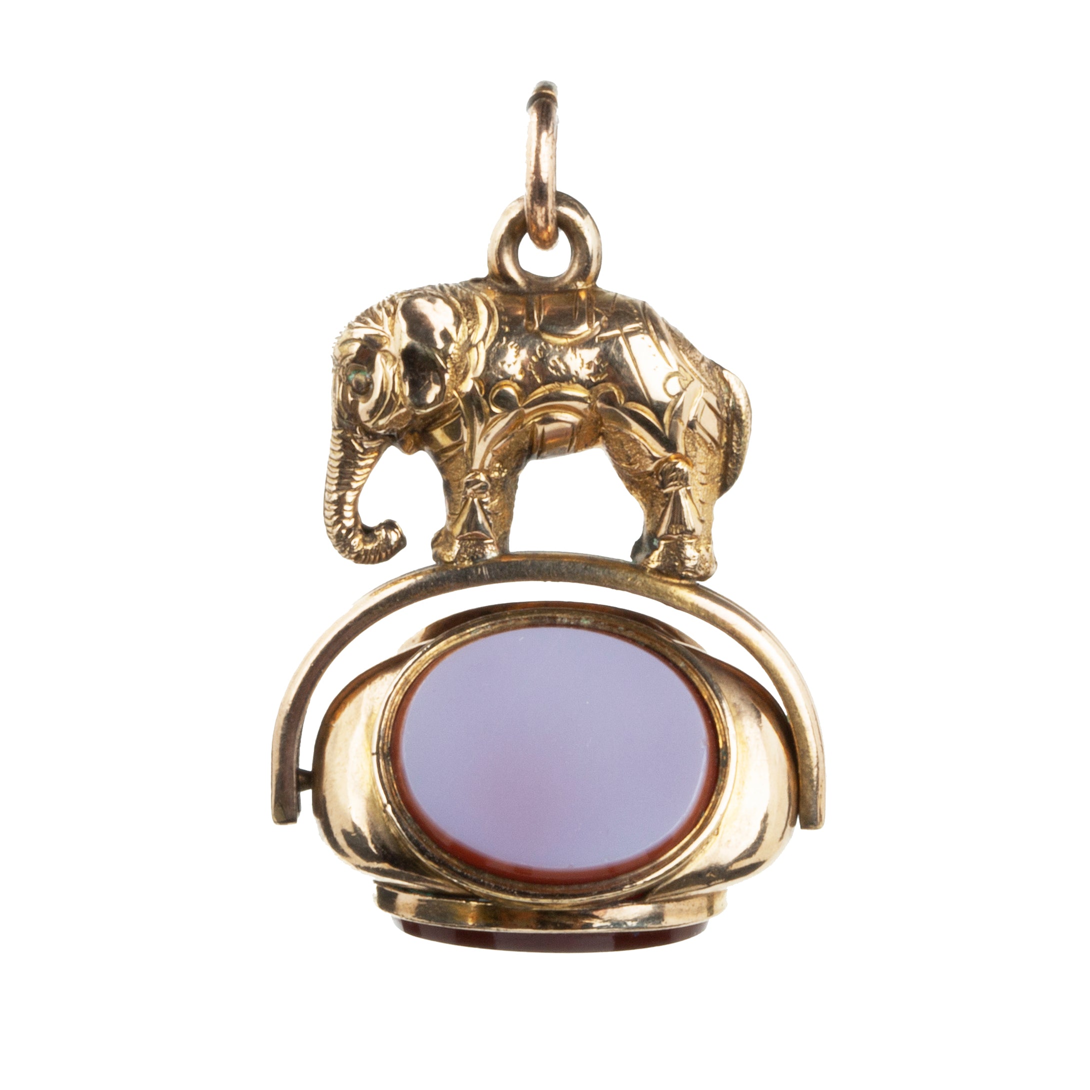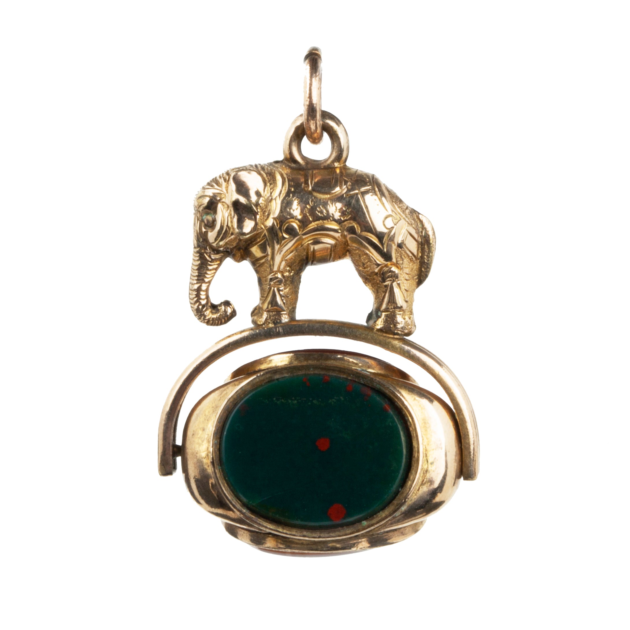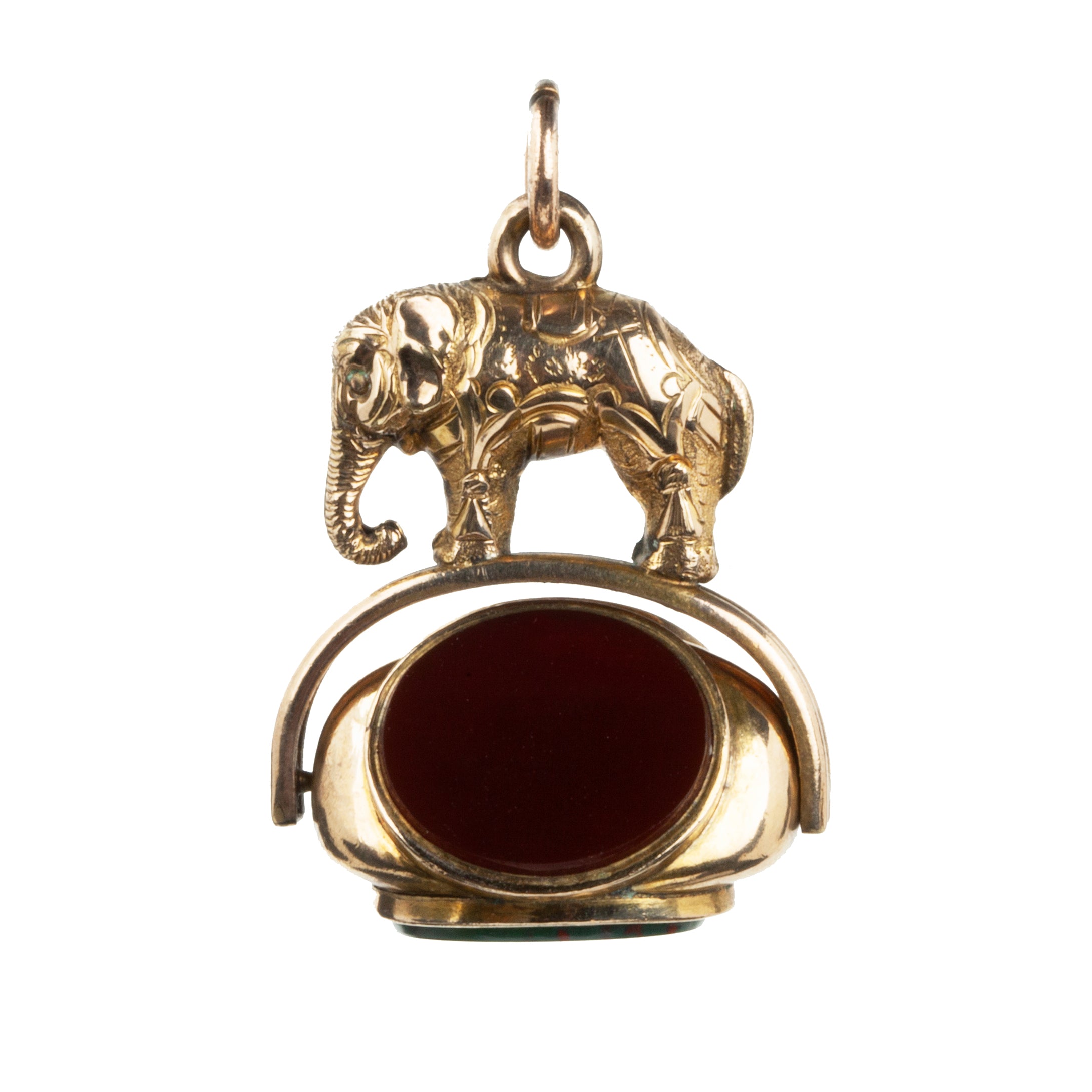 Victorian era spinning multi-stone and Elephant watch fob, in 9k gold. The three-sided spinning fob features, agate, bloodstone, and carnelian. English in origin. Circa 1880.