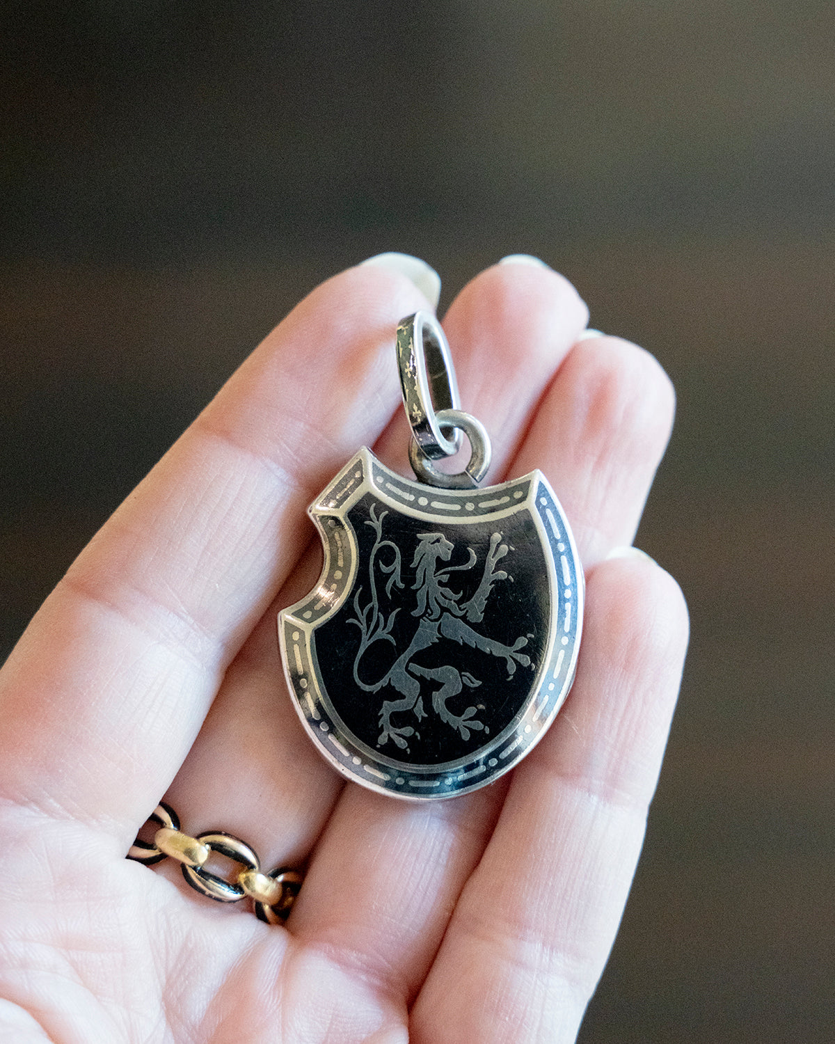 Victorian era niello locket with intricate details. An unusual shield shape reminiscent of a horseshoe depicts a royal rampant lion with a fleur-de-lis pattern on the verso. Additional minuscule fleur de lis wrap around the bale. Neillo is a process similar to enameling where a black alloy is inlayed into the silver. It opens to reveal two glass-glazed compartments for photographs or keepsakes. Continental European. Circa 1890.
