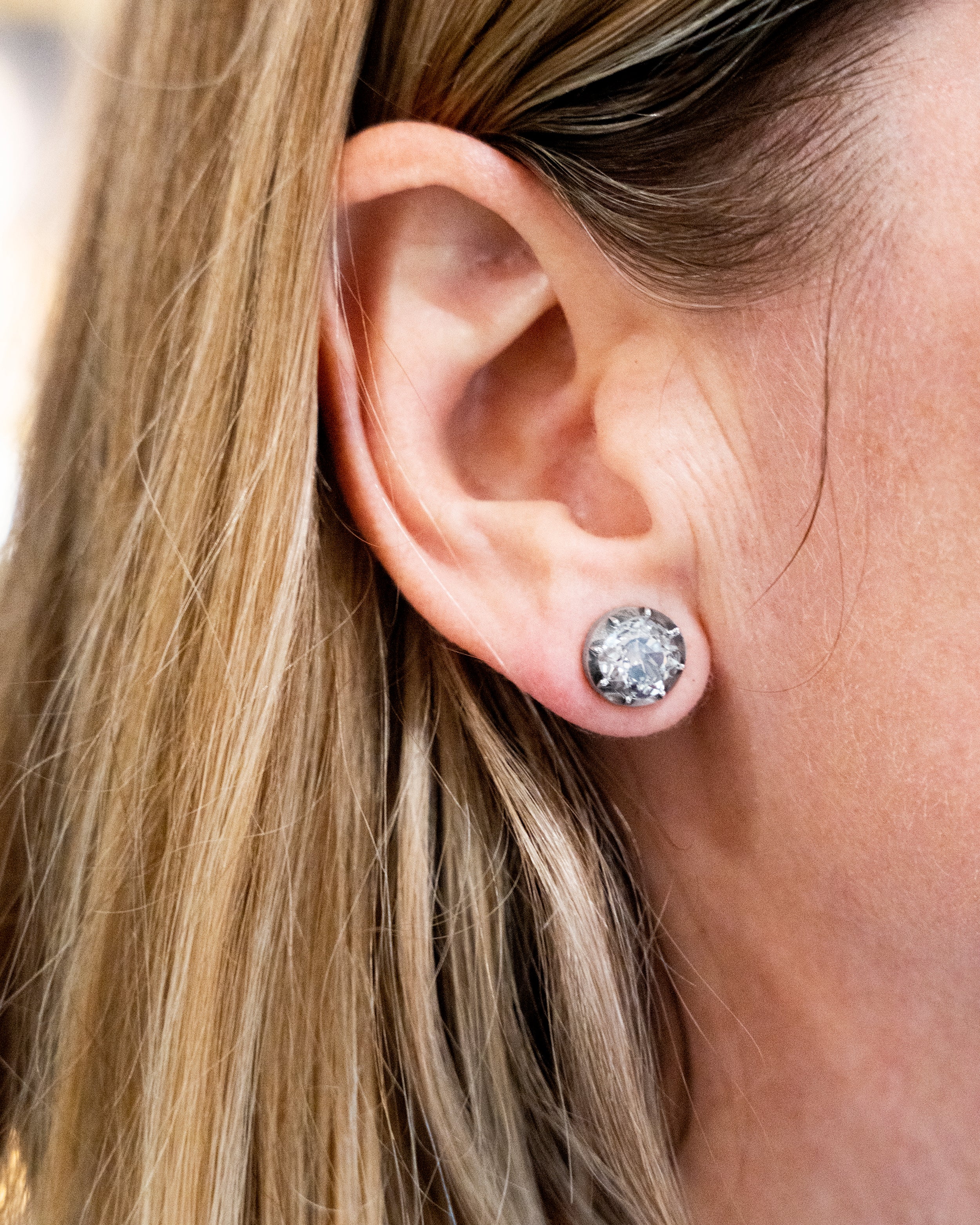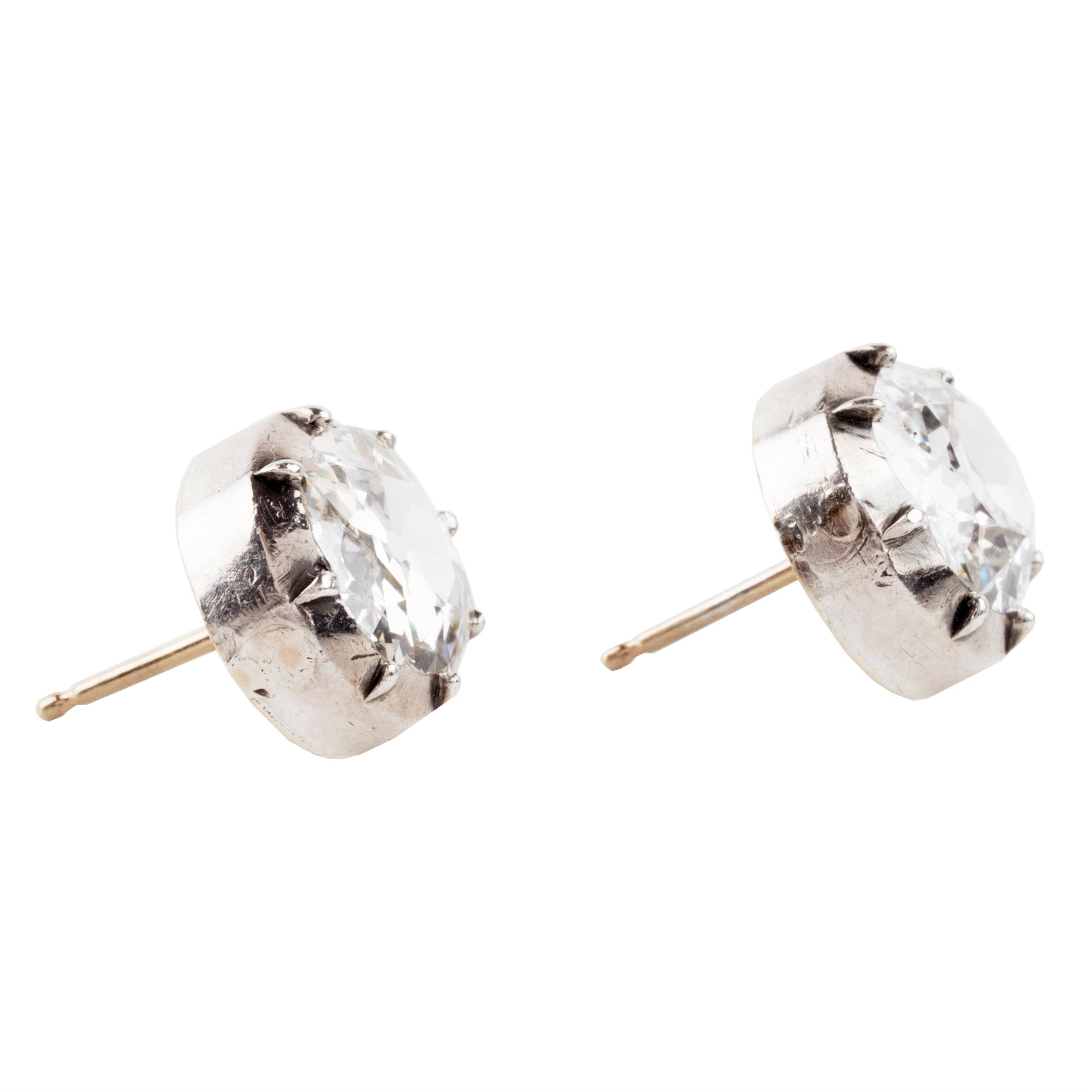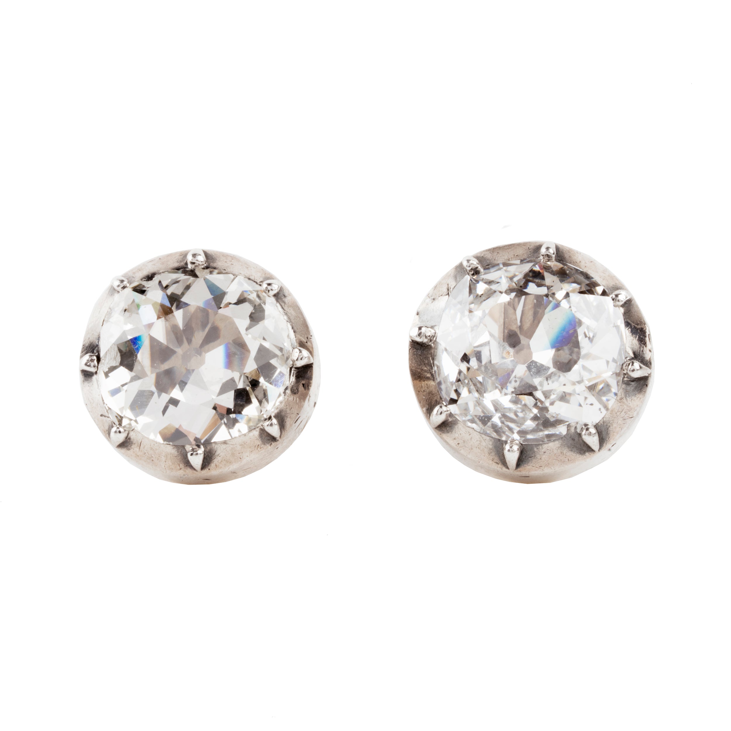 These earrings were originally part of a larger piece of jewelry from the 1860's, likely a diamond rivère necklace. Each stone is set in silver on gold cutaway settings. The stones are approximately 1.2 carats each but face-up more like 2.5 carat stones and I/J color and SI1 clarity. The crystal is quite flat showing most of its weight on the face. English in origin. Circa 1860.