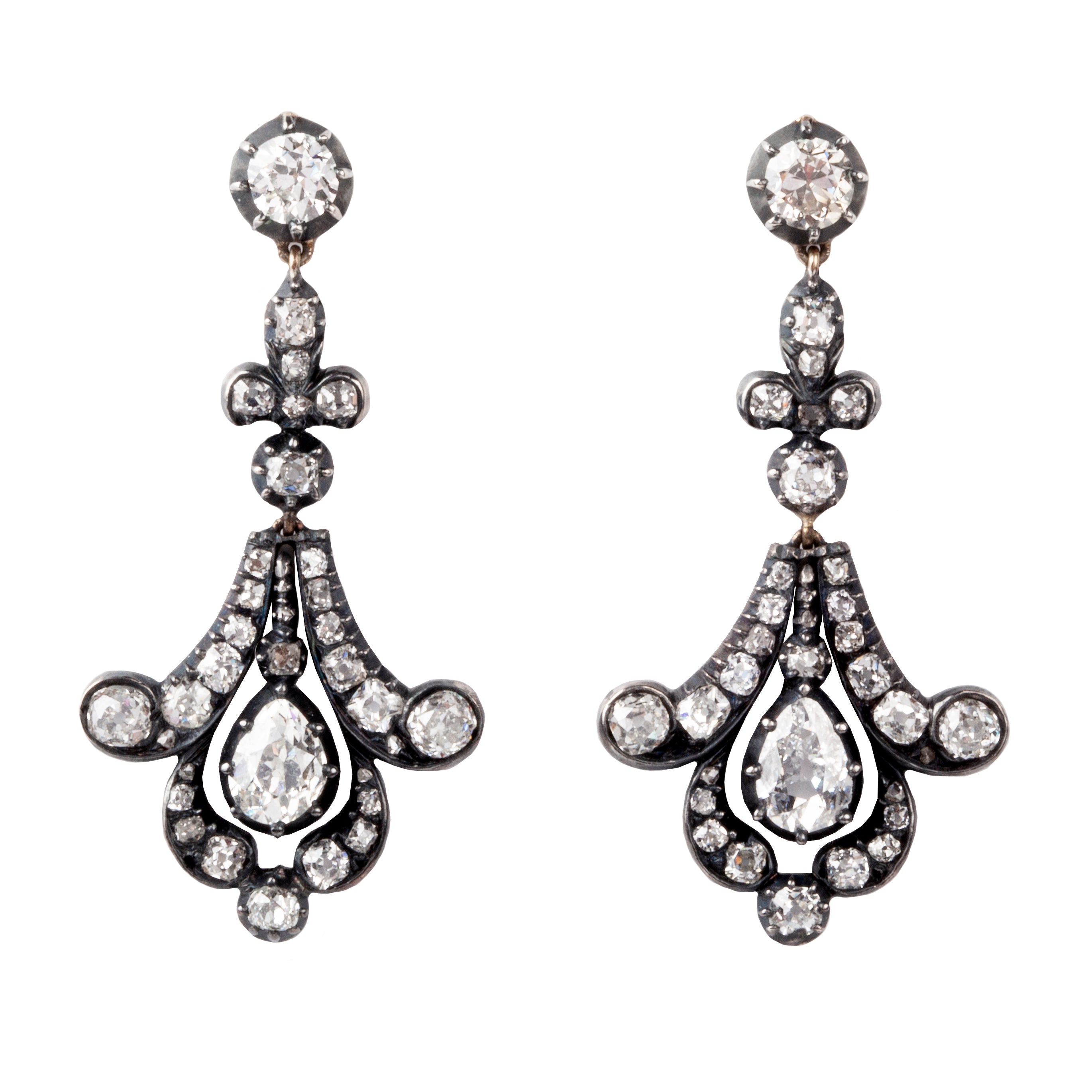 19th century old mine cut diamond pendant earrings, set in silver topped gold with cut down settings. Center pear shaped diamond drops and old mine cut diamods are bright and eye clean. The design elements are hinged and have wonderful movement when worn. Beautiful dark patina. English in origin. Circa 1870.