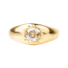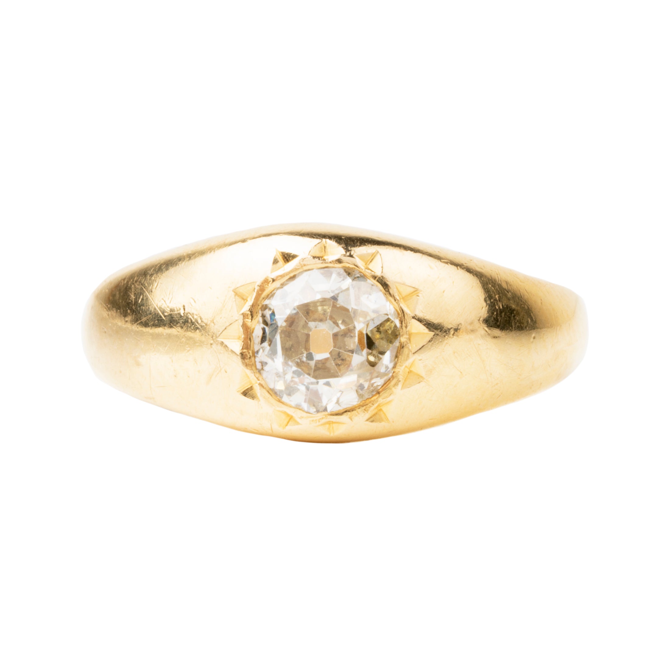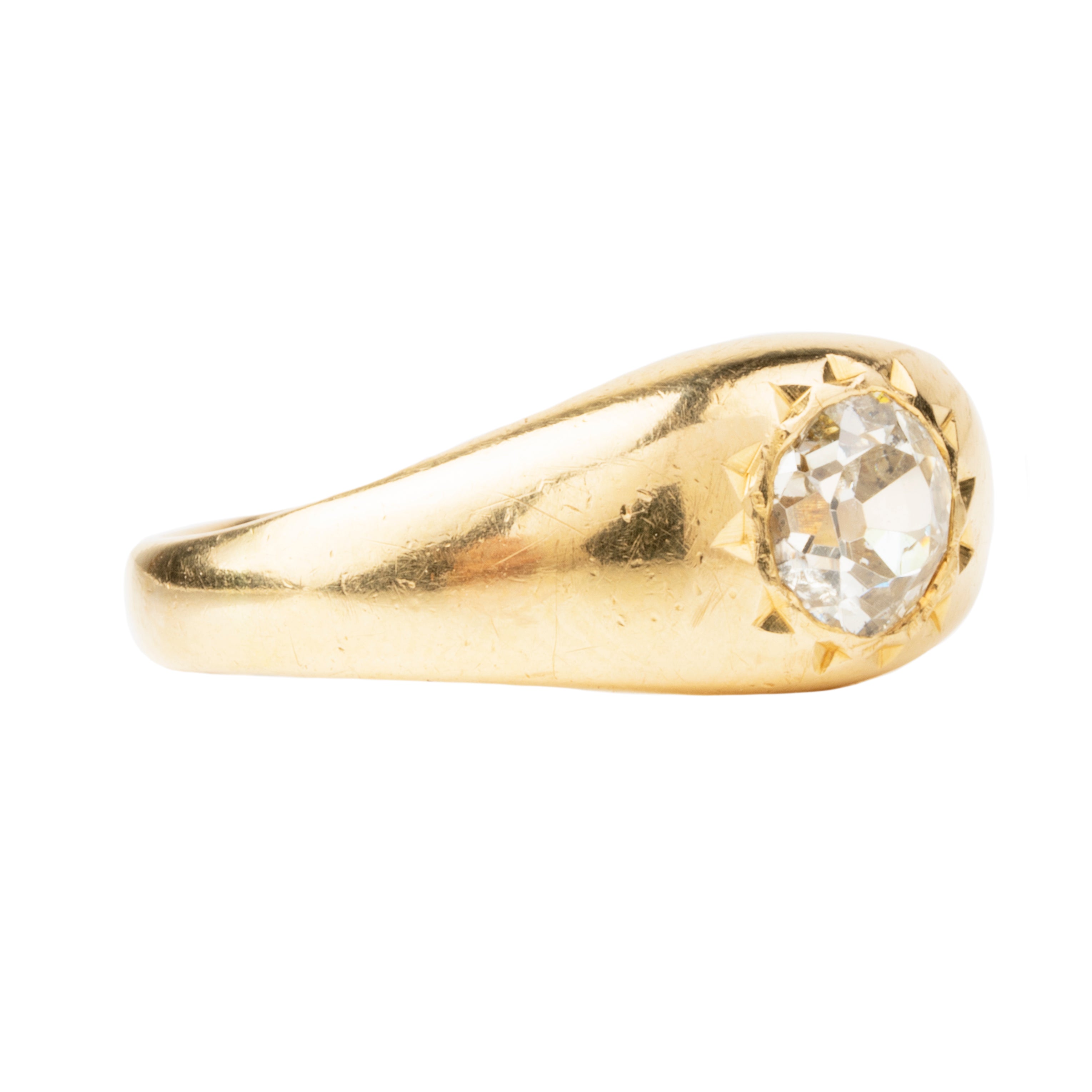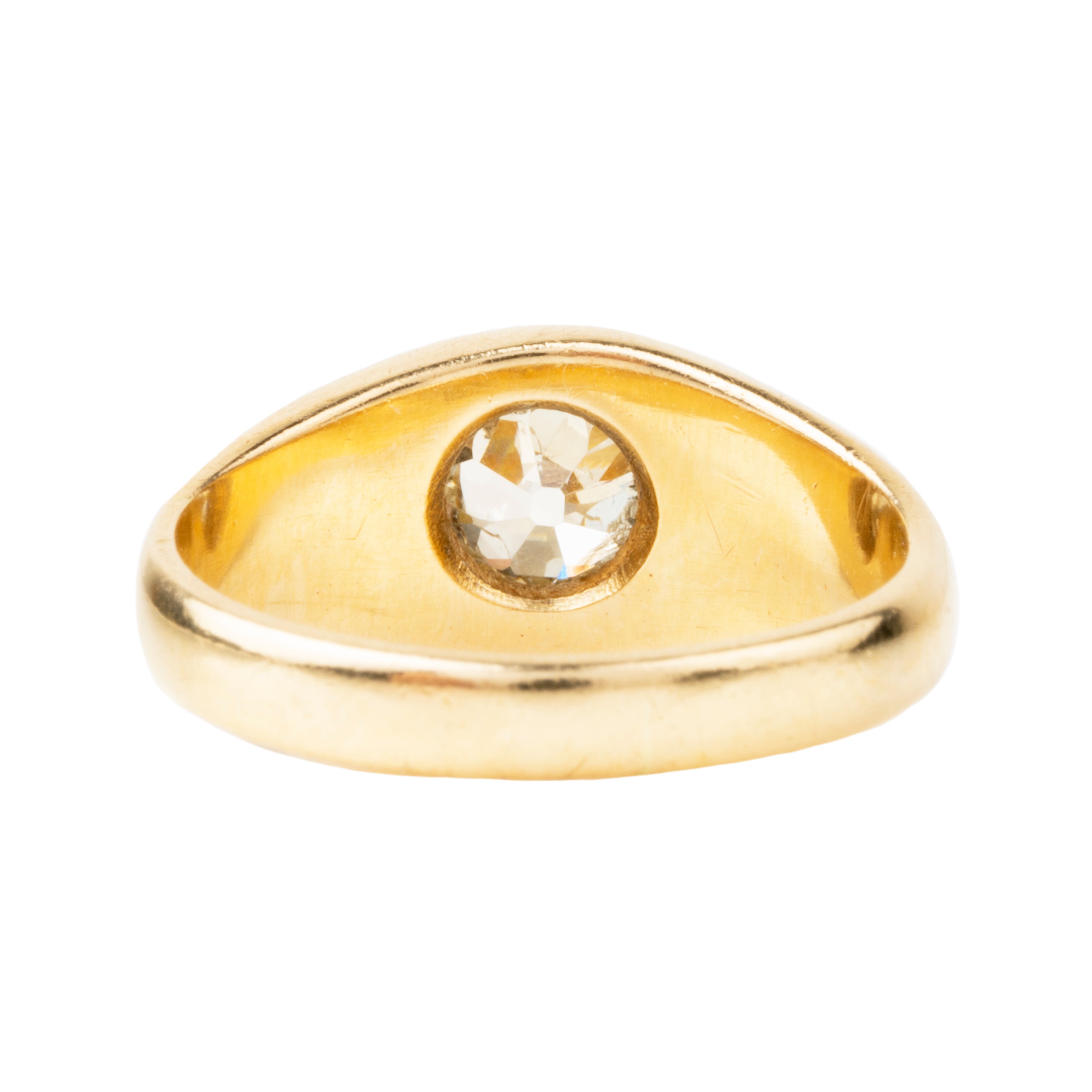 Heavy Victorian era flush set old mine cut diamond ring, in 18kct yellow gold. Approximately 0.75 carat old mine cut diamond, K color, and SI2 clarity. English in origin. Circa 1890.