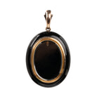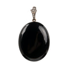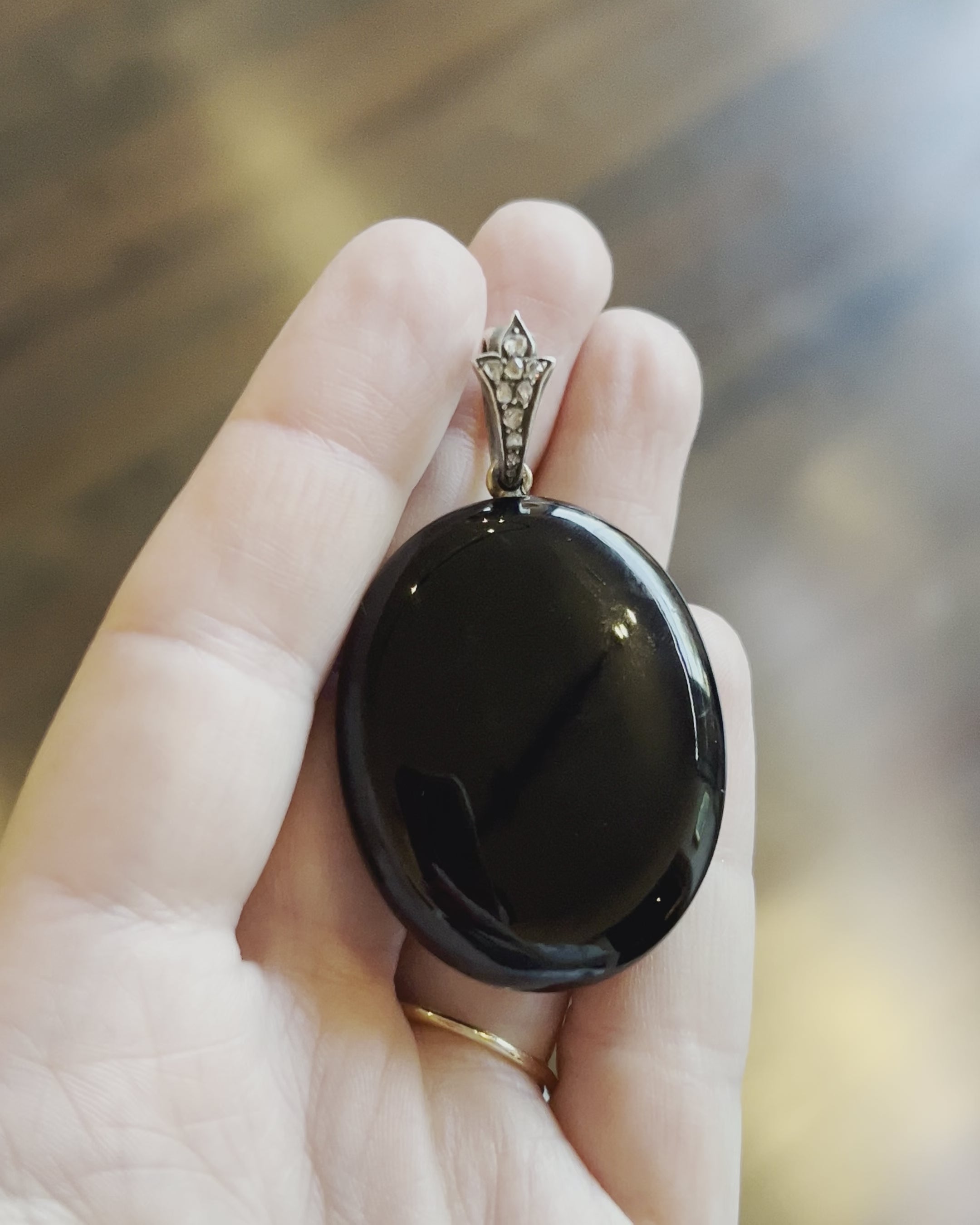 Simple black onyx carved and polished into a locket. Accented with rose cut diamonds set in silver. There is a hinged glass compartment on the reverse to hold a keepsake. English in origin. Circa 1870.